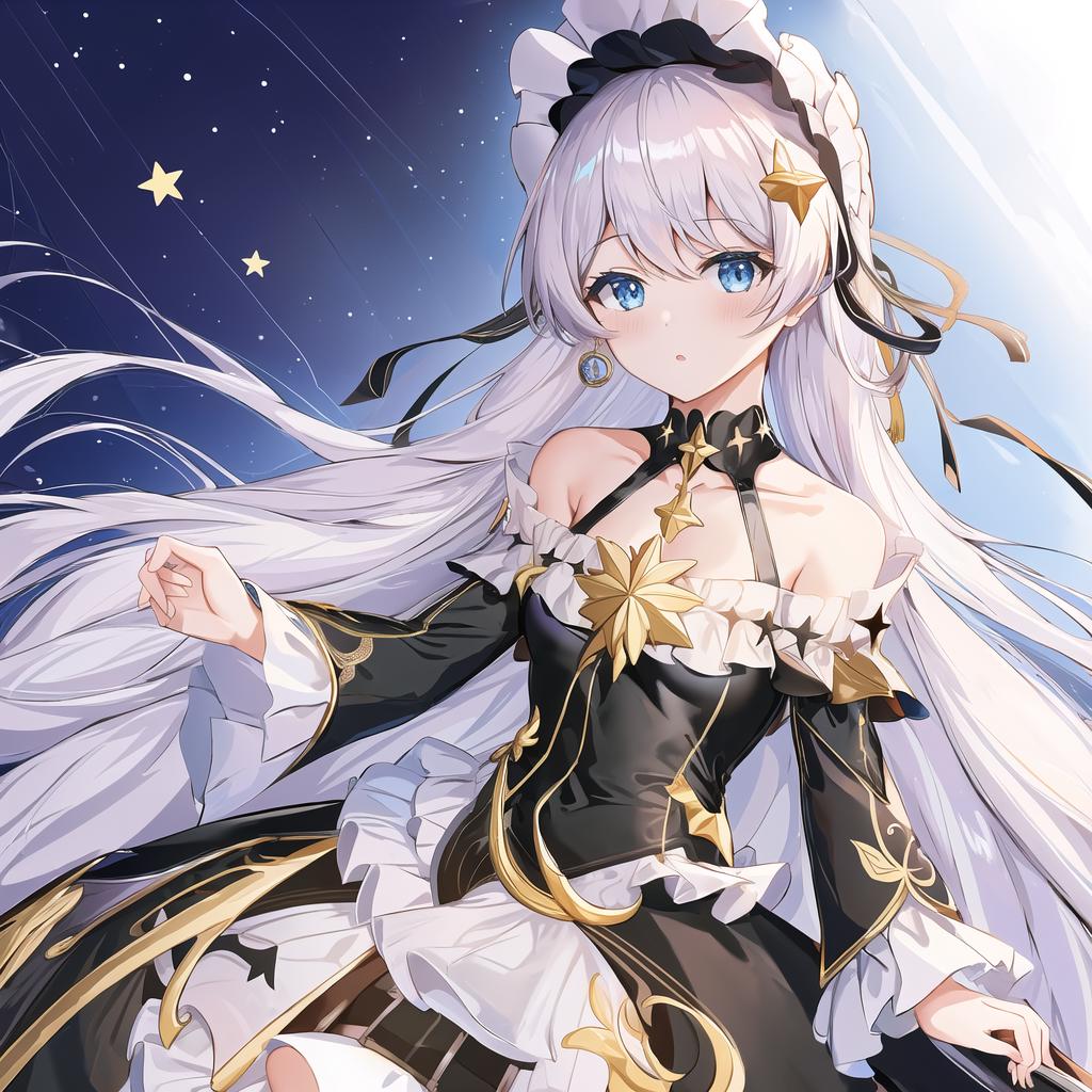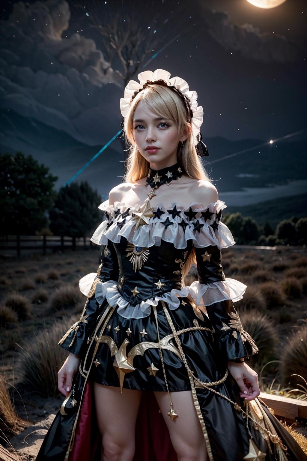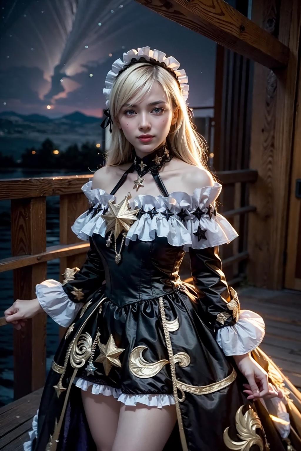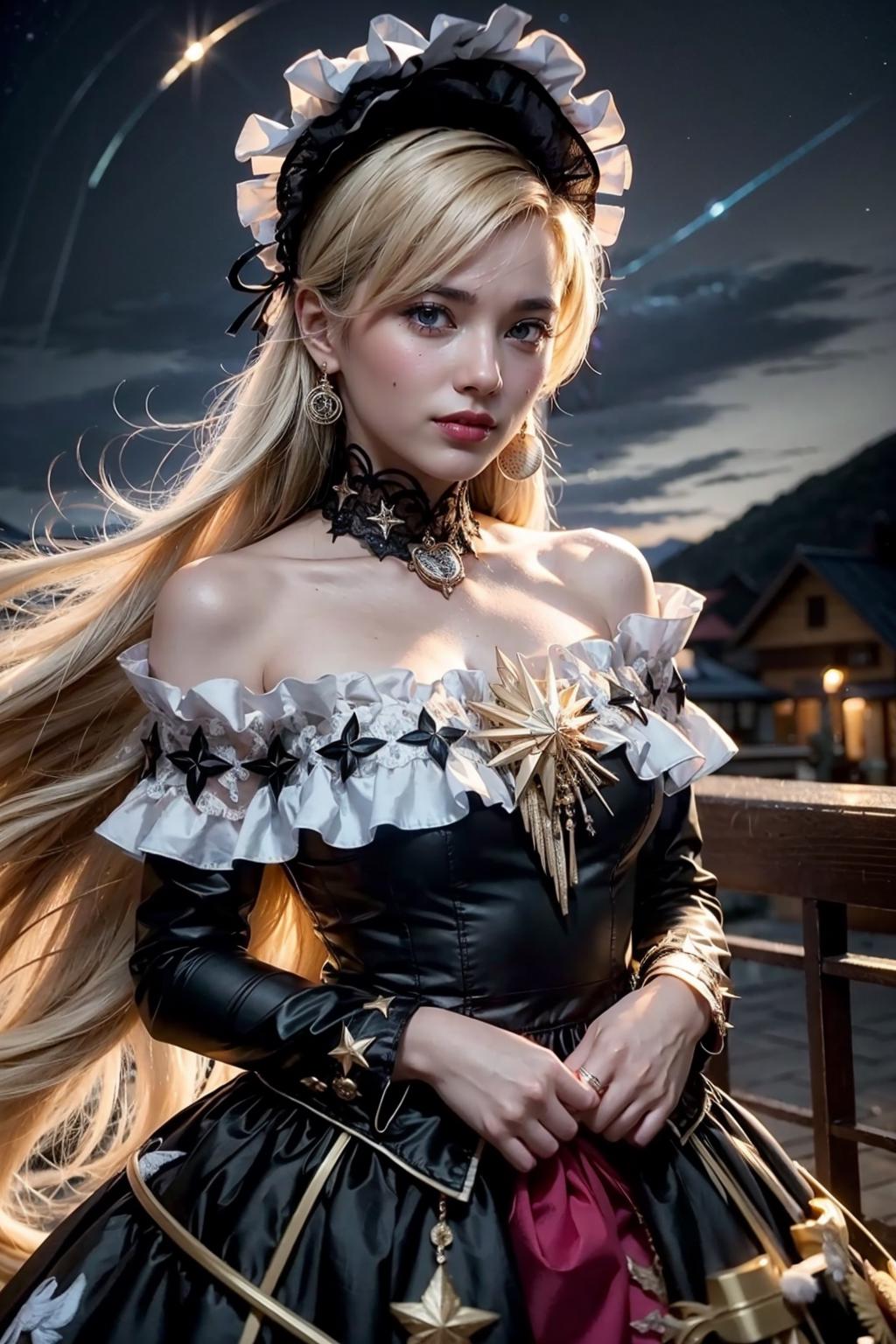 (masterpiece:1.2), (best quality:1.3), empyrean_psalms, 1girl, black_dress, frilled_dress, off-shoulder_dress, bare_shoulders, long_sleeves, star_(symbol), lolita_fashion, <lora:_empyrean_psalms_v1-046:1>