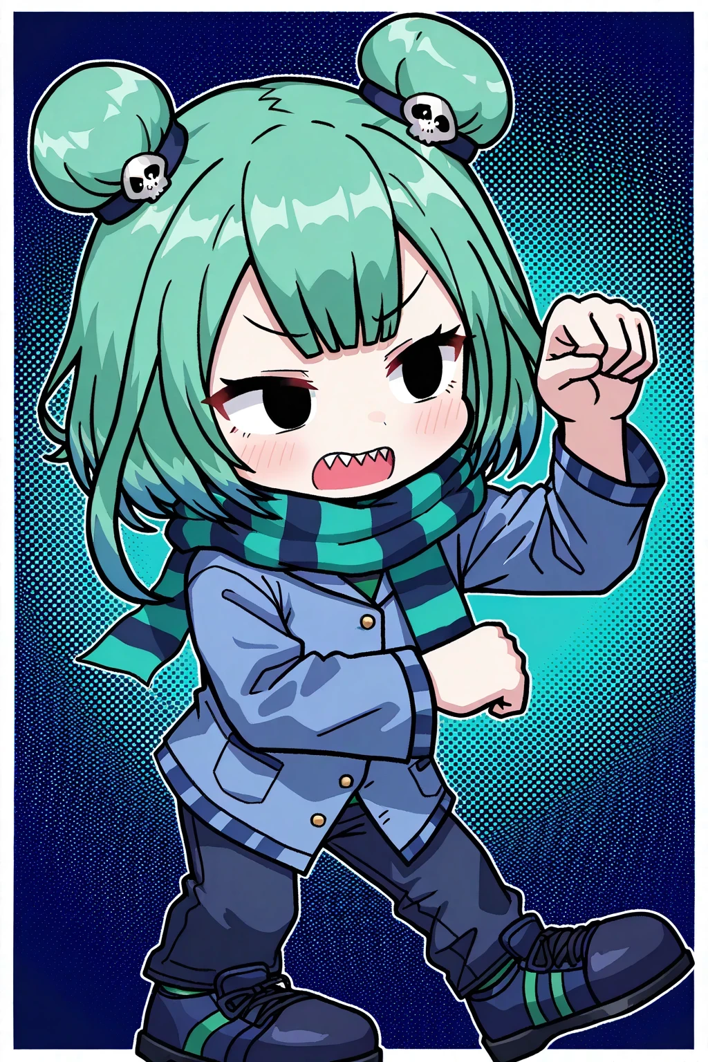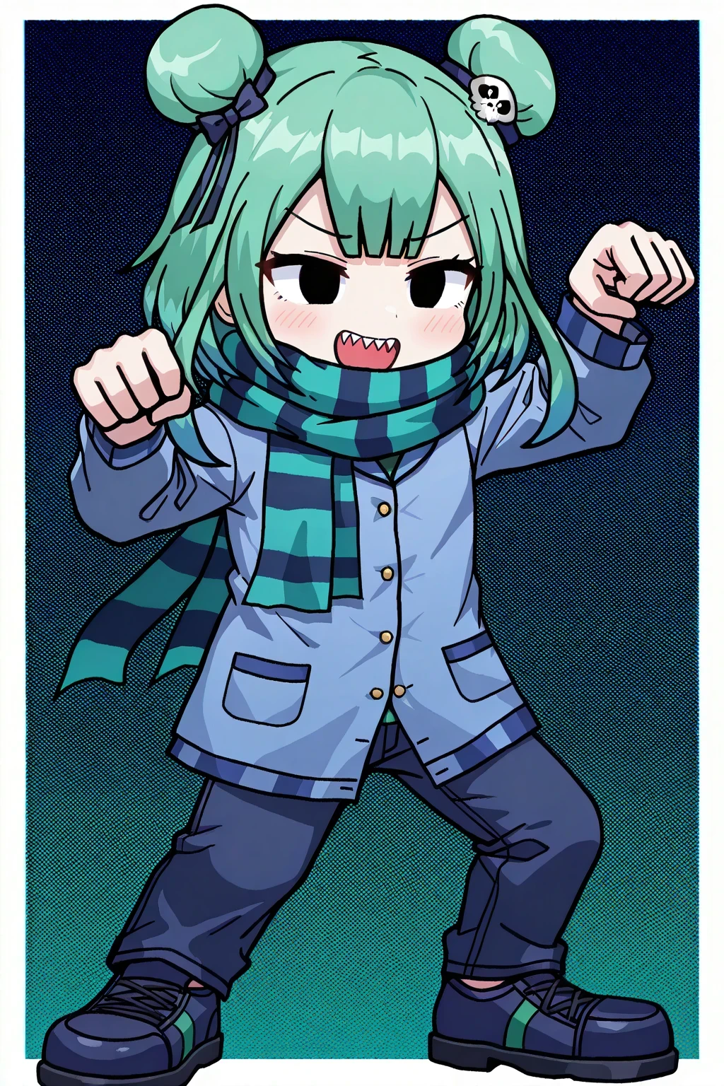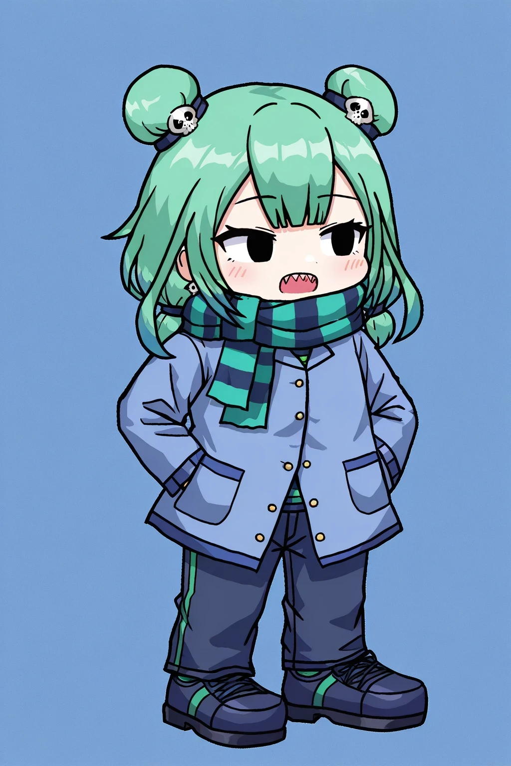 UruhaRushiaFNFHF, 1girl, short green-blue hair with two bun-buns, bluish-black skull hair tie, blue hoodie with gold buttons, green-dark blue scarf, dark blue jeans with a green stripe, dark blue shoes, sharp teeth, black eyes, short, chibi, uruha rushia