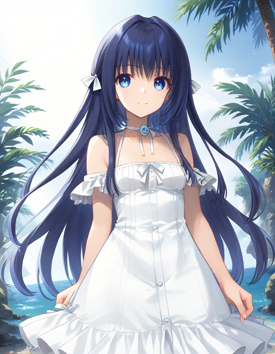 <lora:misaki:1.0>, very long hair, blue hair, blue eyes, hair ornament, white ribbon, dress, white dress,