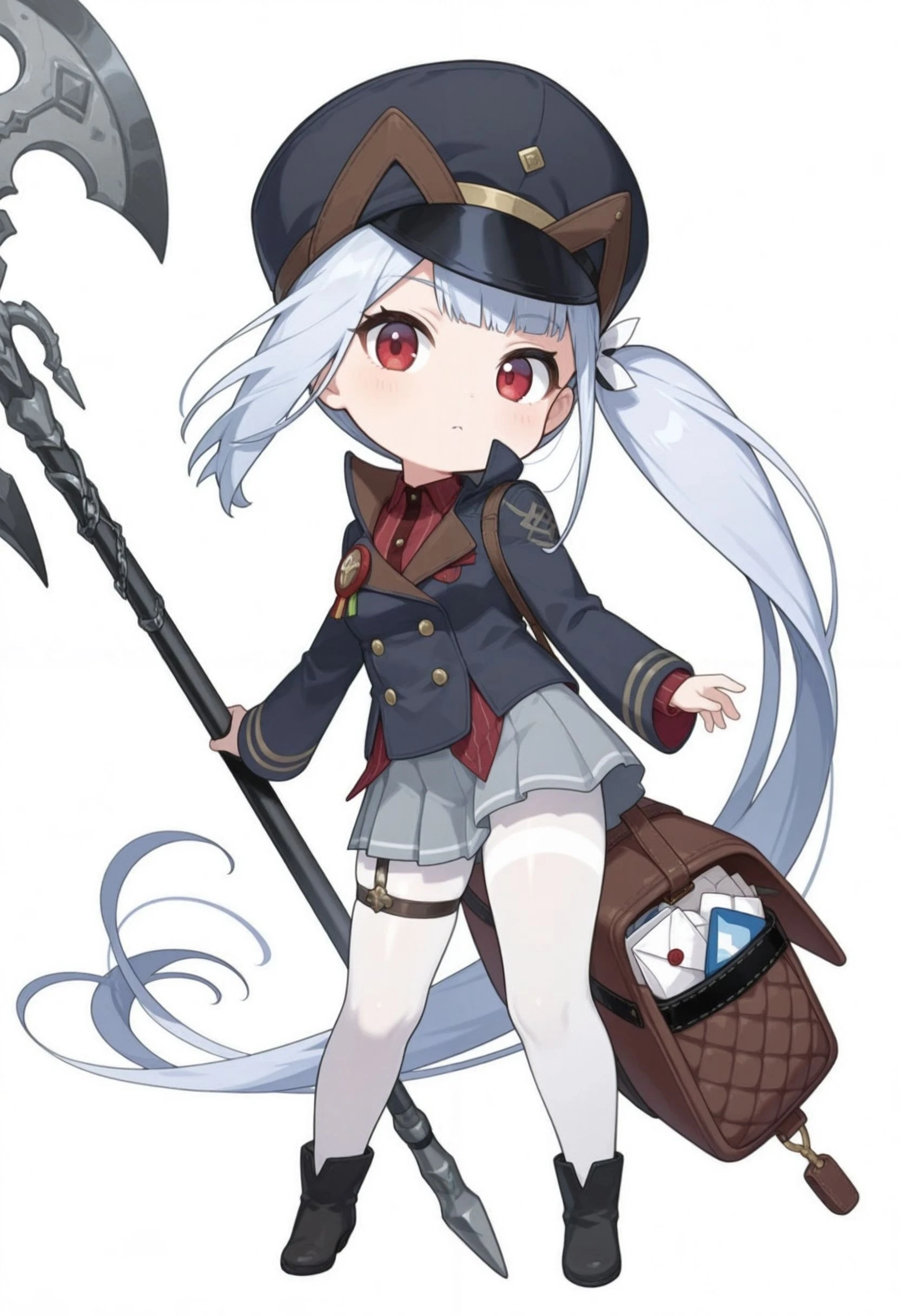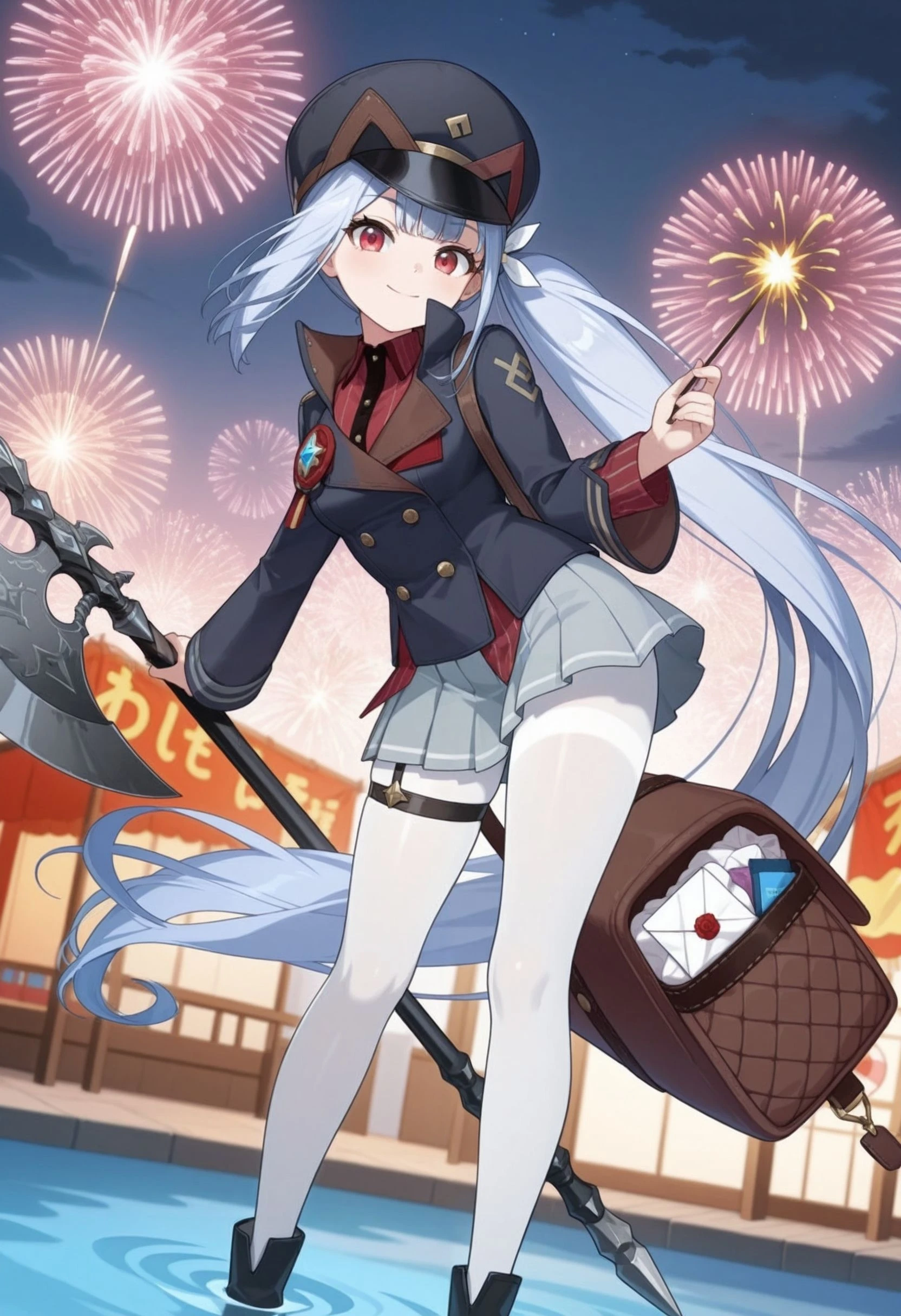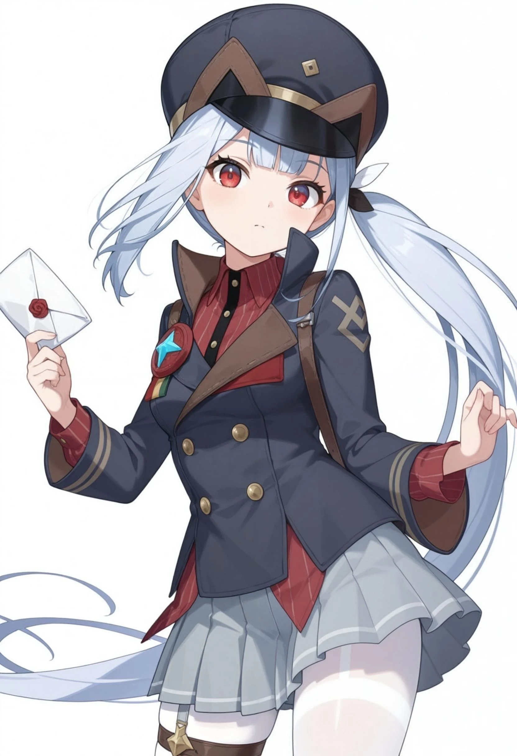 freesia_\(stella_sora\), stllsrfrs, absurdly long hair, black boots, black hat, black jacket, collared shirt, dress shirt, garter straps, grey hair, grey skirt, hat, jacket, long hair, long sleeves, miniskirt, pantyhose, pinstripe pattern, pinstripe shirt, pleated skirt, red eyes, red shirt, shirt, single garter strap, skirt, thigh strap, very long hair, white pantyhose, <lora:stella_sora_freesia_illustrious:0.8>