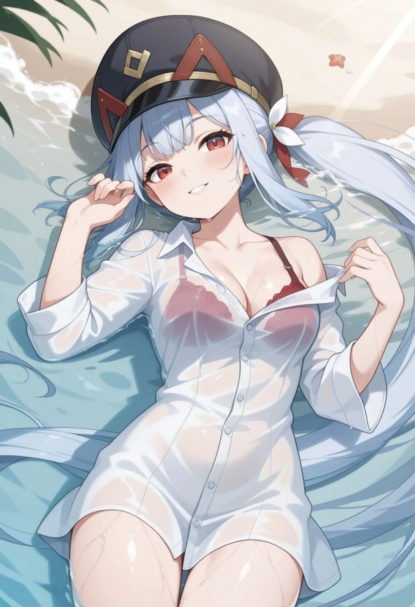 freesia_\(stella_sora\), stllsrfrs, absurdly long hair, black boots, black hat, black jacket, collared shirt, dress shirt, garter straps, grey hair, grey skirt, hat, jacket, long hair, long sleeves, miniskirt, pantyhose, pinstripe pattern, pinstripe shirt, pleated skirt, red eyes, red shirt, shirt, single garter strap, skirt, thigh strap, very long hair, white pantyhose, <lora:stella_sora_freesia_illustrious:0.8>Without Clothes