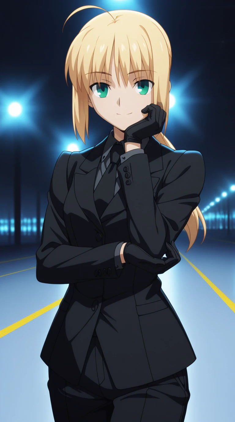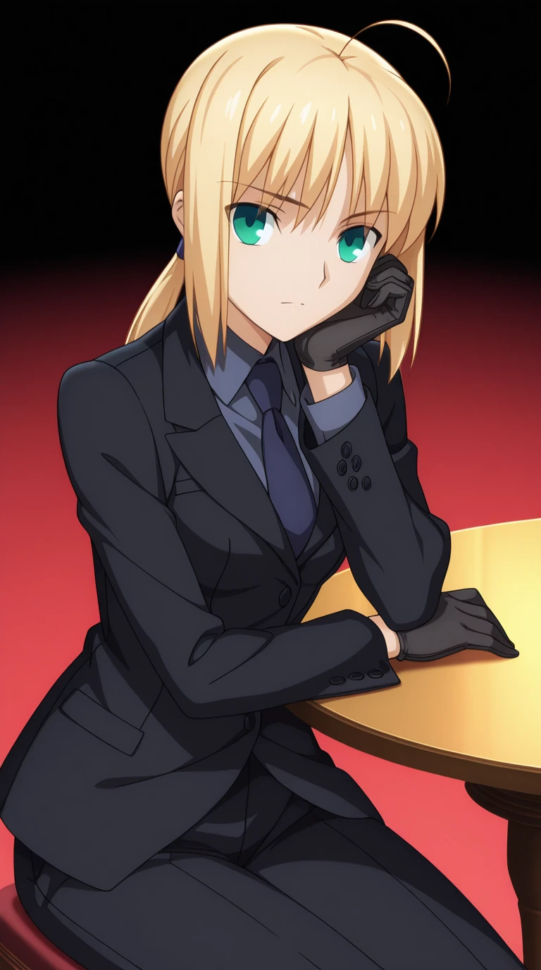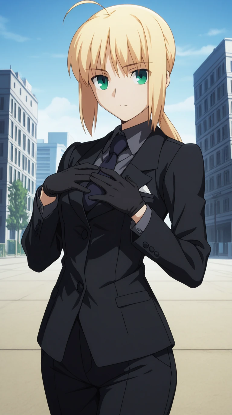 gloves, necktie, black gloves, pants, formal, suit, pant suit,