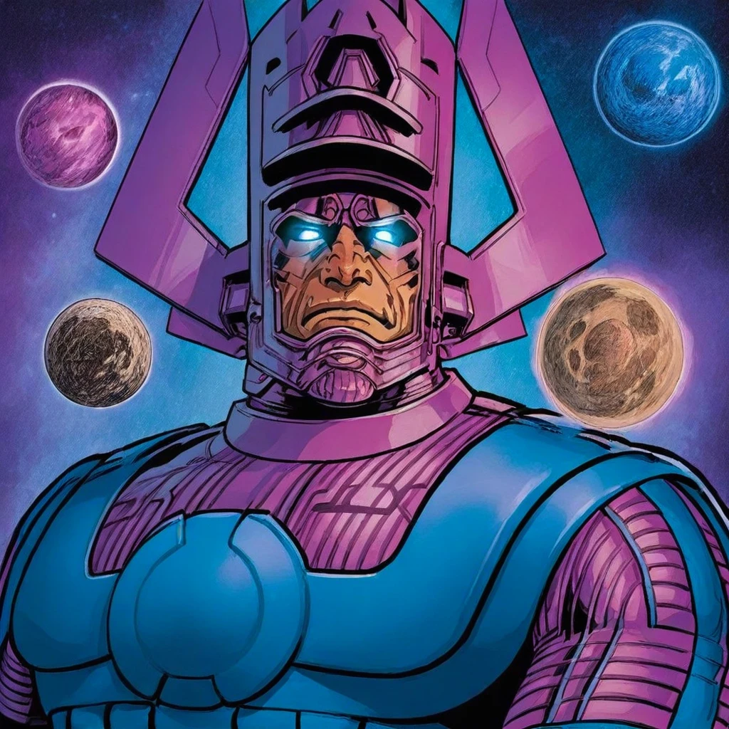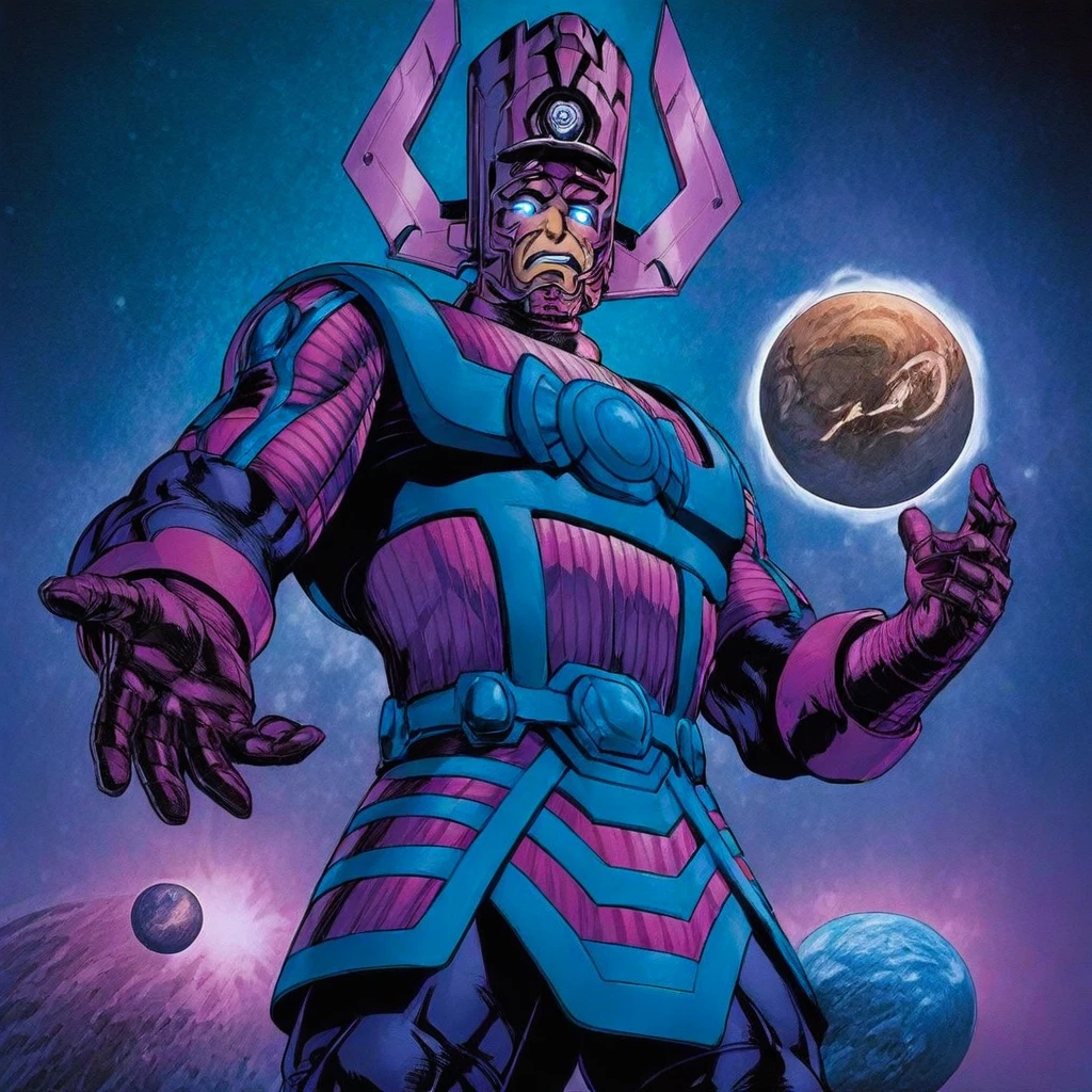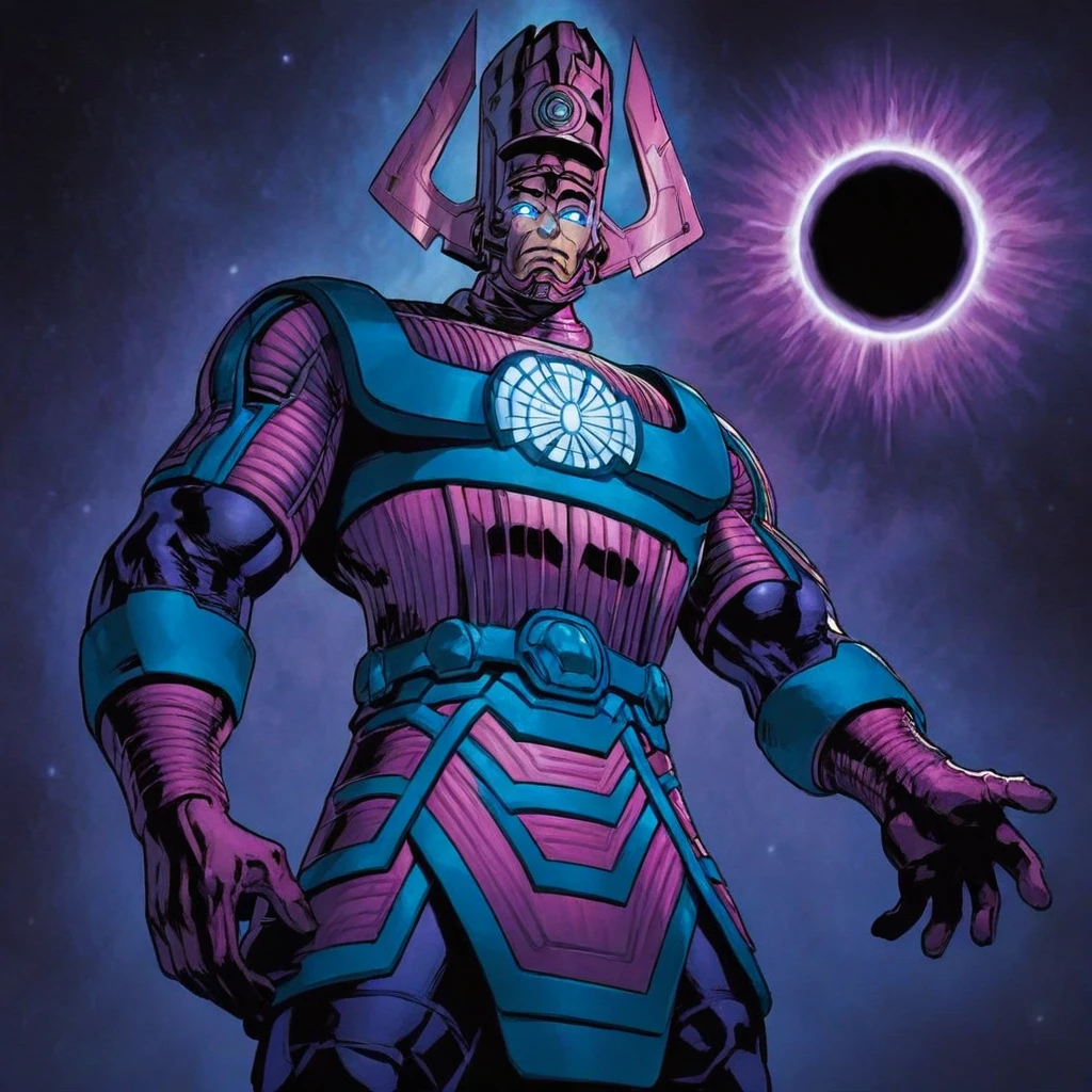 Galactus, mature male, muscular male, macro, blue and purple armor, purple helmet, blue eyes, glowing eyes,