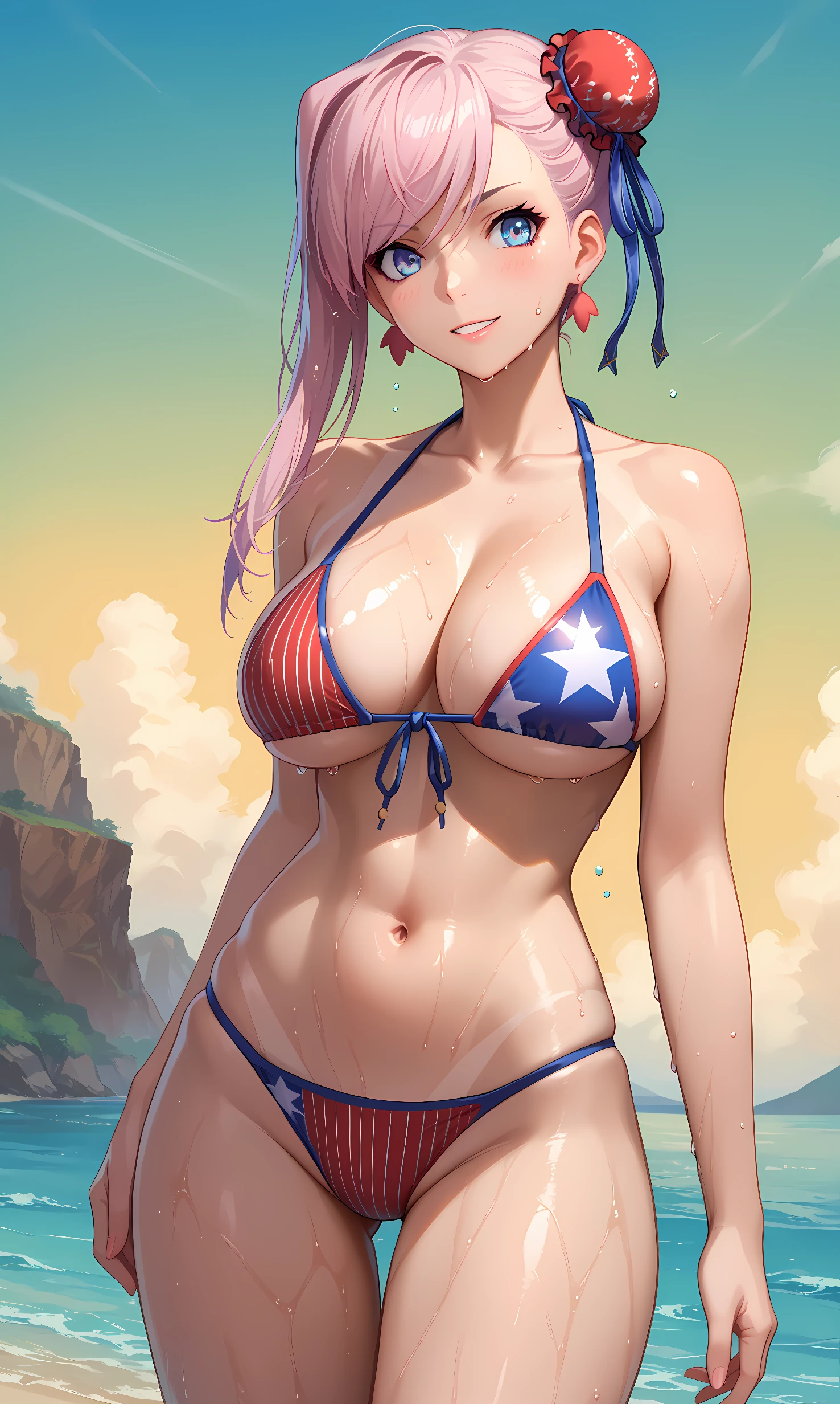 miyamoto_musashi, blue eyes, medium hair, pink hair, ponytail, hair ornament