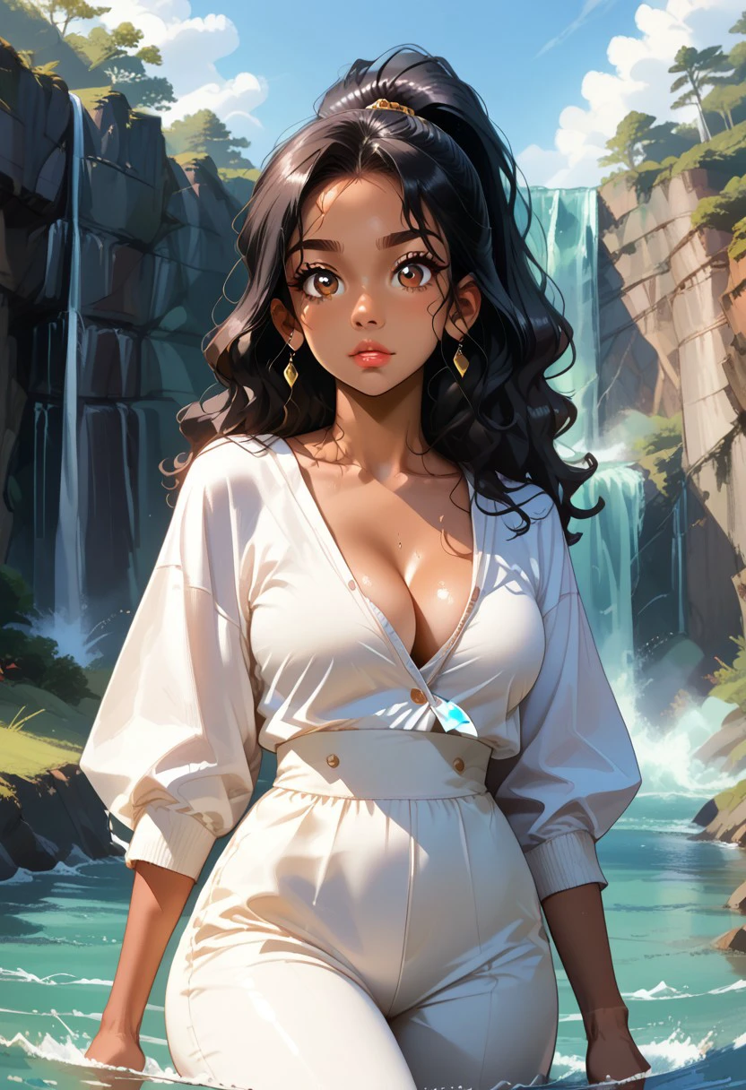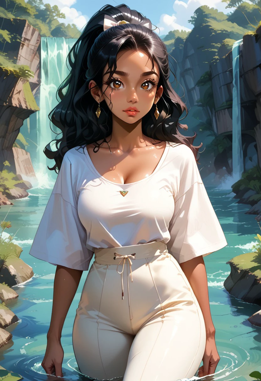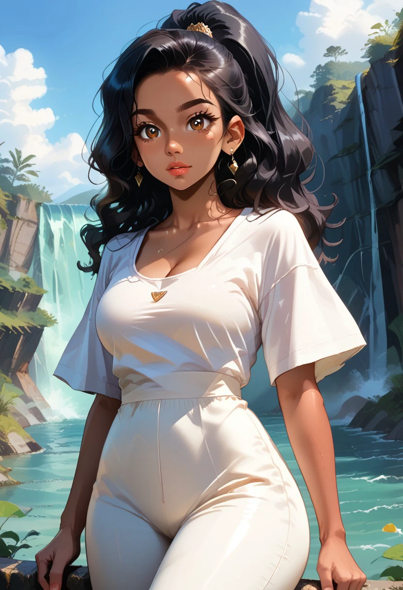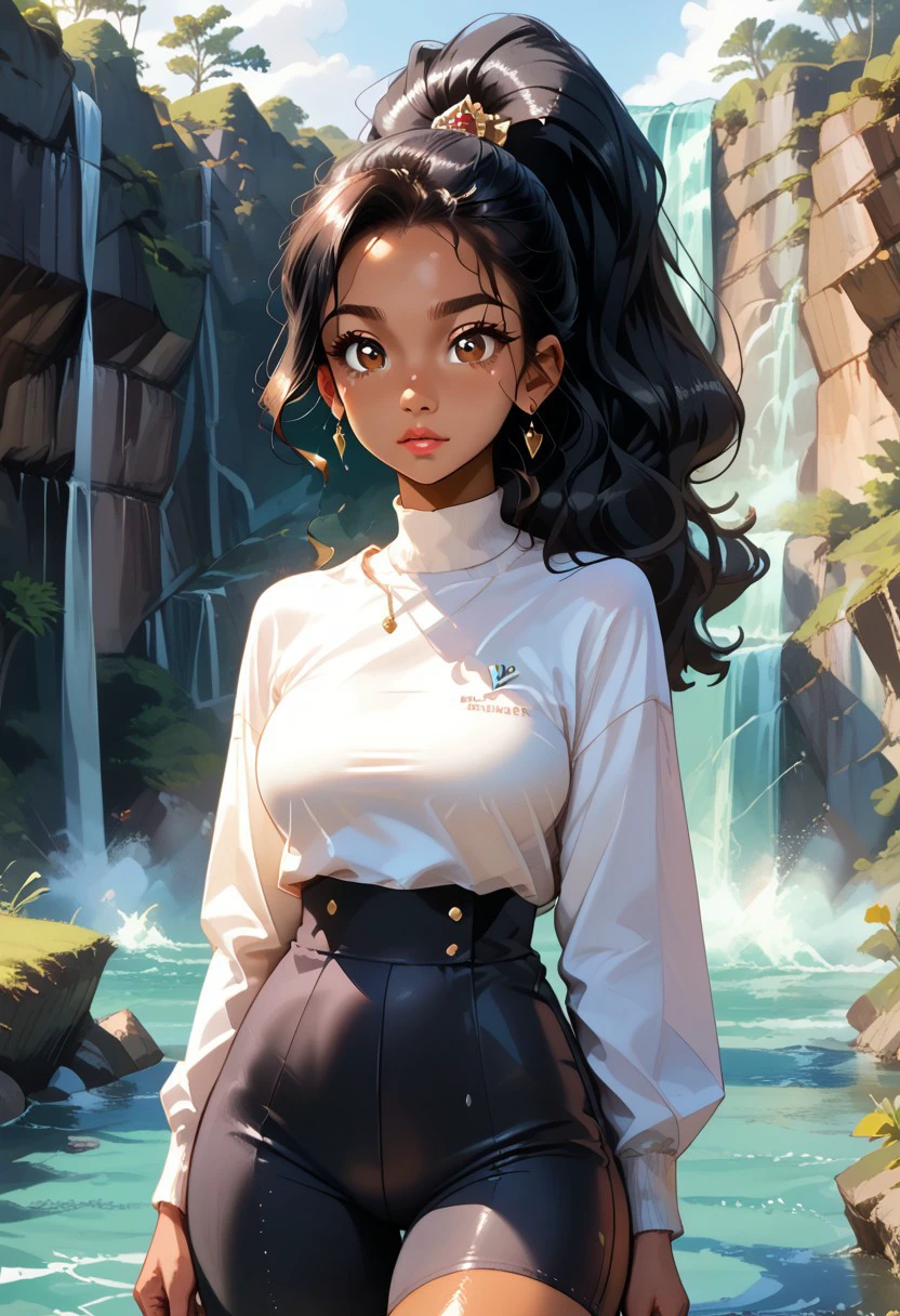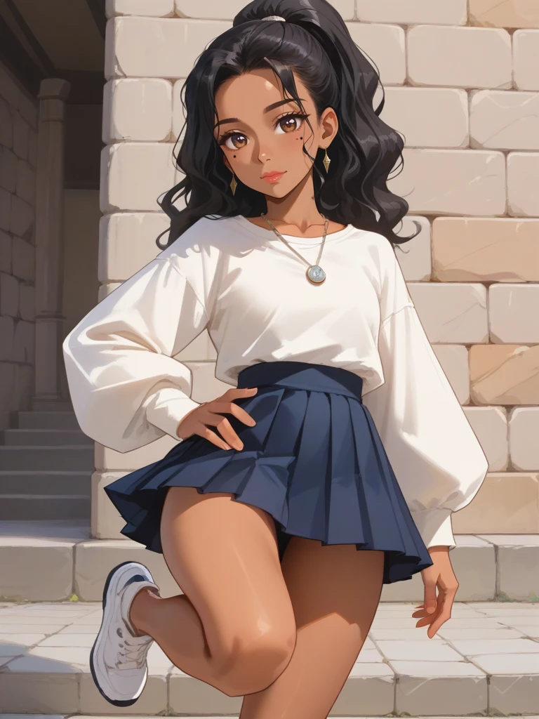 almond-shaped brown eyes, Long wavy black hair, tied in a high ponytail, medium tan, fitted white blouse with puffed sleeves,, tucked into a dark blue pleated skirt that reaches mid-thigh, mid-thigh dark blue skirt white sneakers, silver pendant necklace