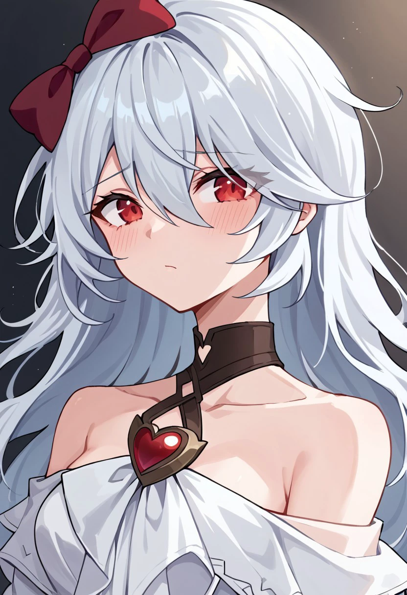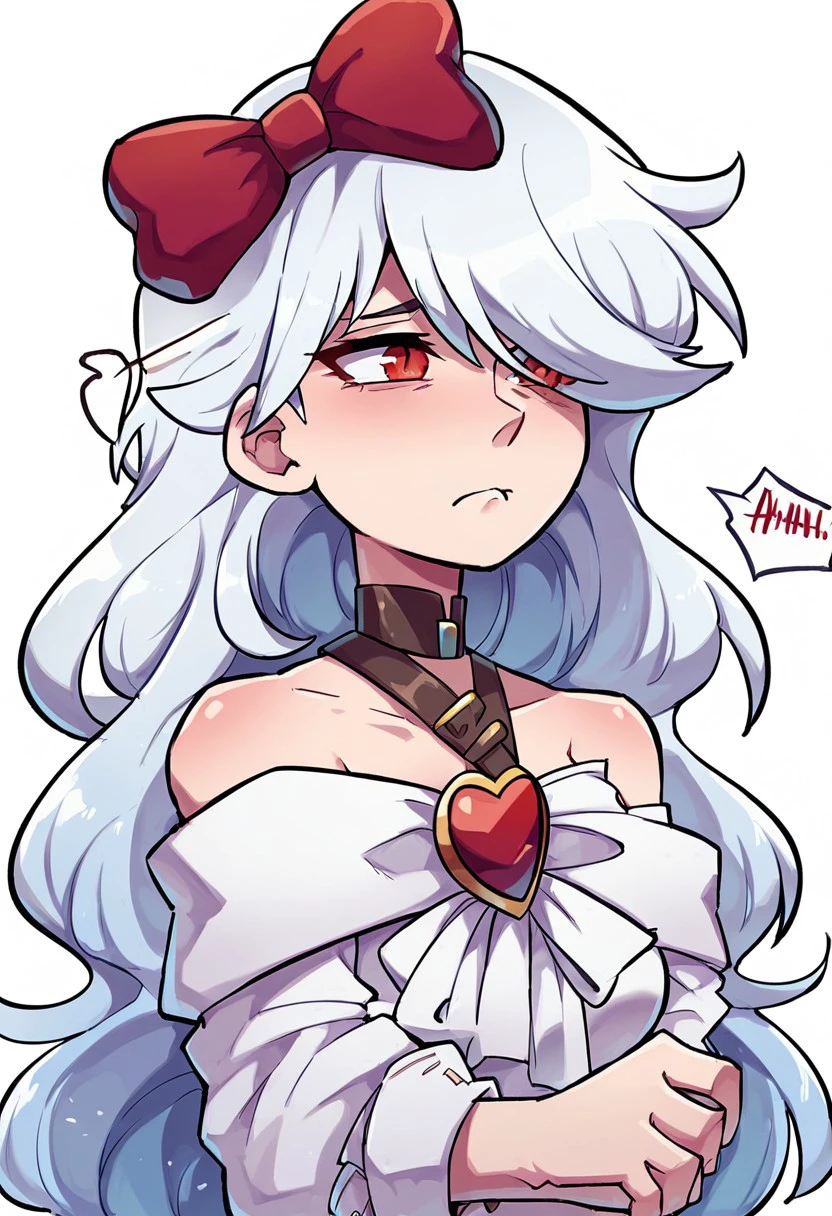normal: sinestrea, 1girl, white hair, bare shoulders, white dress, frown hair bow, long hair, heart brooch, medium breasts, hair bow, ribbon, red eyes, bare shoulder