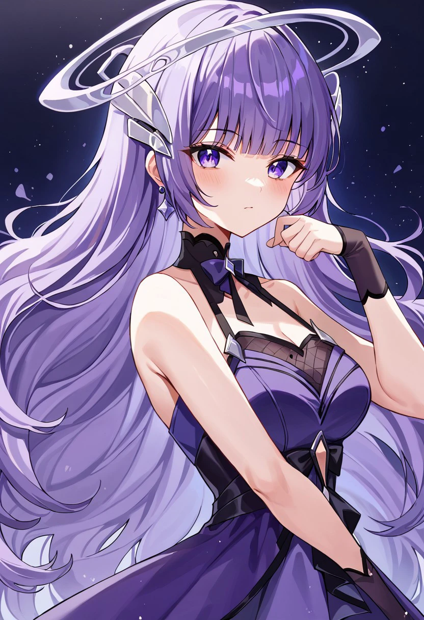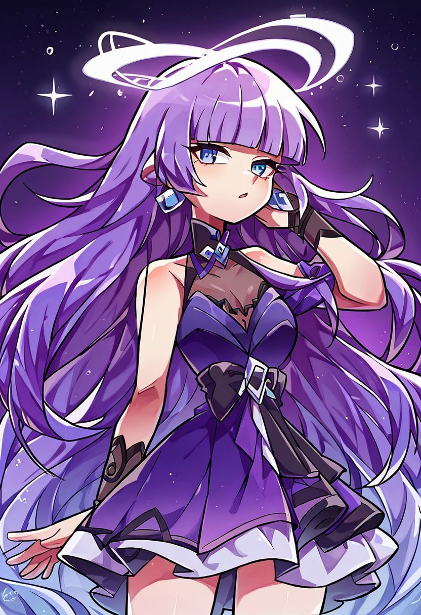 wave Sinestrea_Wave, 1girl, long hair, dress, jewelry, medium breasts, long hair, purple hair, earrings, sleeveless, blunt bangs, sleeveless dress, halo, polearm, purple dress,