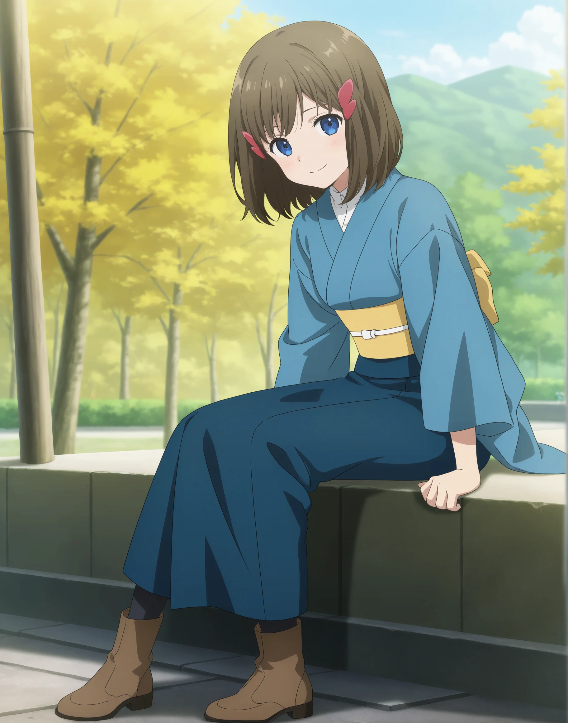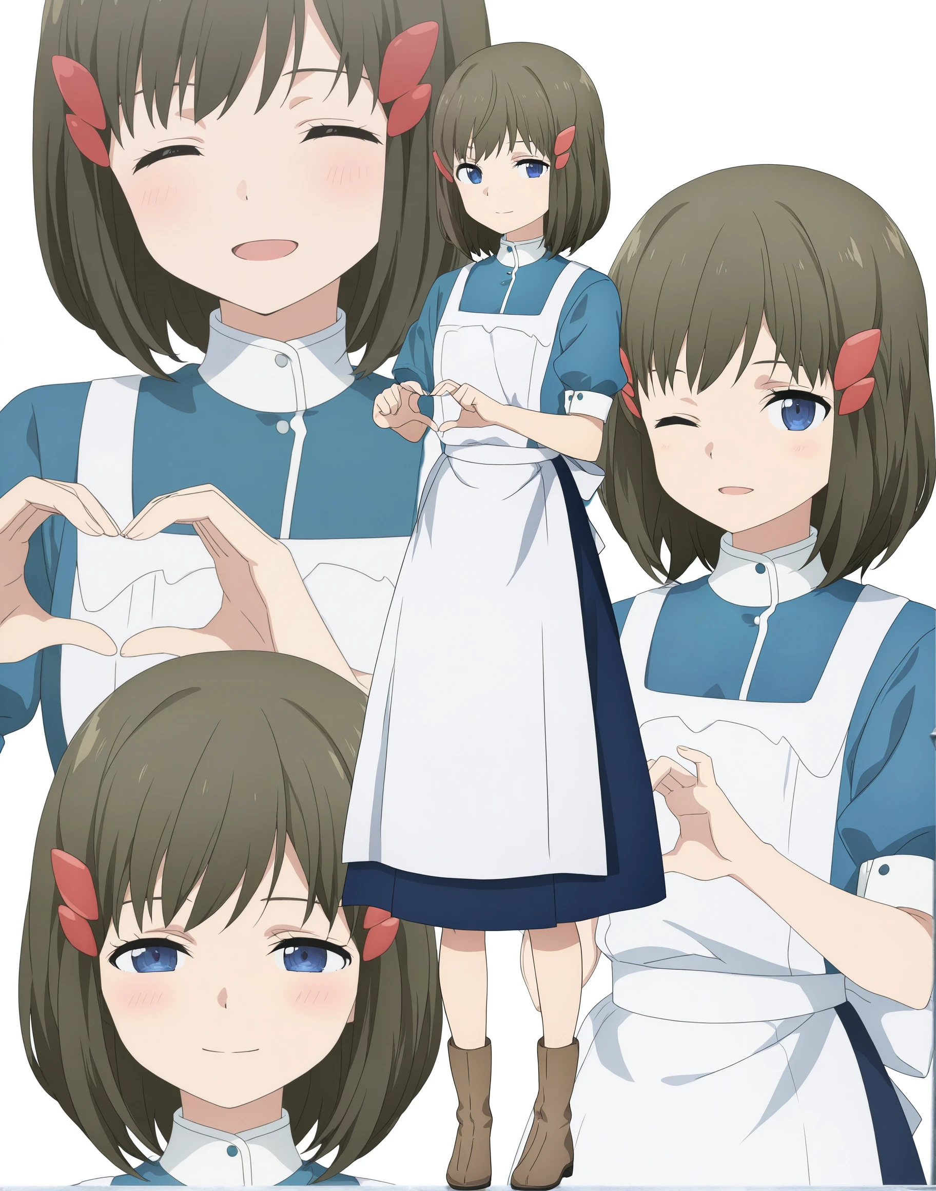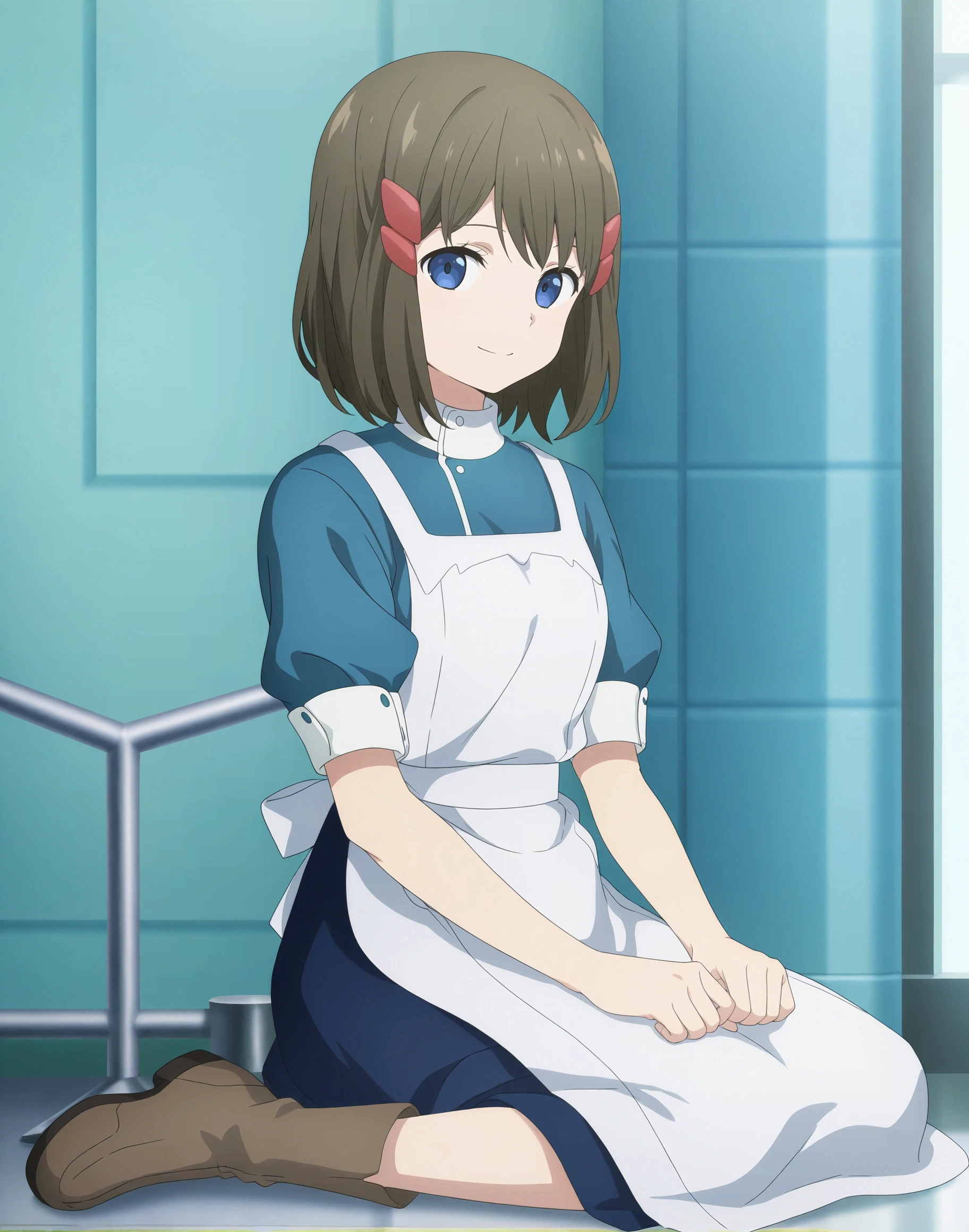 airy01, blue eyes, hair ornament, white apron, brown hair, hairclip, blue dress,medium hair, short sleeves, blue shirt, collared dress, shirt, maid apron, blue skirt, bob cut, puffy sleeves,buttons, eyebrows hidden by hair,brown boots,