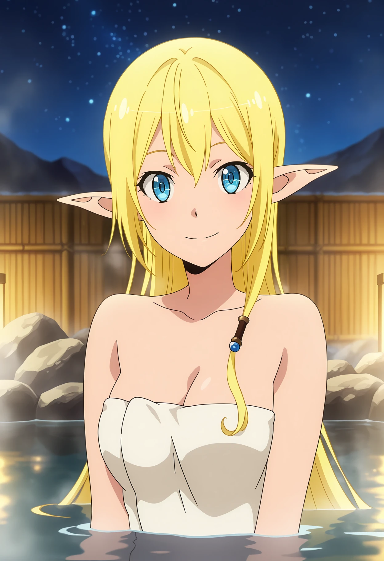 long hair, blonde hair, blue eyes, pointy ears, hair ornament