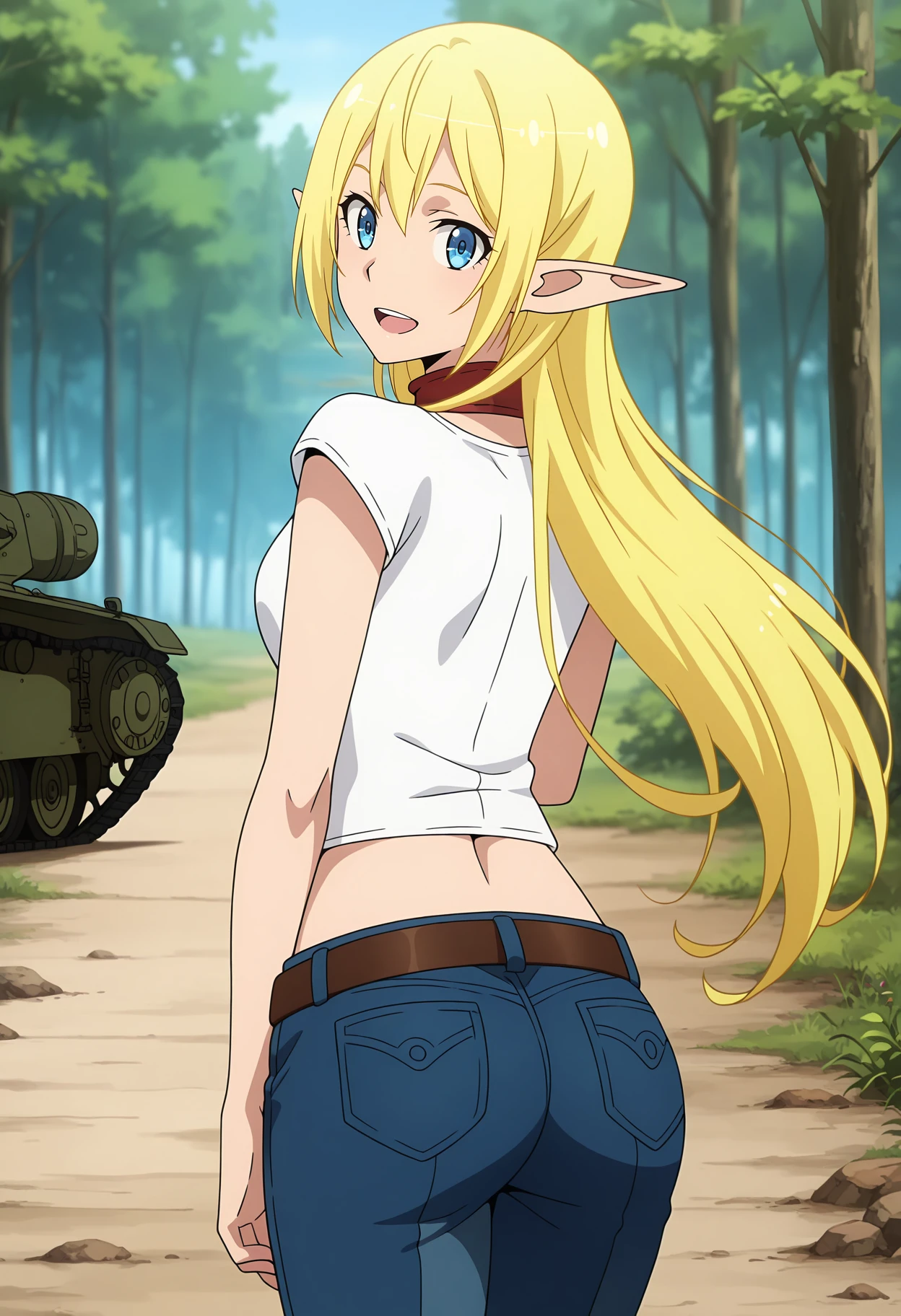 red collar, white shirt, short sleeves, crop top, navel, brown belt, belt buckle, jeans