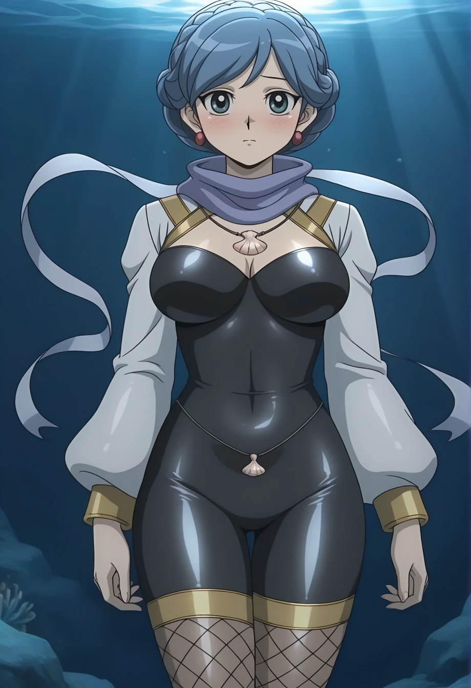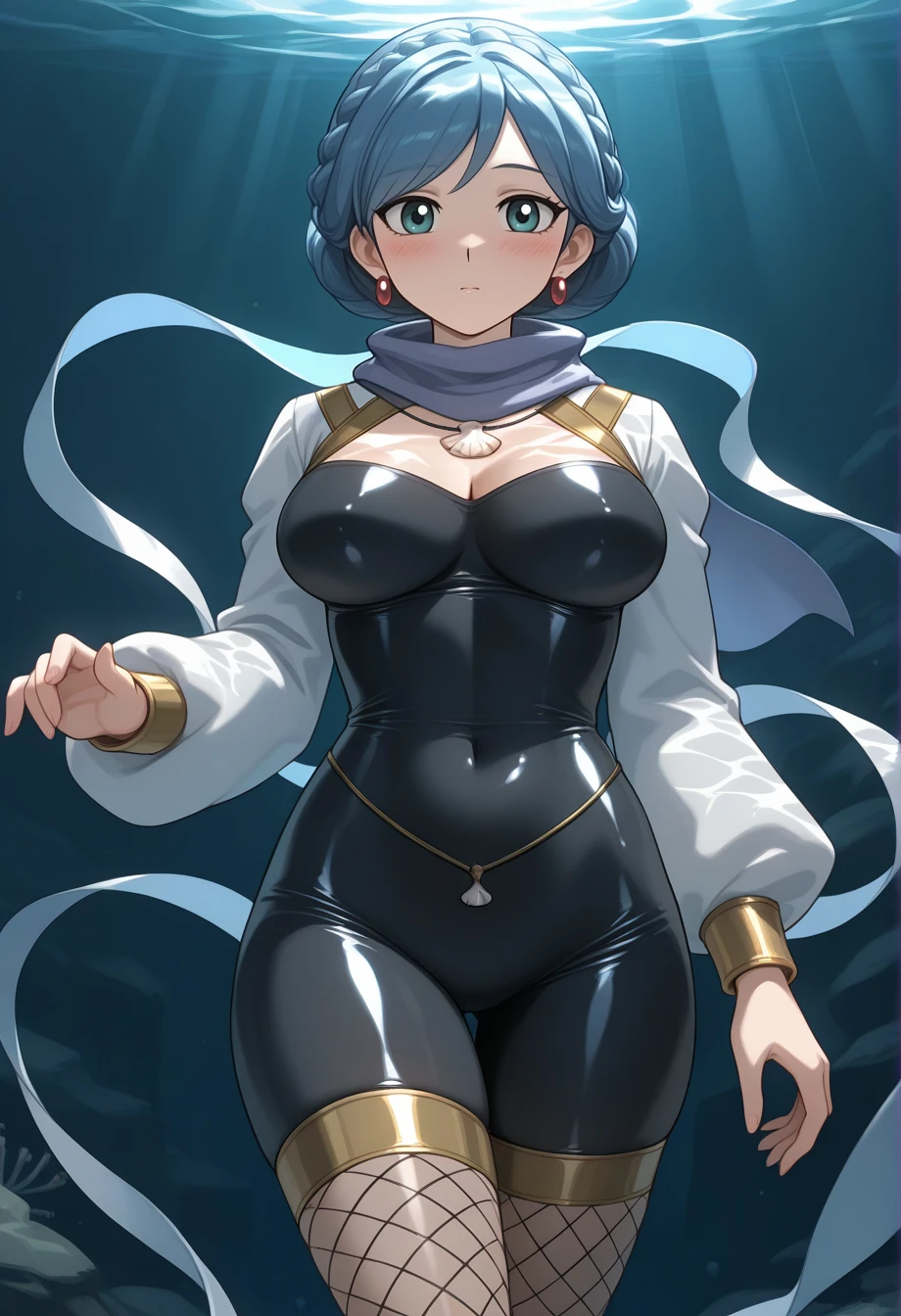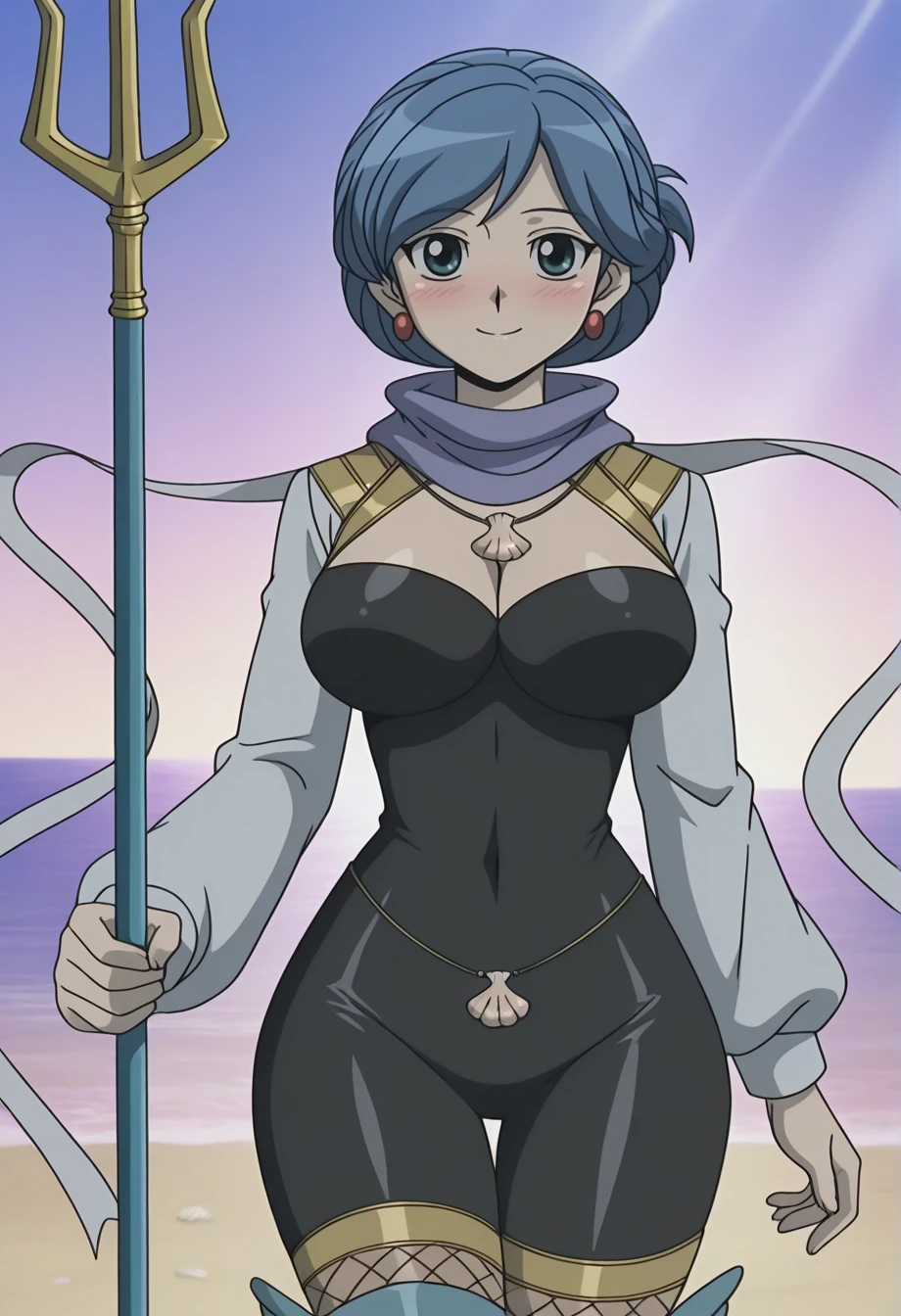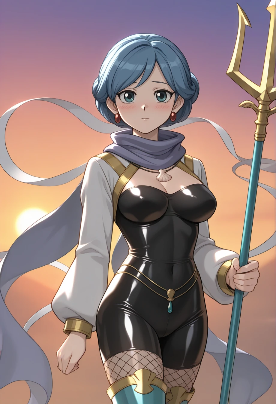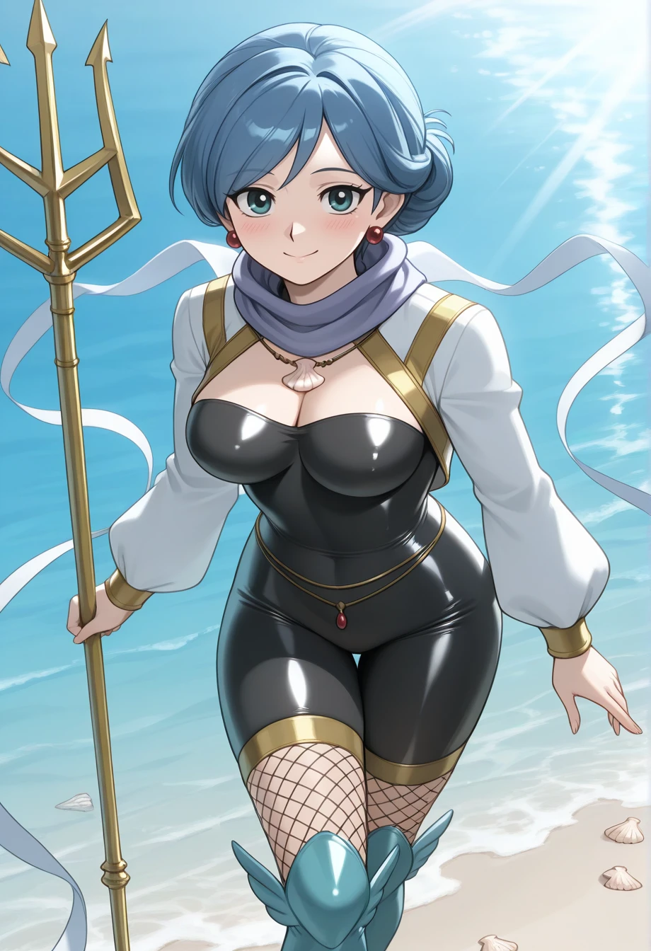 maidenota, 1girl, solo, blue hair, aqua eyes, red earrings, seashell, necklace, bodystocking, impossible clothes, fishnet thighhighs, boots, trident, holding polearm, cropped jacket, scarf, floating ribbon, gold trim, cleavage cutout