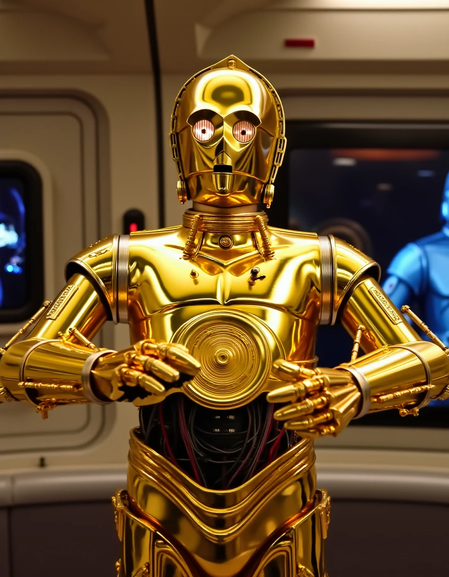 C-3PO (See-Threepio) was a 3PO-series protocol droid designed to interact with organics, programmed primarily for etiquette and protocol. Sometimes referred to as Threepio, he was fluent in over six million forms of communication, and developed a fussy and worry-prone personality throughout his many decades of operation. Along with his counterpart, the astromech droid R2-D2, C-3PO constantly found himself directly involved in pivotal moments of galactic history, and aided in saving the galaxy on many occasions.