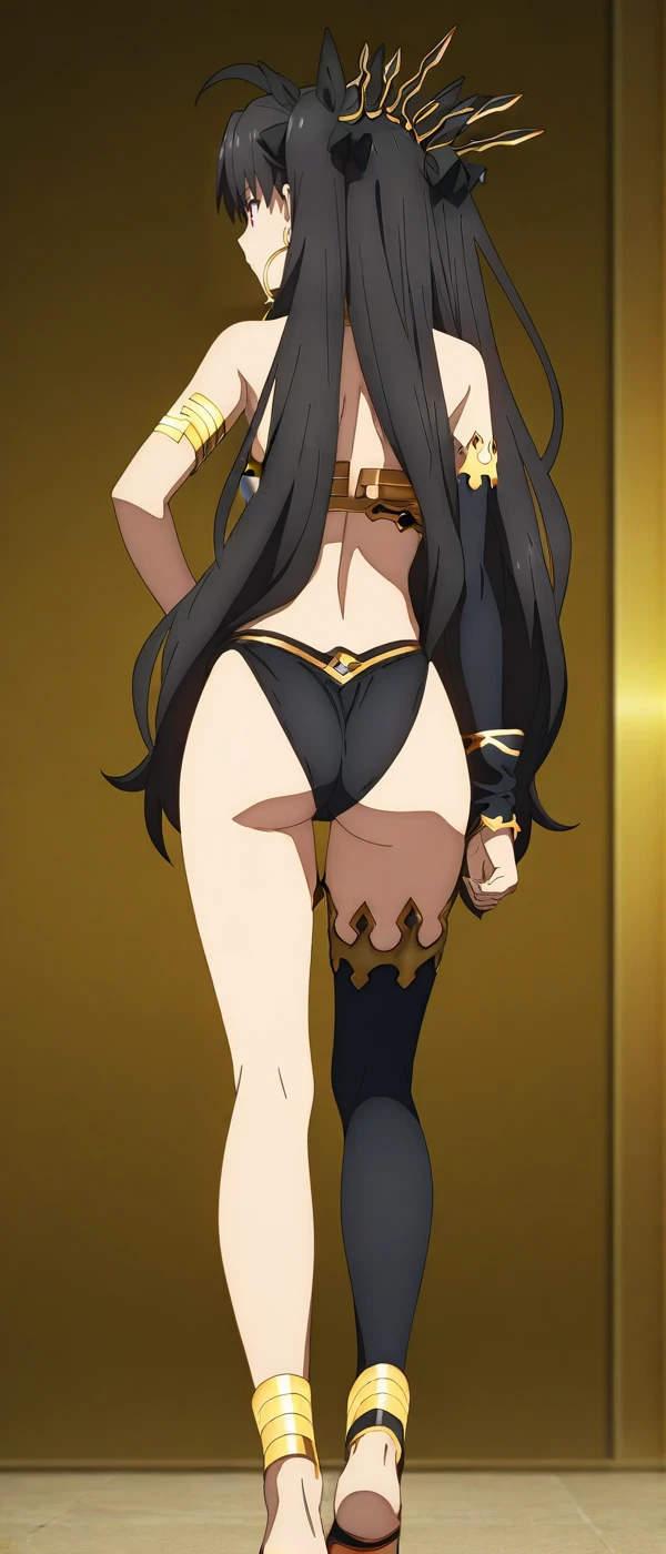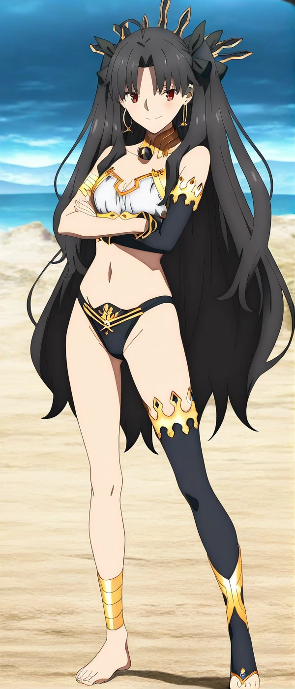 hoop earrings, black crown, asymmetrical clothes, strapless, white bikini, detached collar, single elbow glove, armlet, highleg panties, black panties, gold trim, single thighhigh, barefoot, anime coloring,