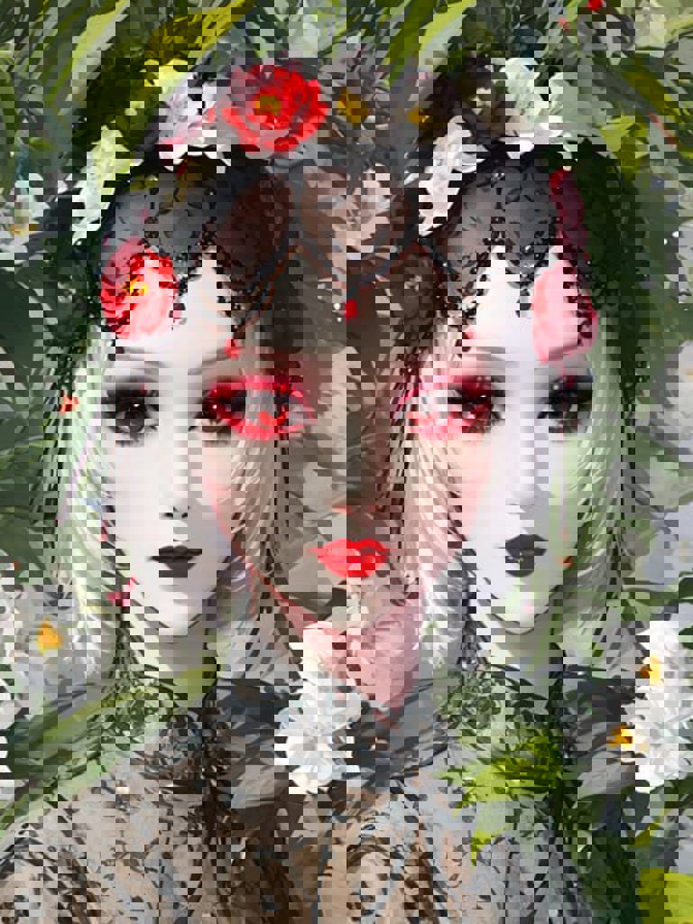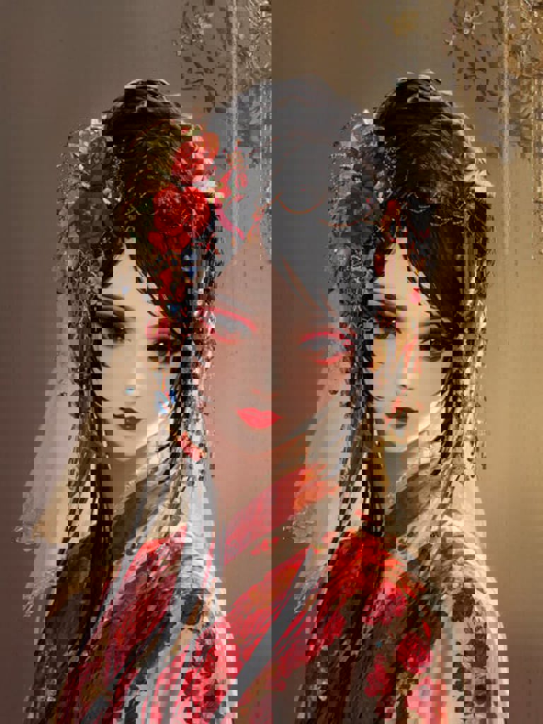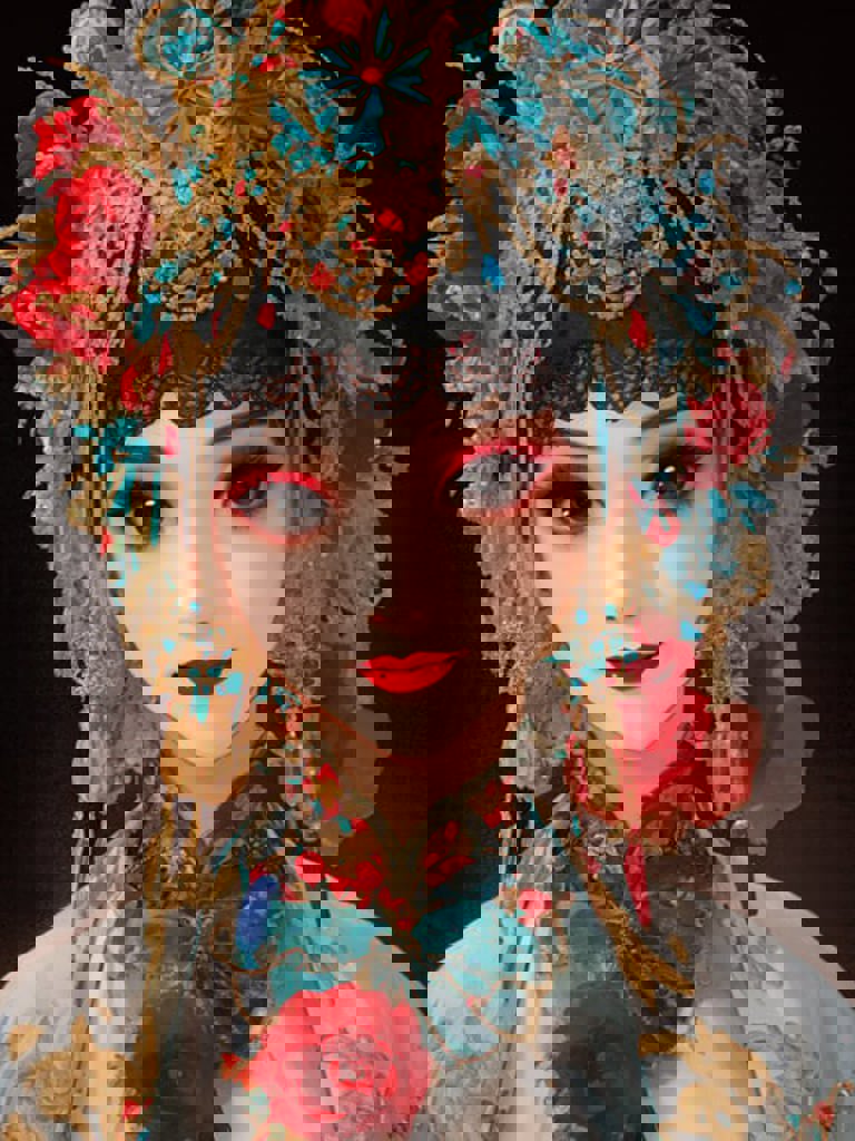 一些tag: clothes_jingju,1girl, solo,_____ hair, hair ornament, makeup,portrait,grey background, upper body, long hair,simple background, chinese clothes, _____ eyes, long sleeves, flower,closed mouth