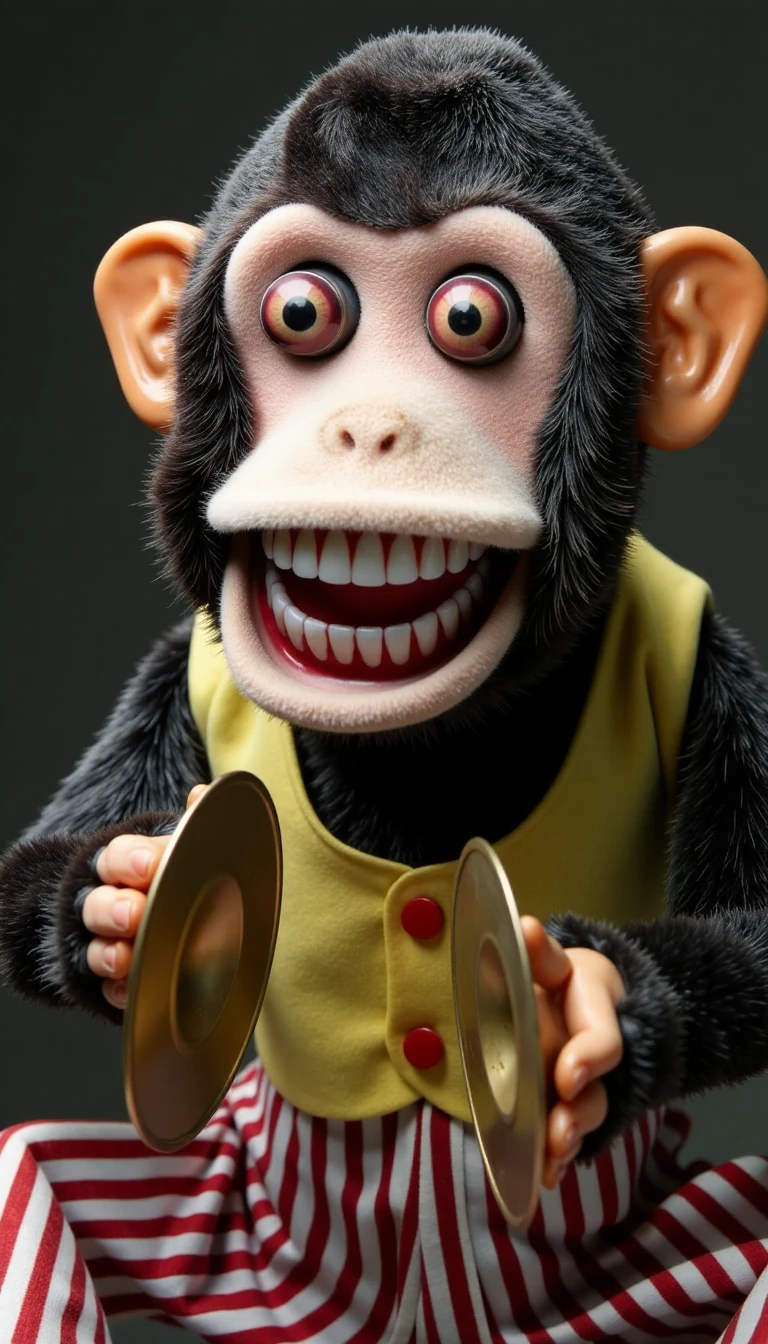 A cymbal-banging monkey toy is a mechanical depiction of a monkey holding a cymbal in each hand. When activated it repeatedly bangs its cymbals together and, in some cases, bobs its head, chatters, screeches, grins, and more. There are both traditional wind-up versions and updated battery-operated cymbal-banging monkeys. This LoRA was trained on the Musical Jolly Chimp toy.