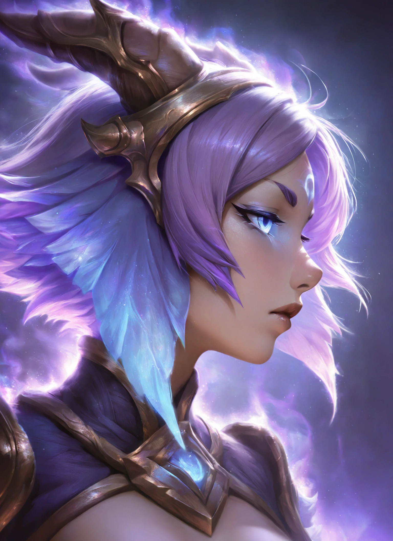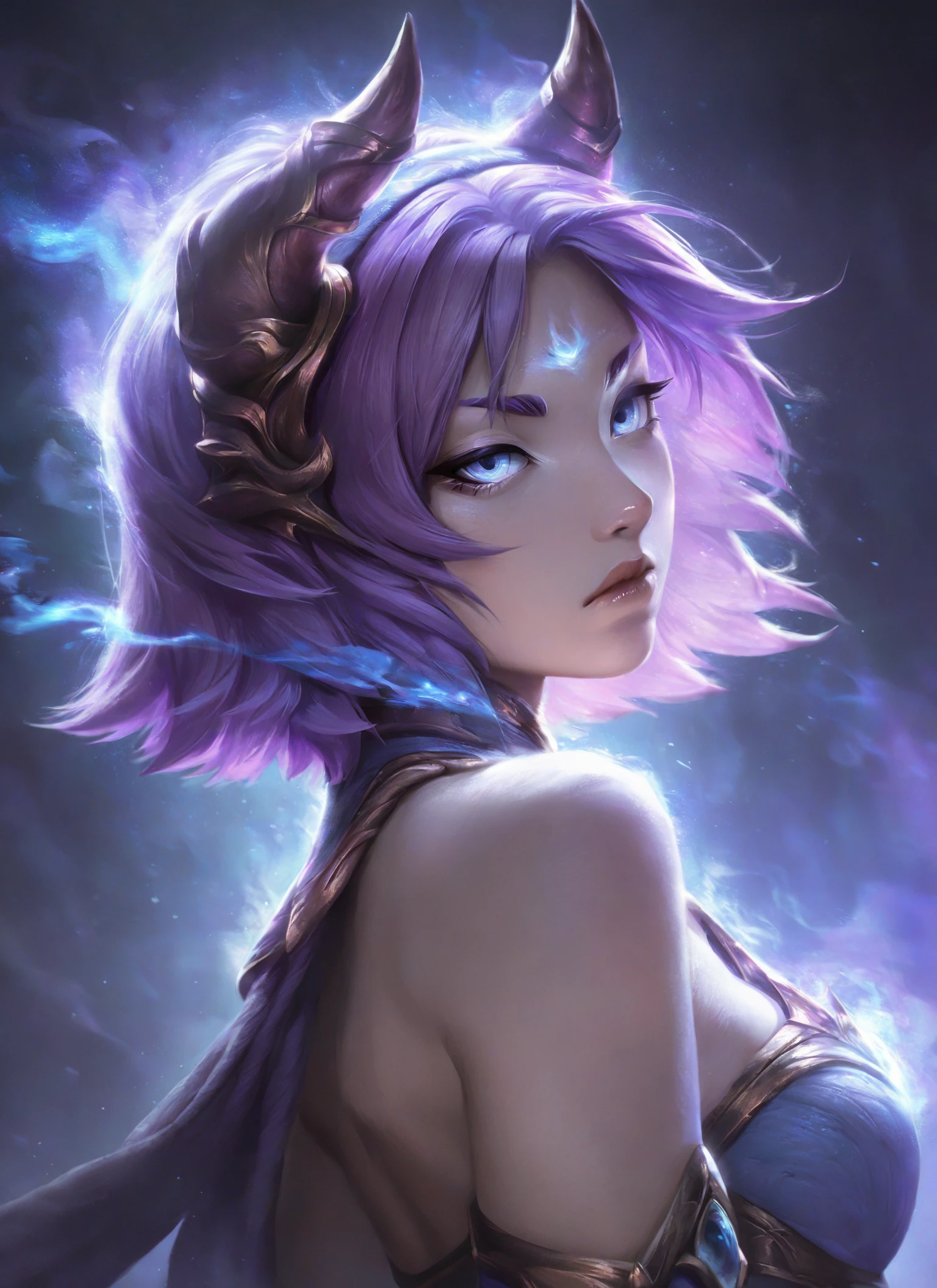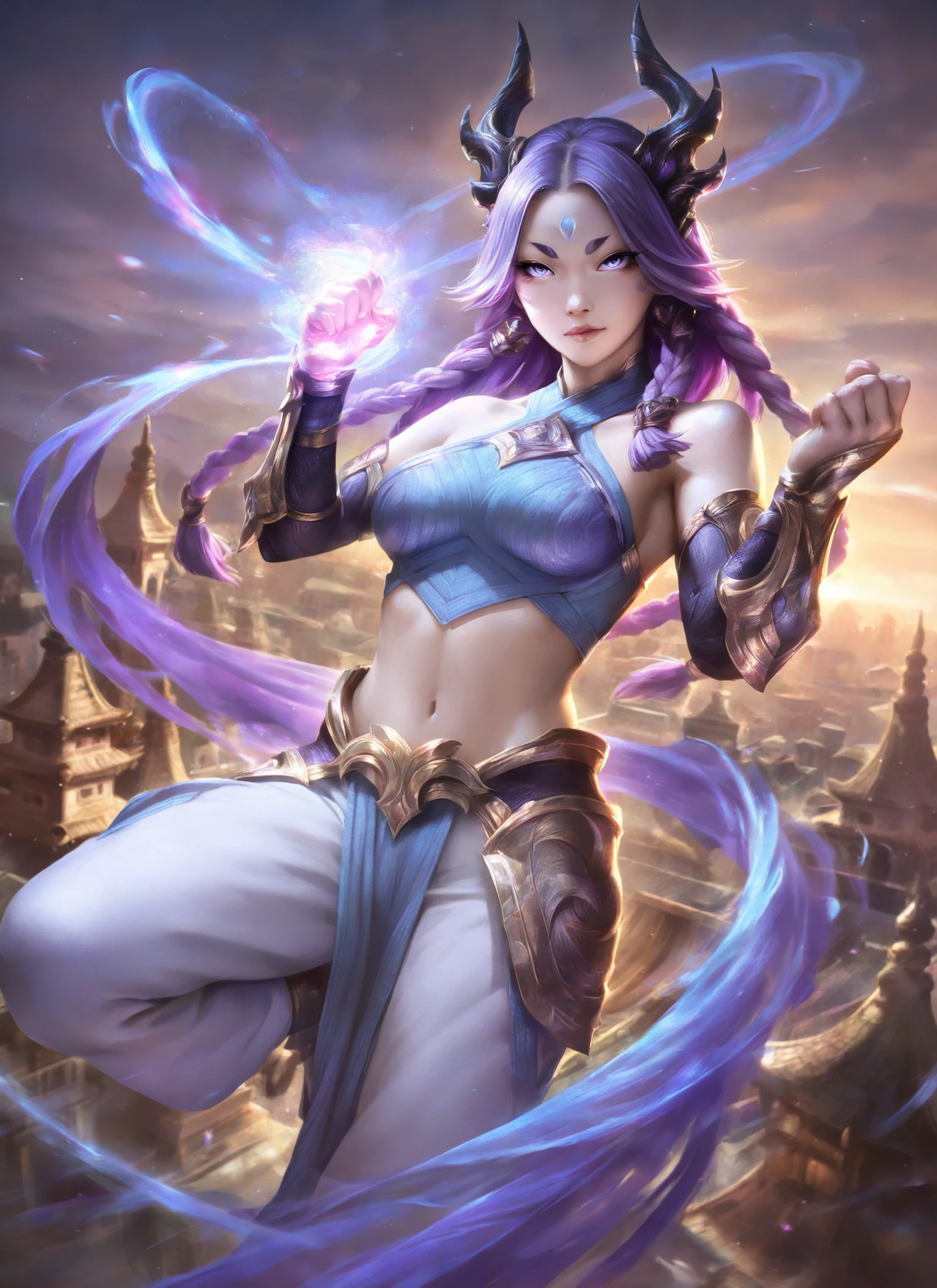 Main trigger word is yunara, but all of the following can be used to assist: character:Yunara, copyright:riot_games, league_of_legends, yunara, purple hair, purple eyes, glowing eyes, horned headpiece, black horns, gold headpiece, black gloves, gold cuffs, midriff, toned abs, crop top, blue crop top, white harem pants, gold belt,