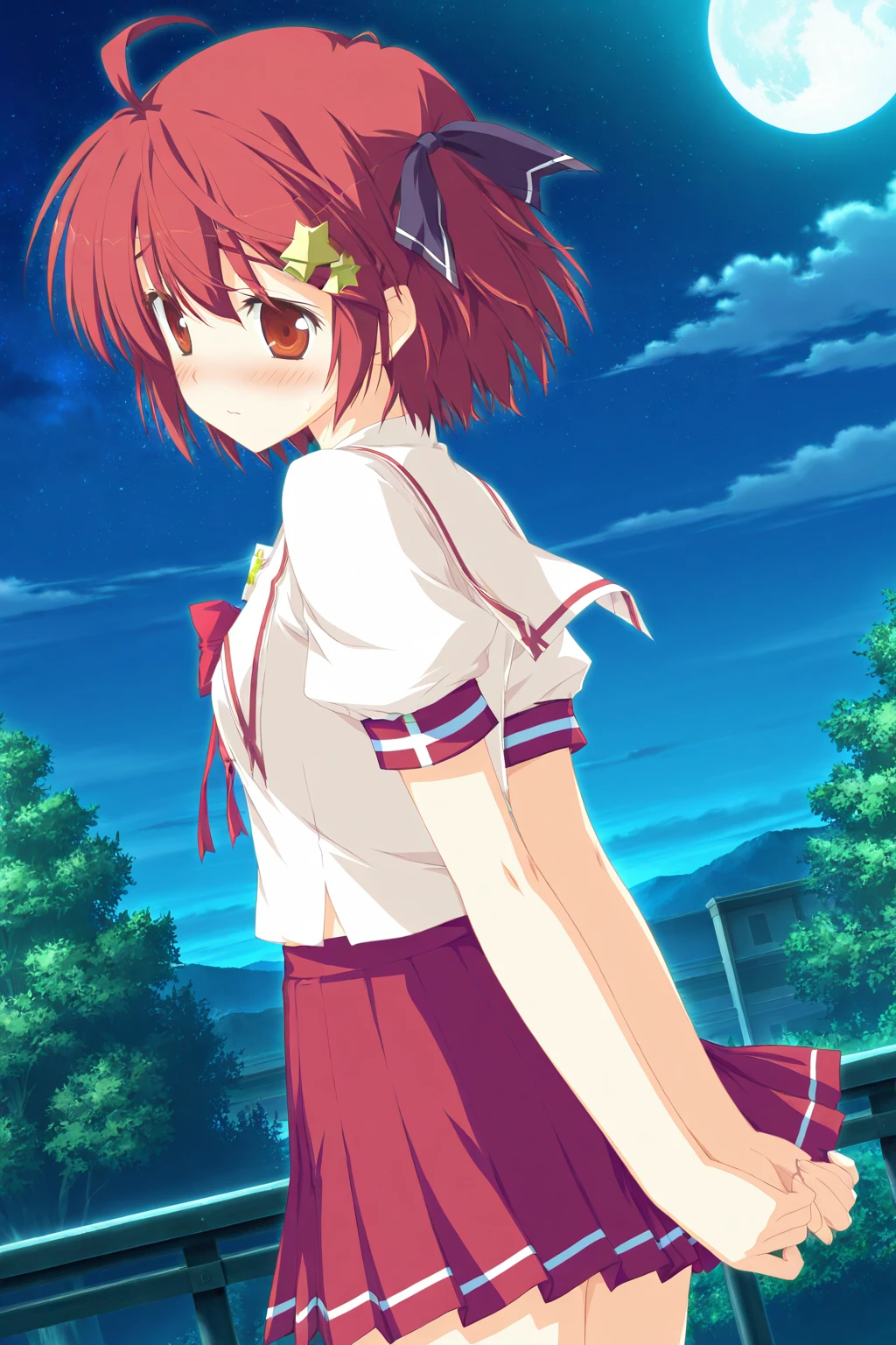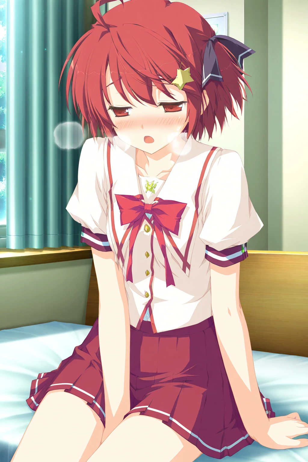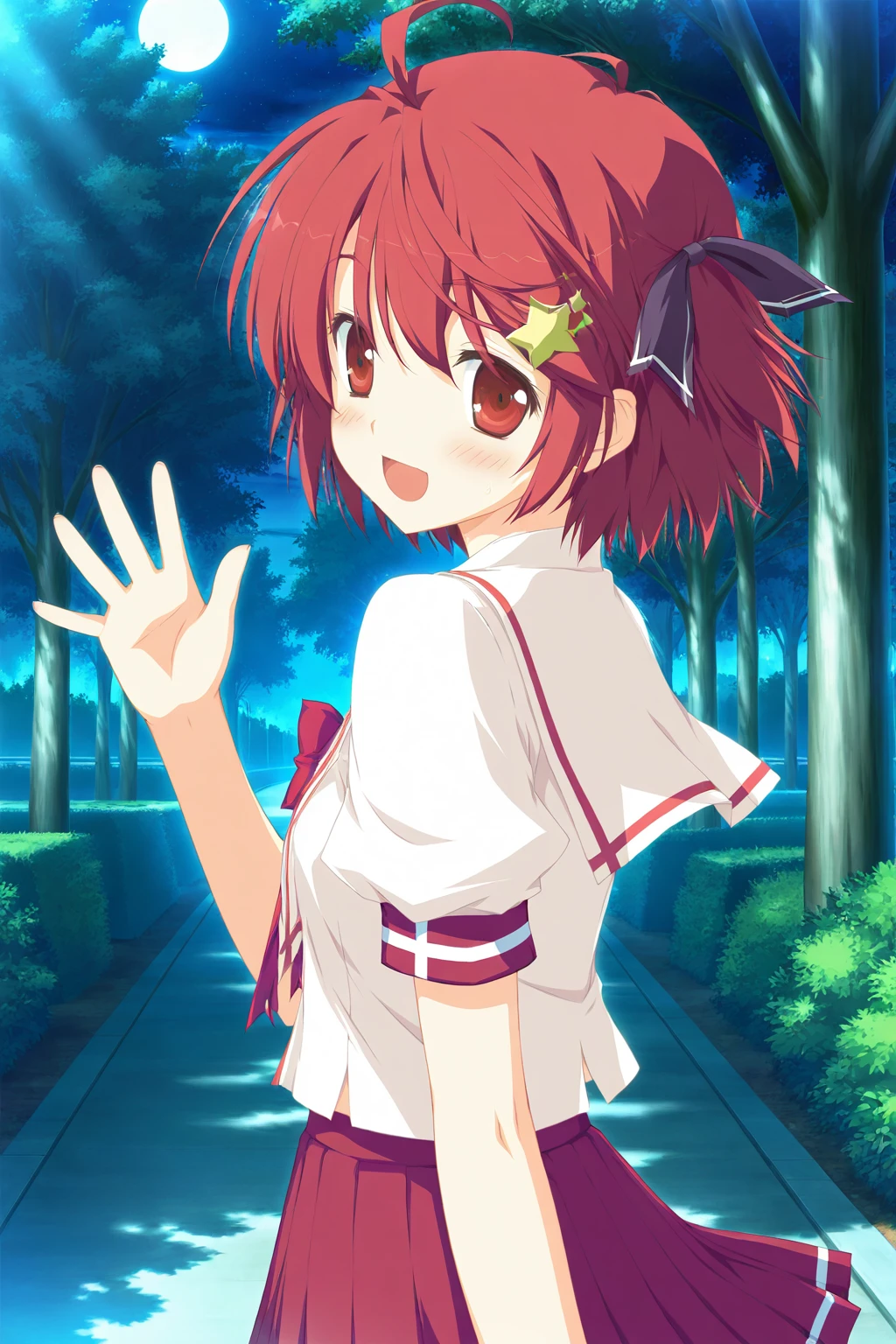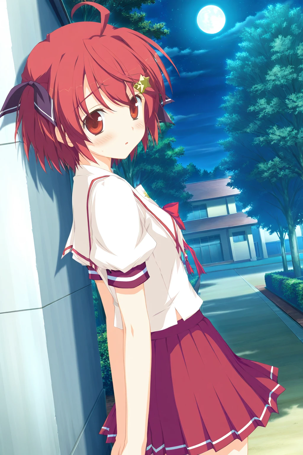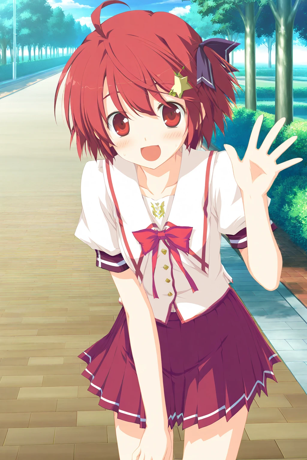 memorialmiyahoshi,minahoshi asuho,hoshizora no memoria,1girl,solo,red hair,short hair,red eyes,ahoge,hair ornament,star ornament,ribbonIf you don't need the original art style and prefer better generalization, please remove the following prompts: