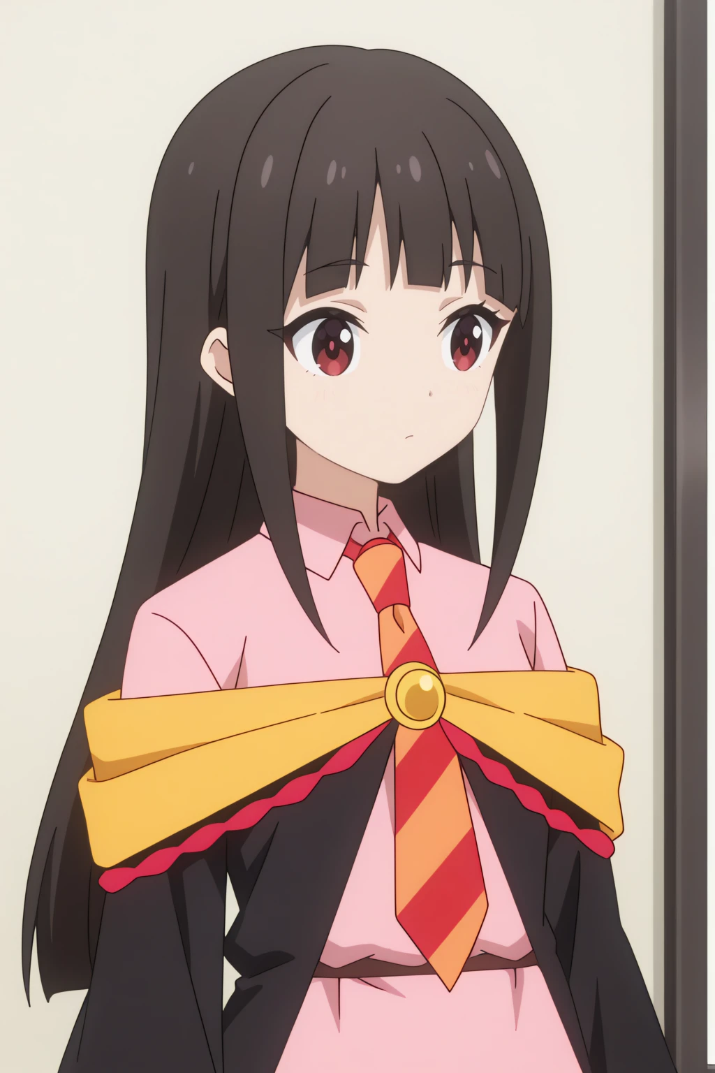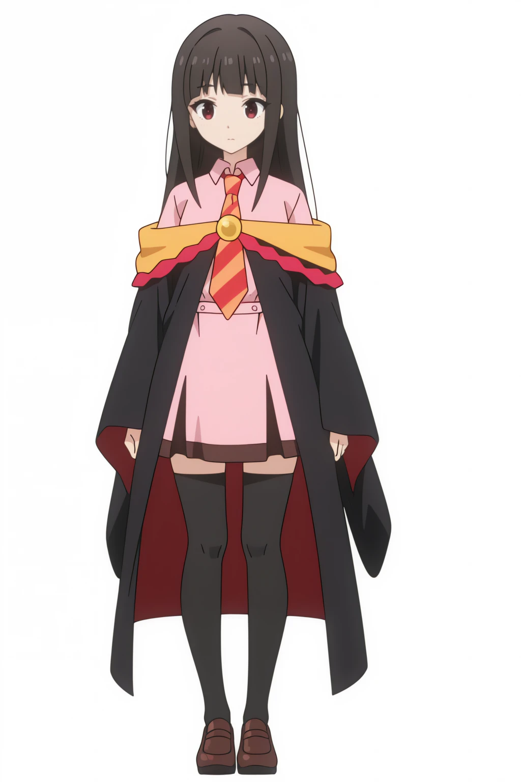 black cloak, black thighhighs, collared shirt, pink dress, striped necktie, school uniform, wide sleeves