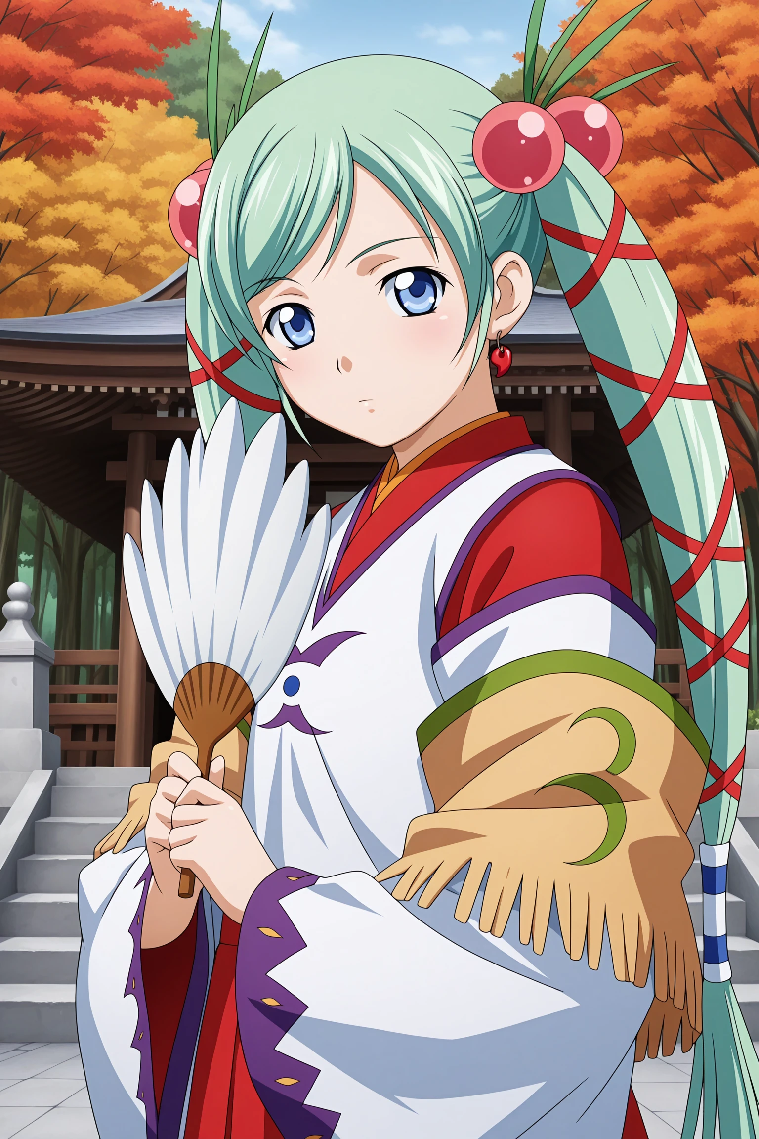 shokatsuryou koumei, long hair, green hair, twintails, hair ornament, hair bobbles, hair flower, hair ribbon, tress ribbon, low-tied long hair, parted bangs, blue eyes, magatama earrings, single earring, long sleeves, red kimono, white shirt, clothing cutout, wide sleeves, arm scarf, red skirt, long skirt, tabi, black footwear, zouri