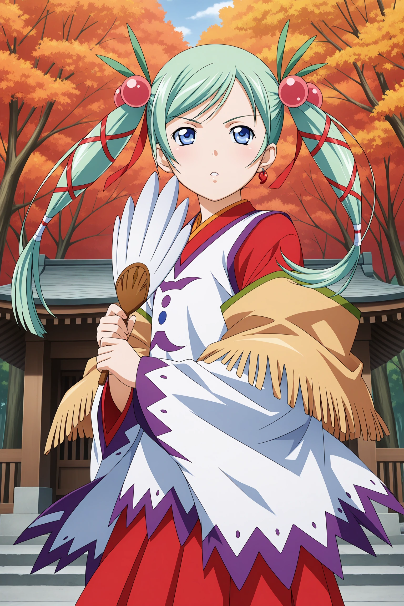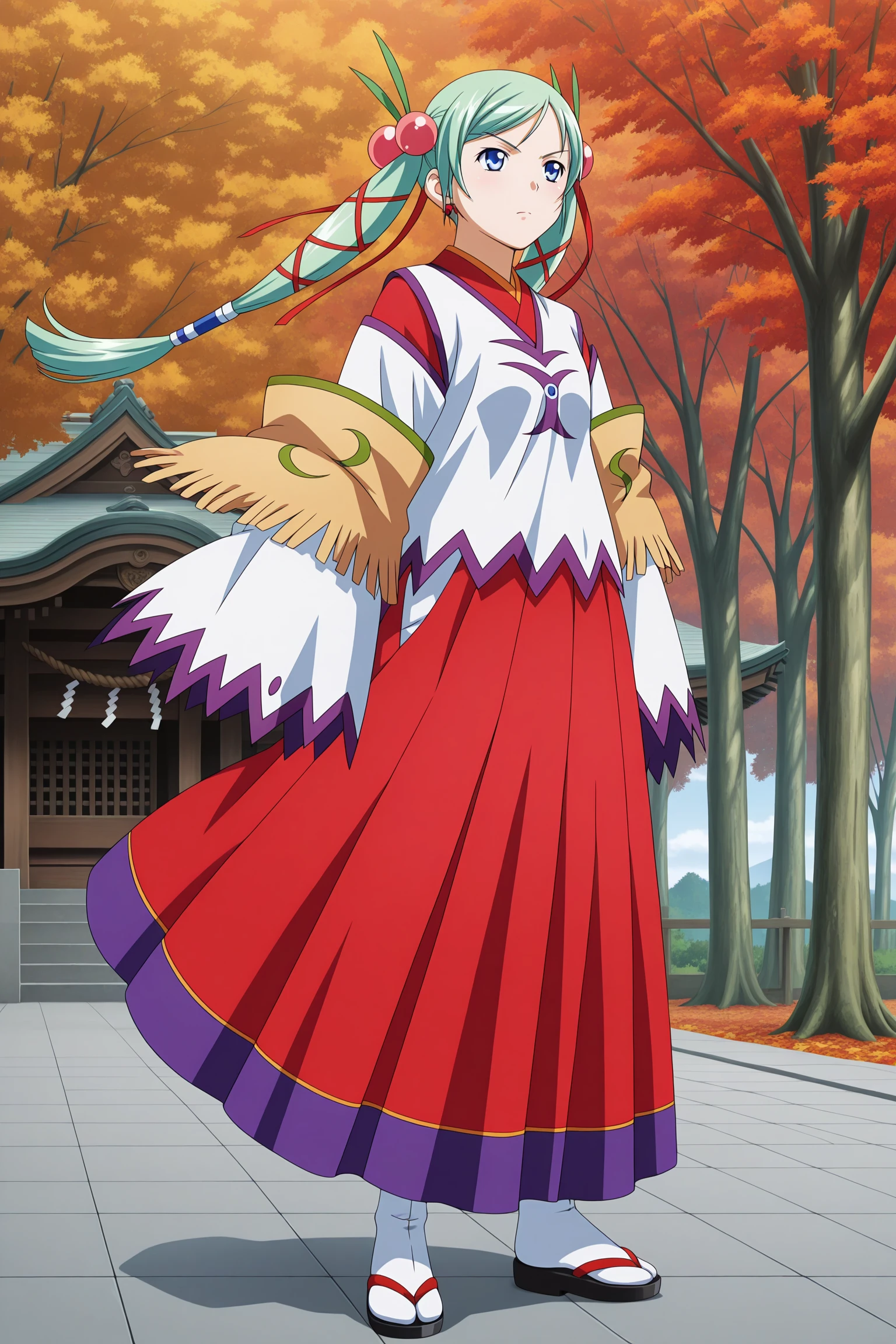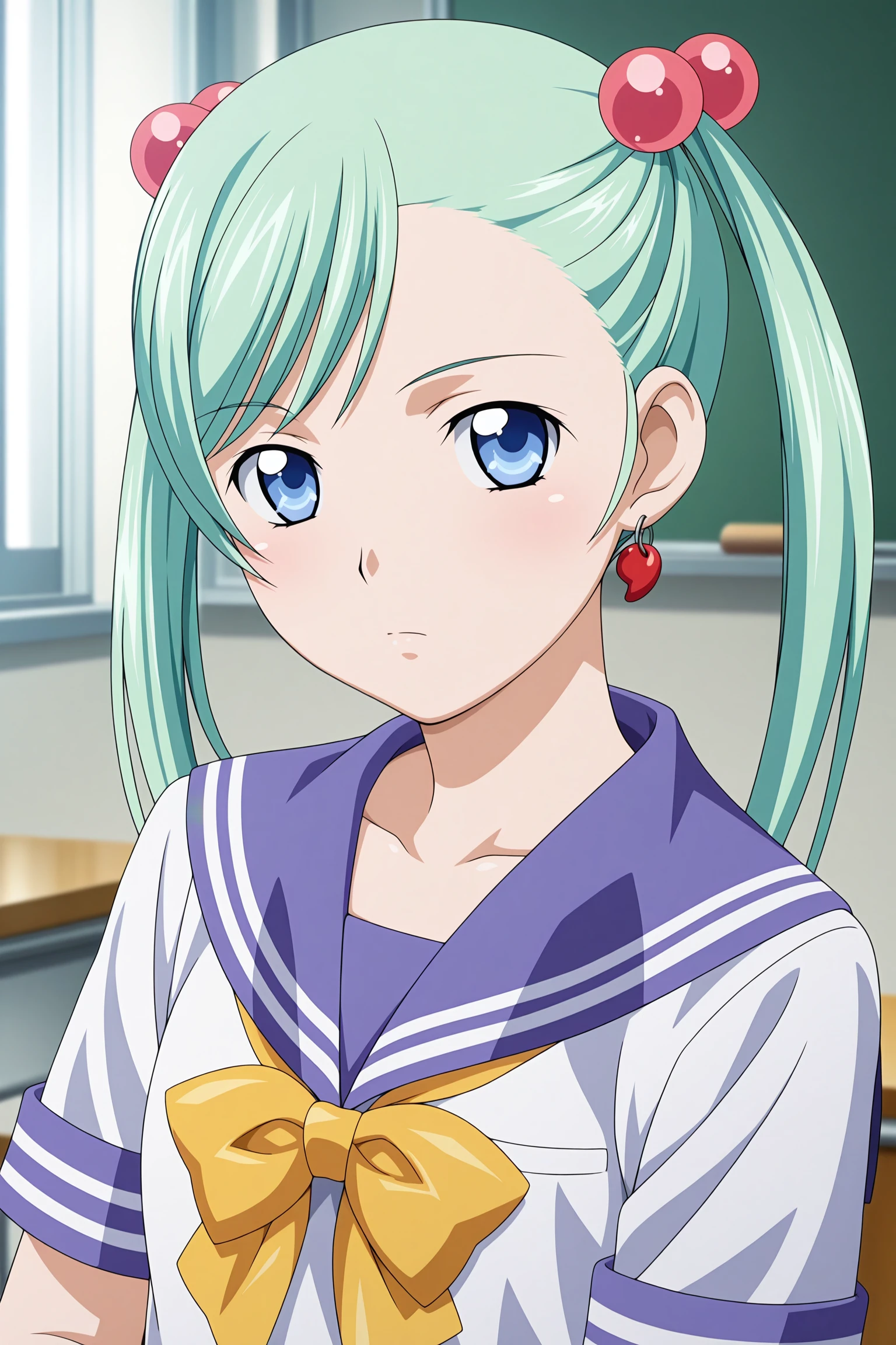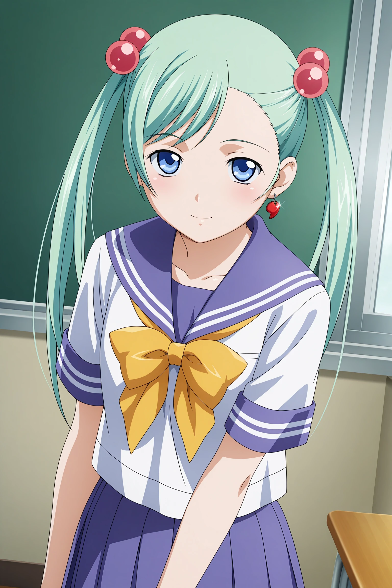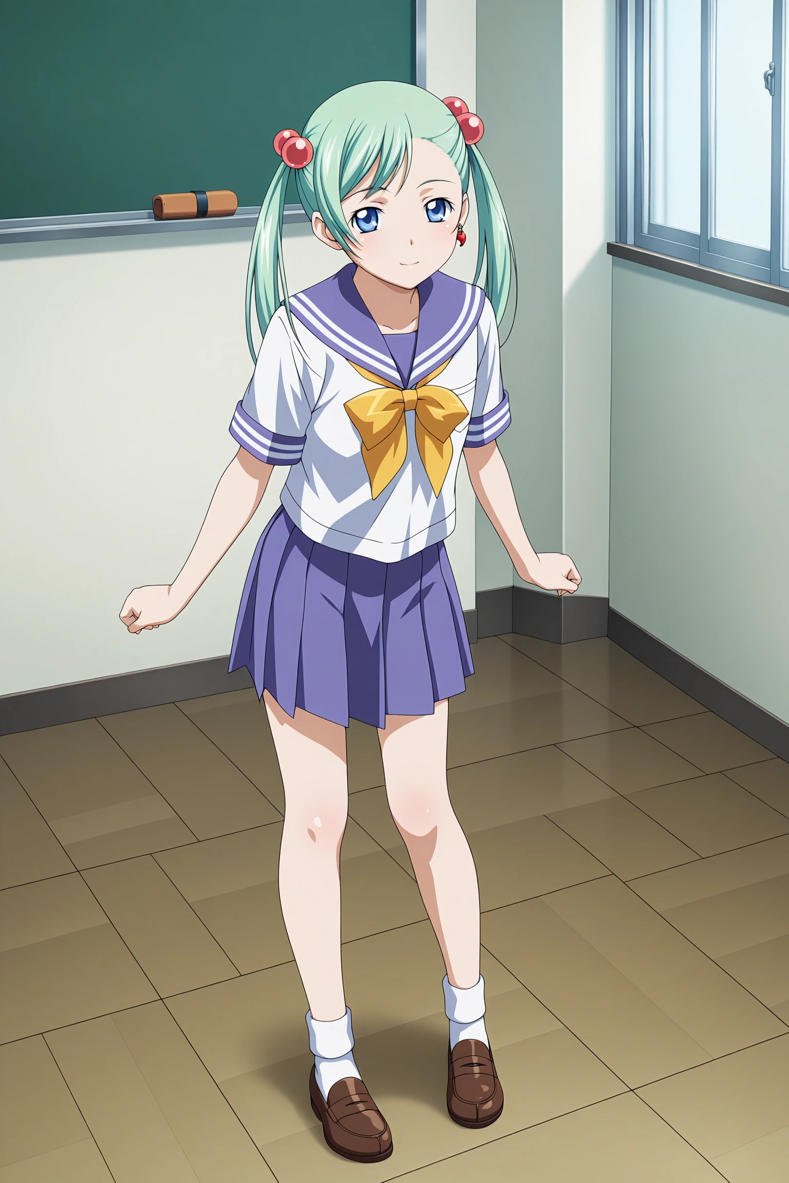 shokatsuryou koumei, long hair, green hair, twintails, hair bobbles, asymmetrical bangs, blue eyes, magatama earrings, single earring, short sleeves, yellow bowtie, purple sailor collar, purple skirt, pleated skirt, white socks, ankle socks, brown footwear, loafersDescription