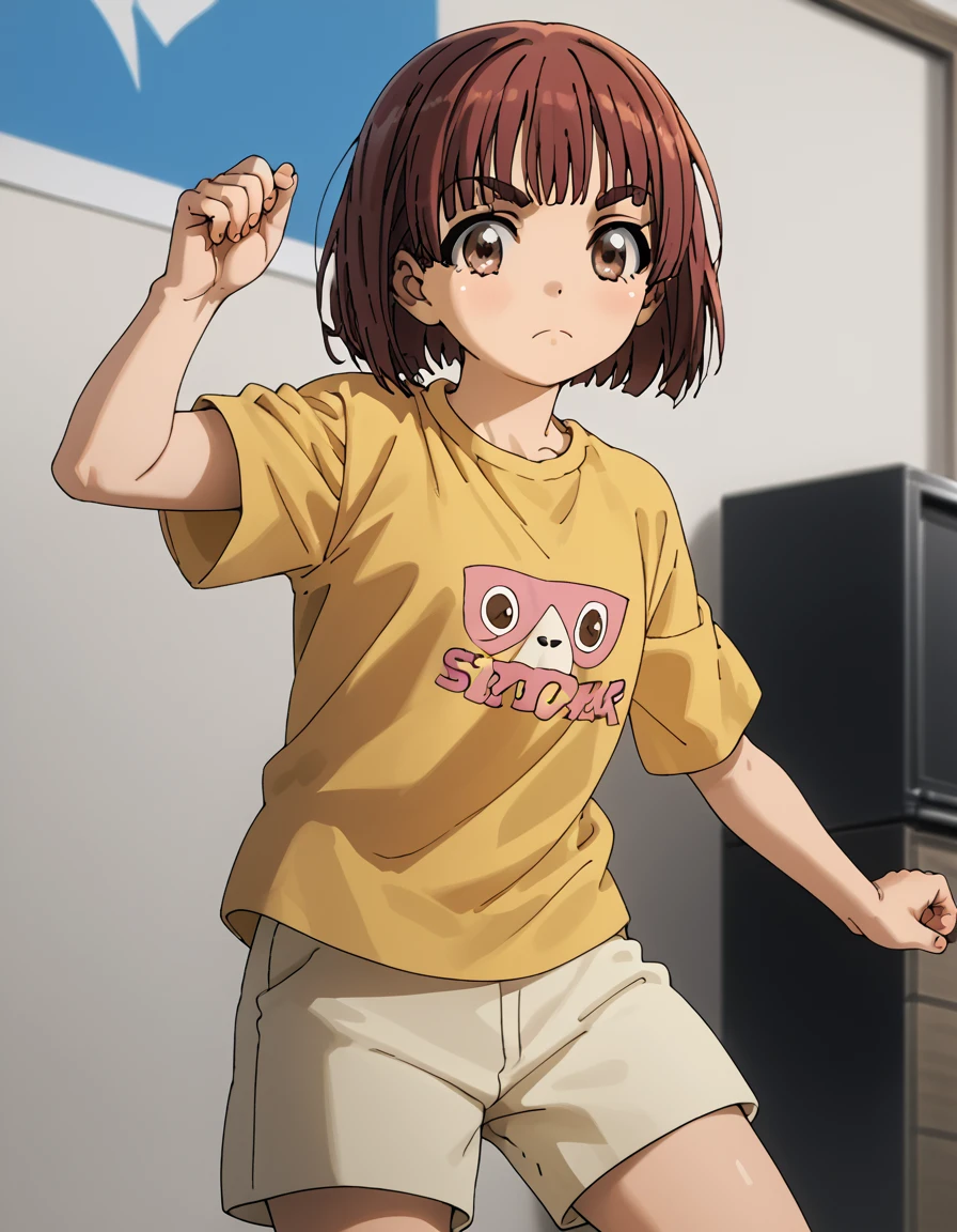 akari, shorts, brown hair, brown eyes, short hair, thick eyebrows, yellow shirt, short sleeves, t-shirt,