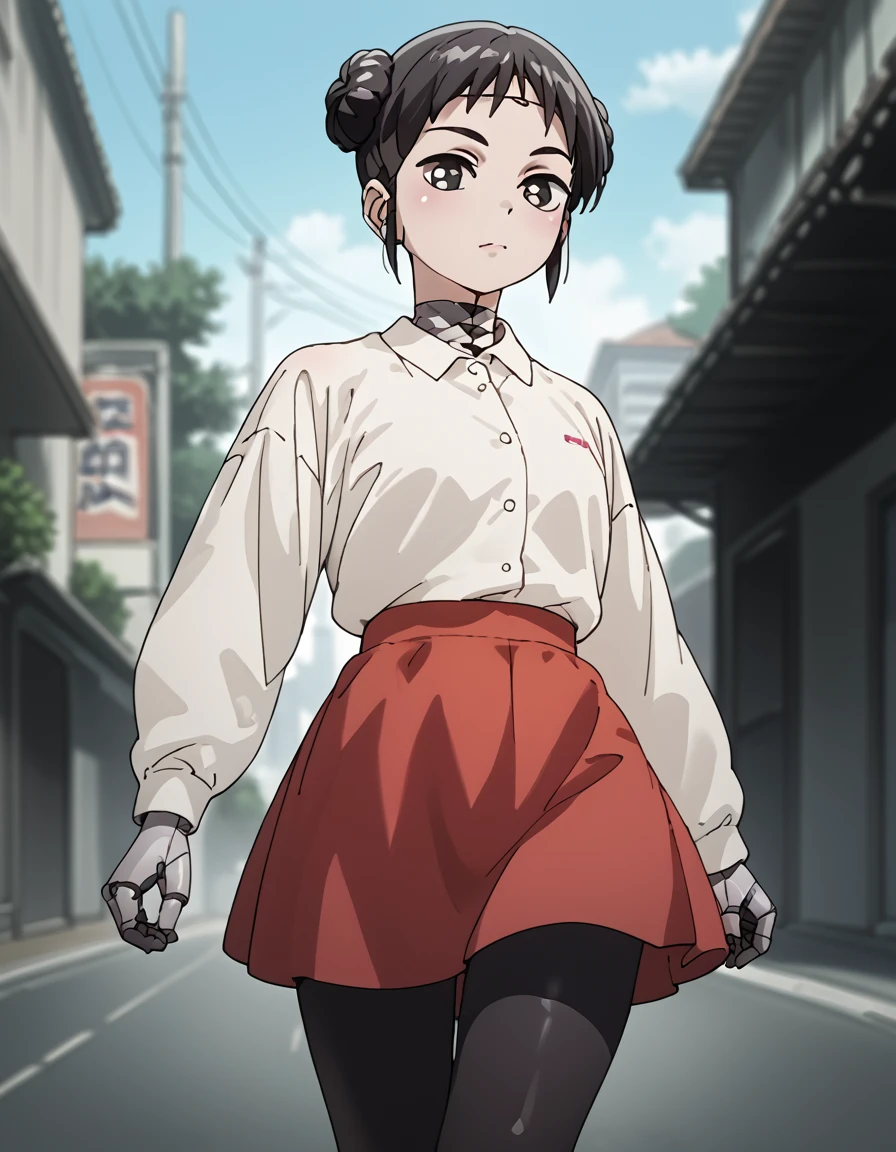 mina, android, robot, black hair, hair bun, double bun, short hair, black eyes, red skirt, black pantyhose,