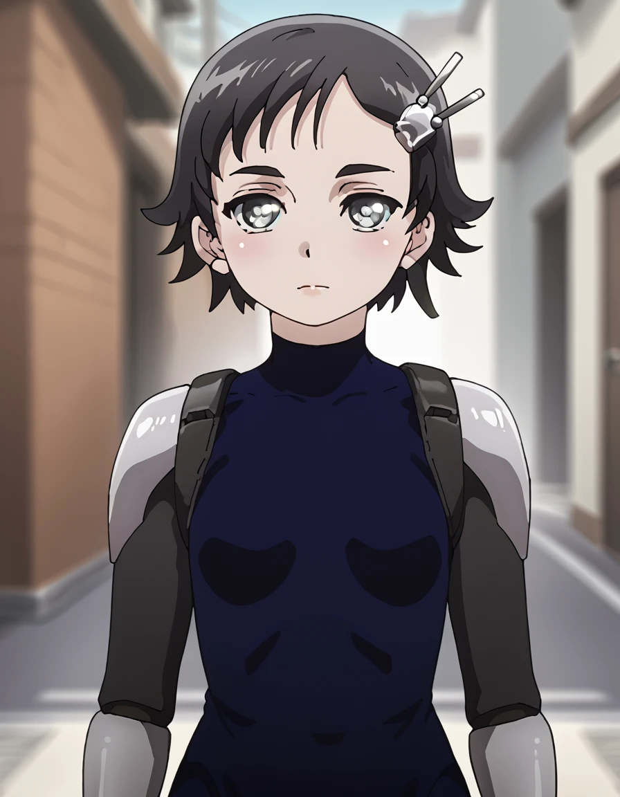 senju, android, robot, short hair, black hair, bodysuit, hair ornament, mechanical arms, grey eyes,