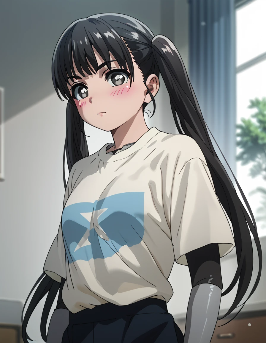 supermina, android, robot, twintails, black hair, long hair, blush, black eyes, shirt,