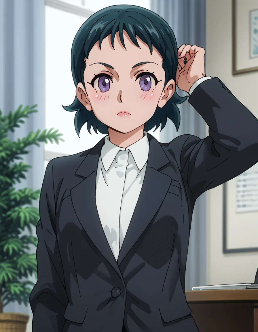 arisa, suit, formal, short hair, blush, office lady, purple eyes, jacket, black hair,