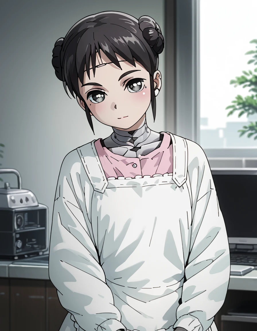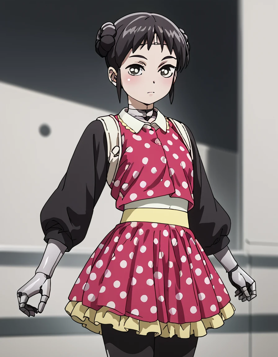mina, android, robot, black hair, hair bun, double bun, short hair, black eyes, polka dot skirt, pink skirt,