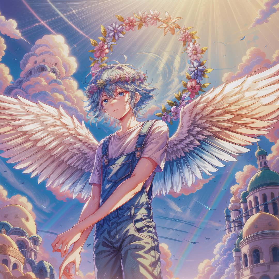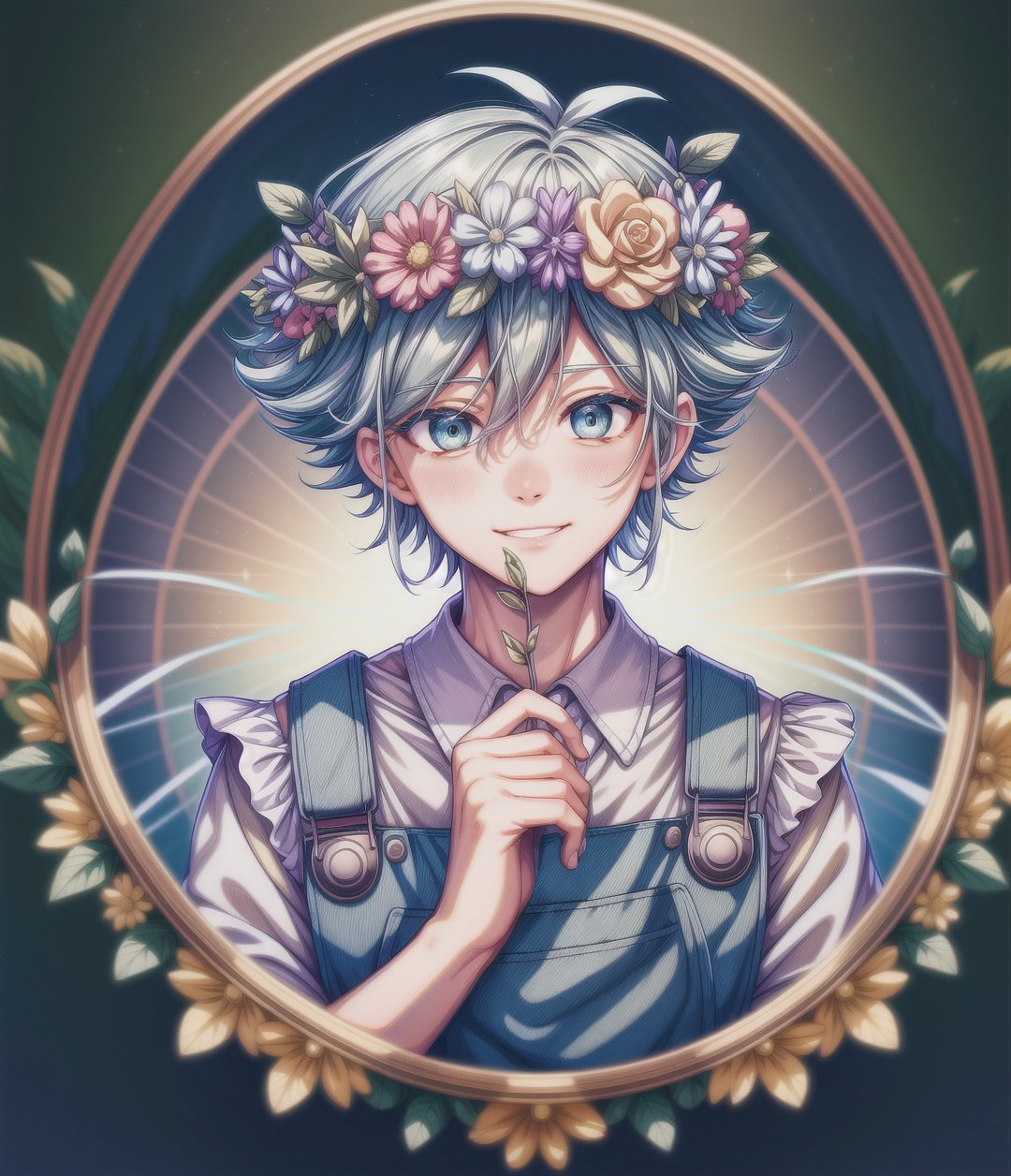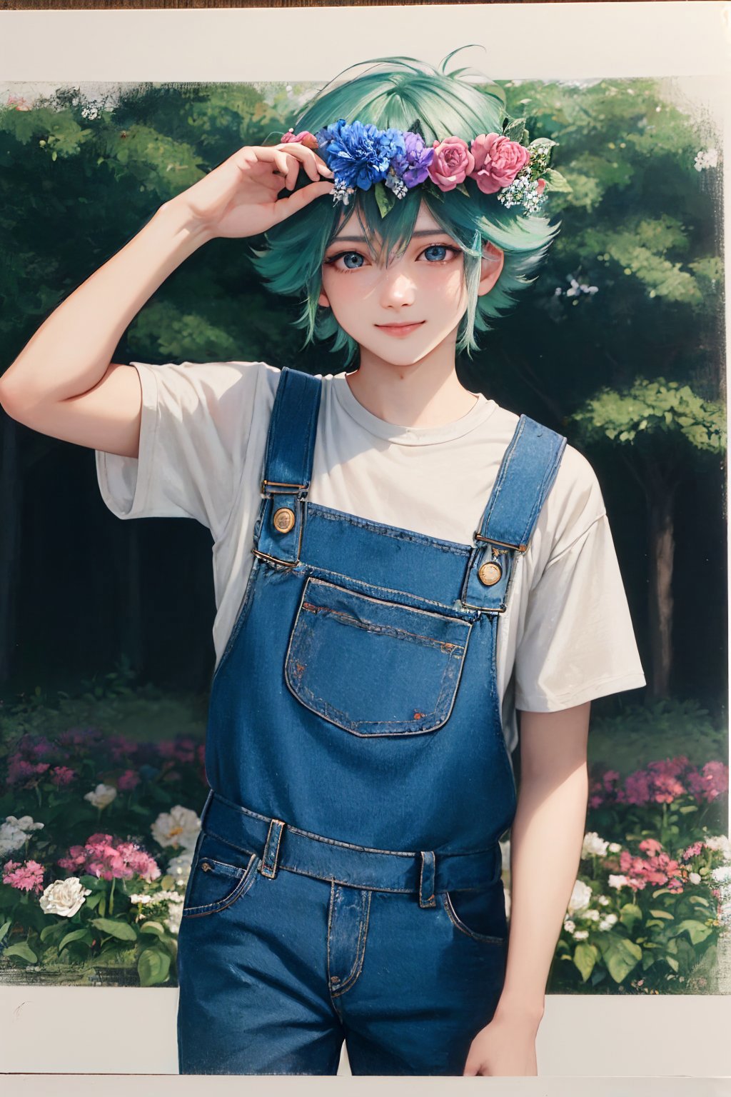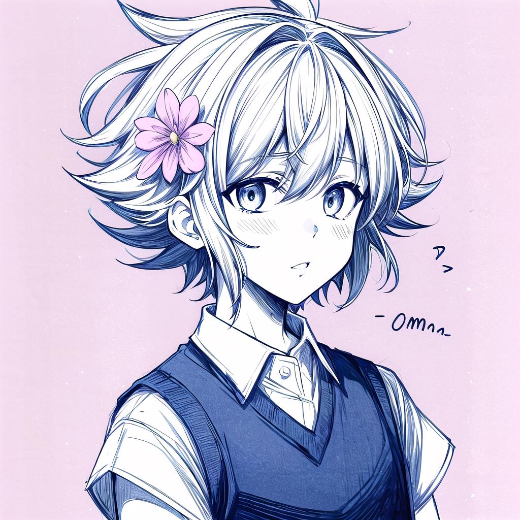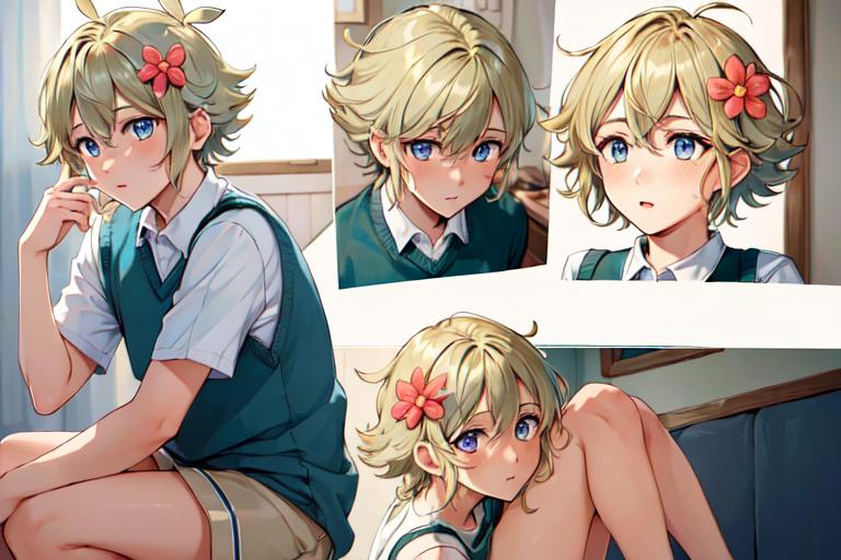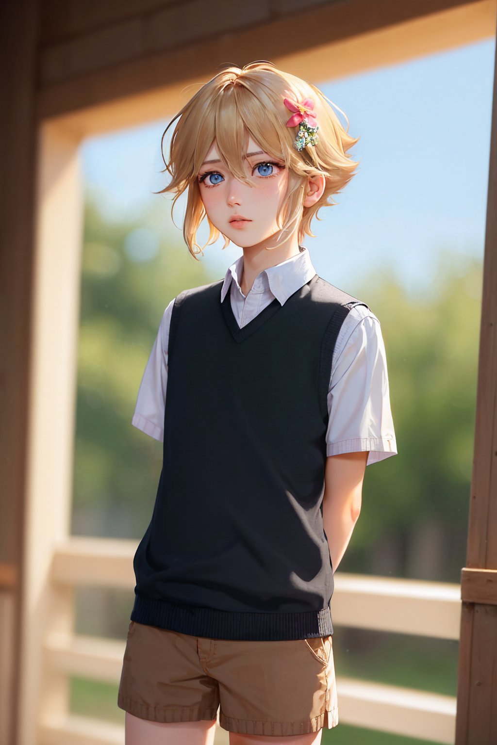 blonde hair, head flower, white shirt, short sleeves, sweater vest, brown shorts