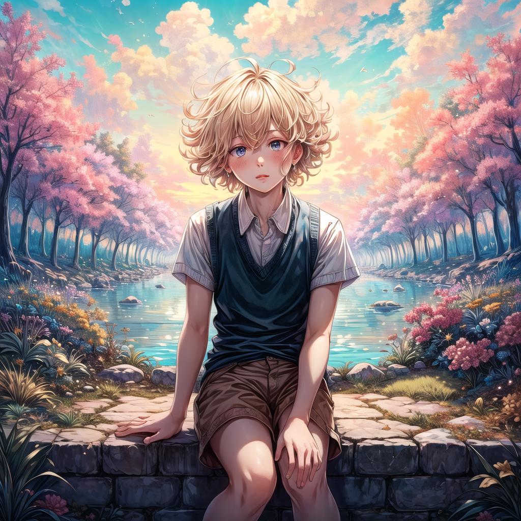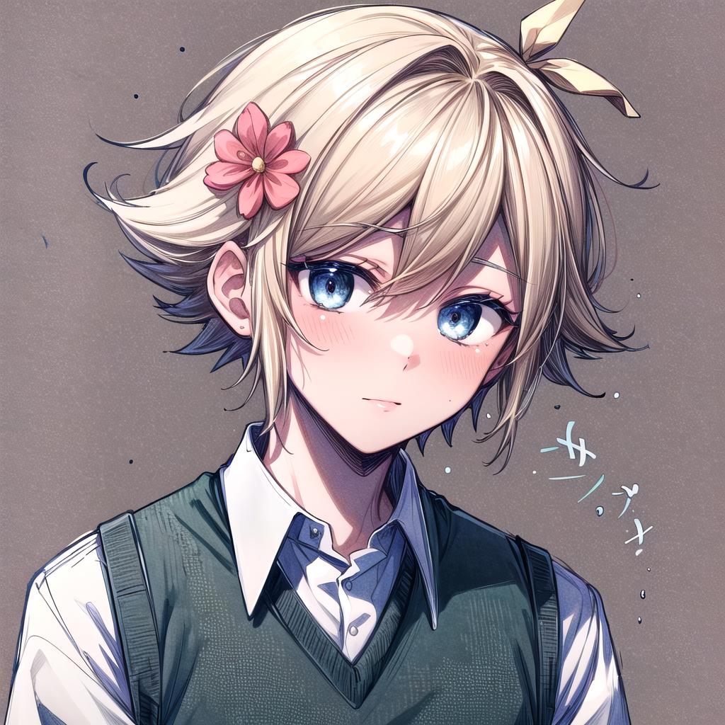Real World: blonde hair, head flower, white shirt, short sleeves, sweater vest, brown shorts