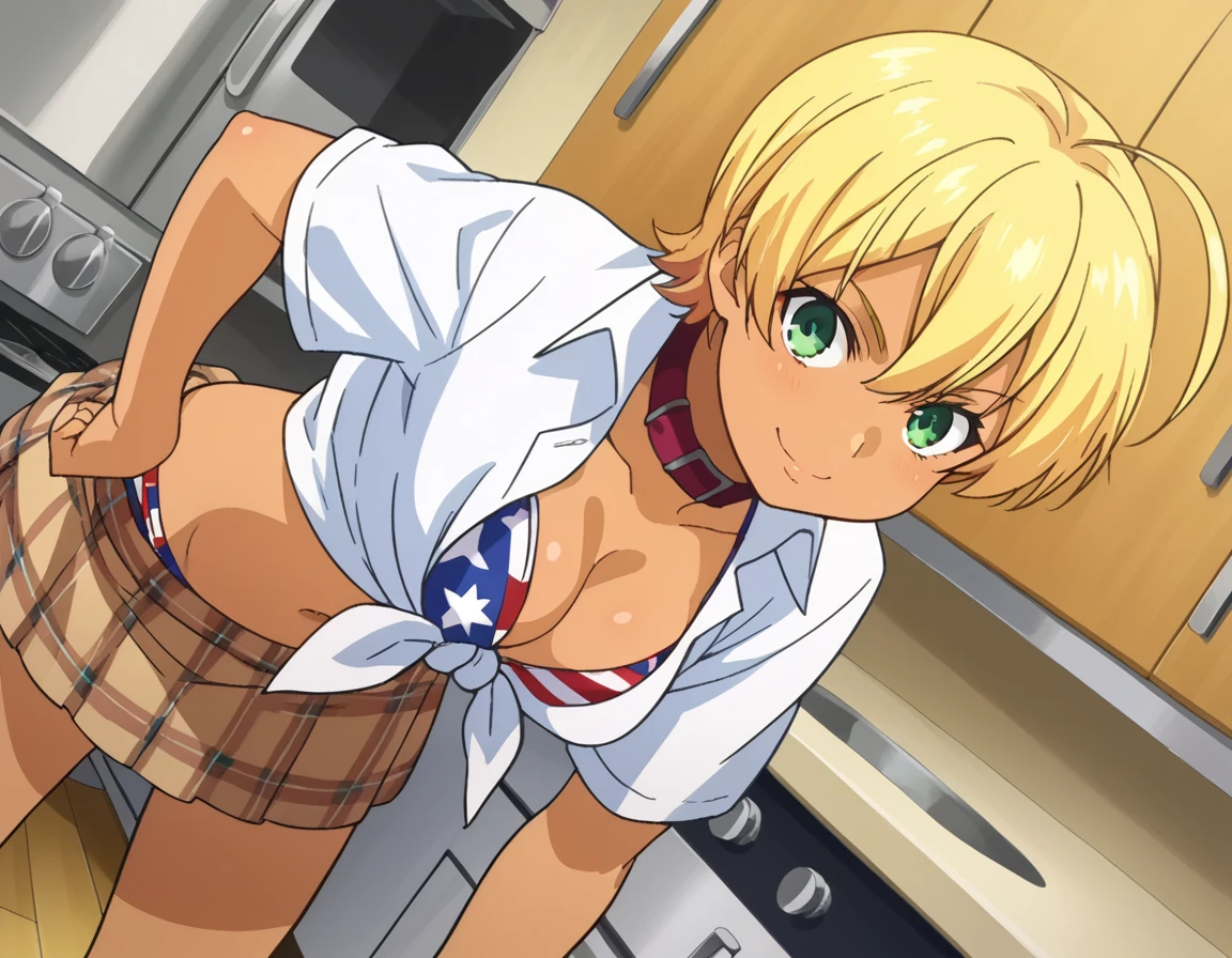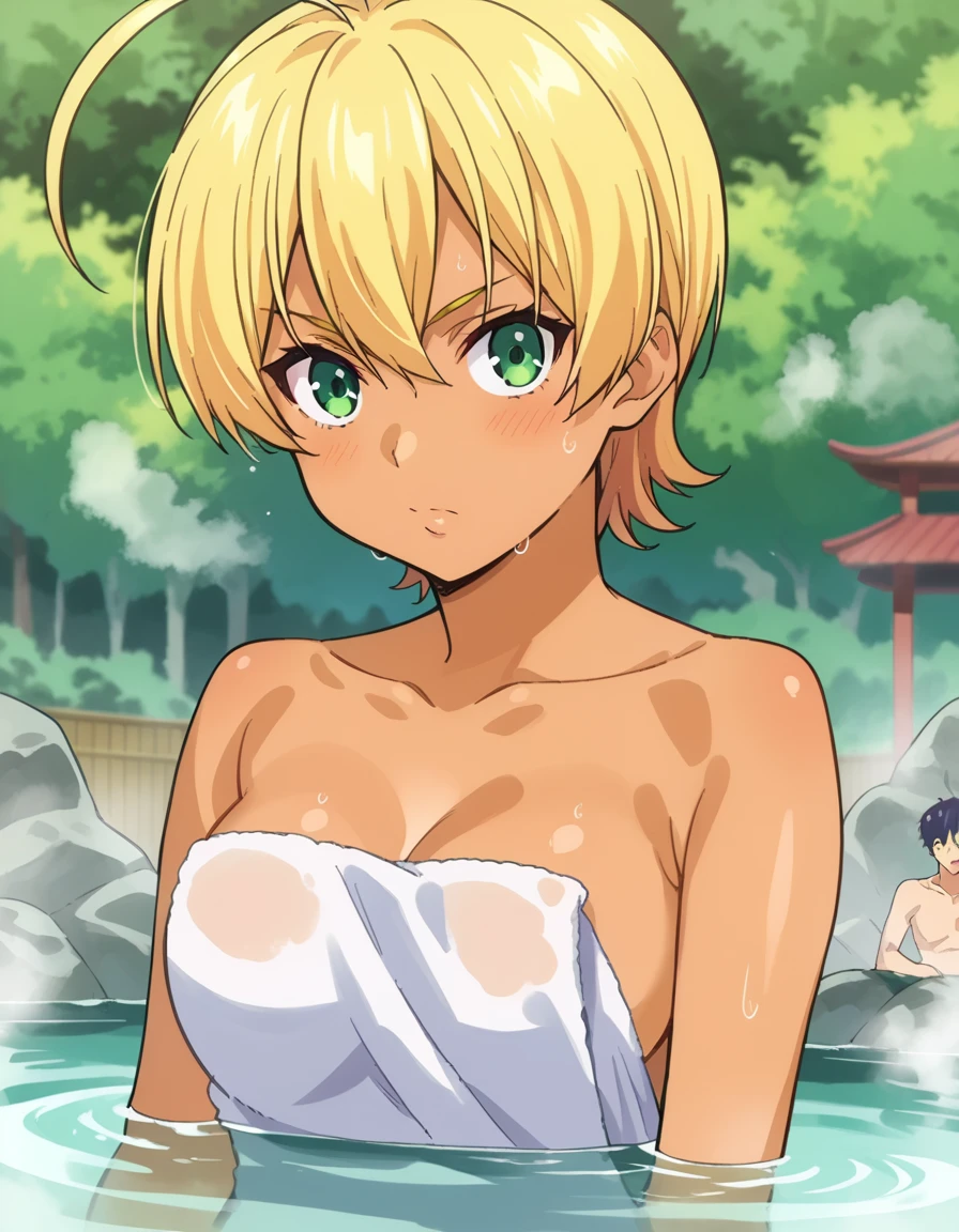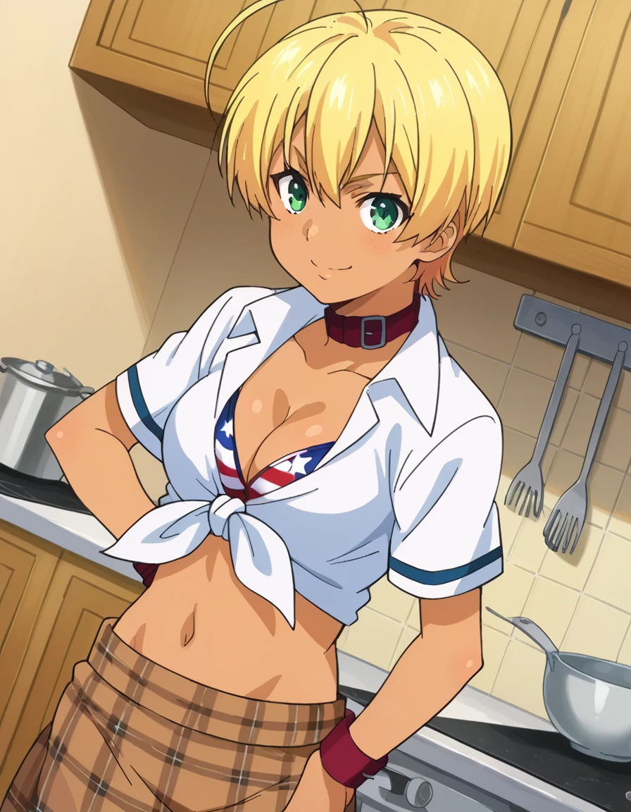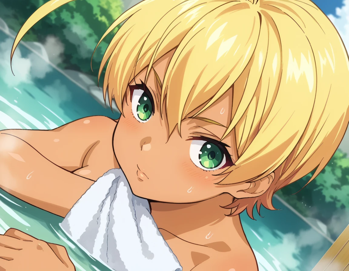 ikumi mito, short hair, blonde hair, green eyes, ahoge, dark skin, dark-skinned female,