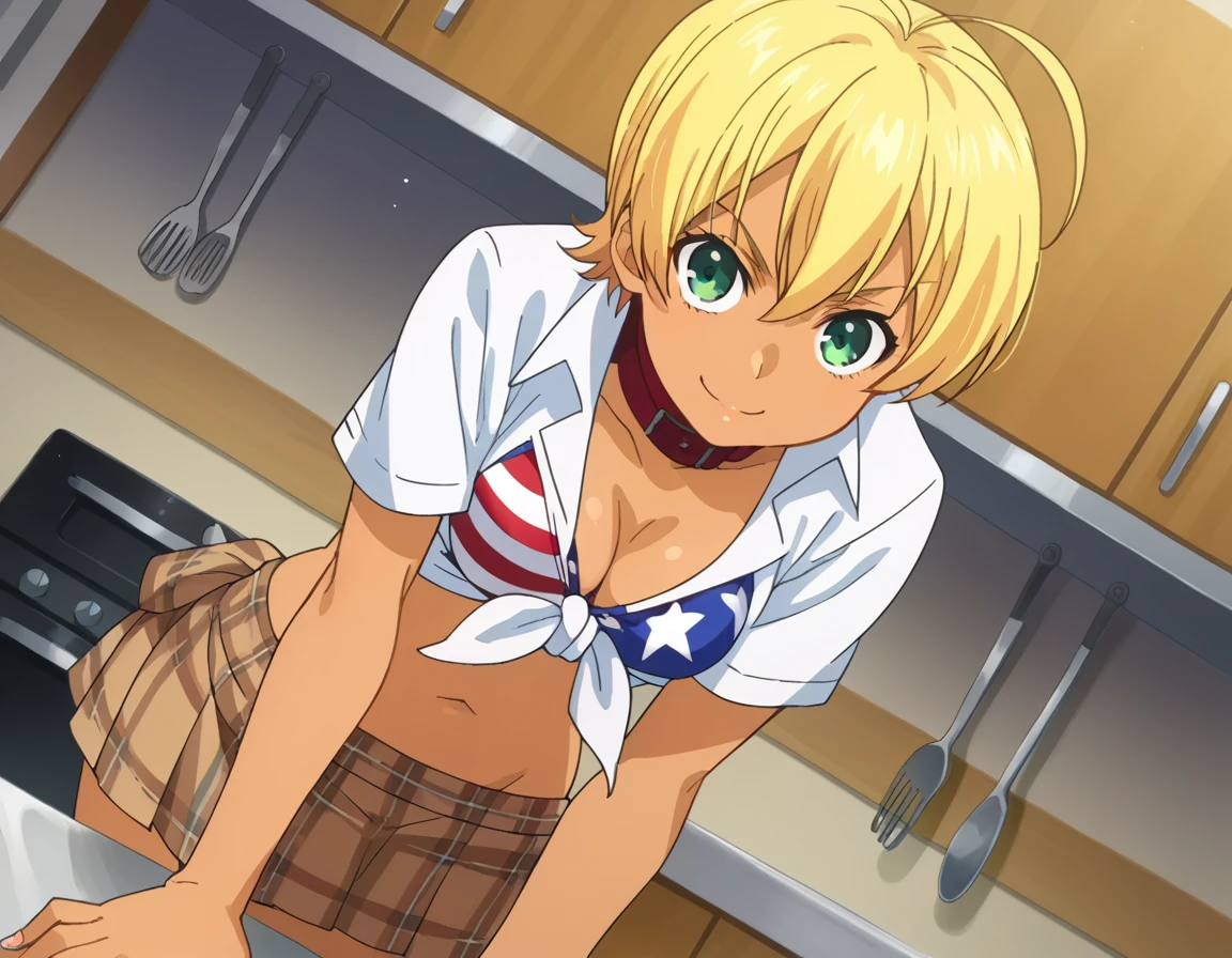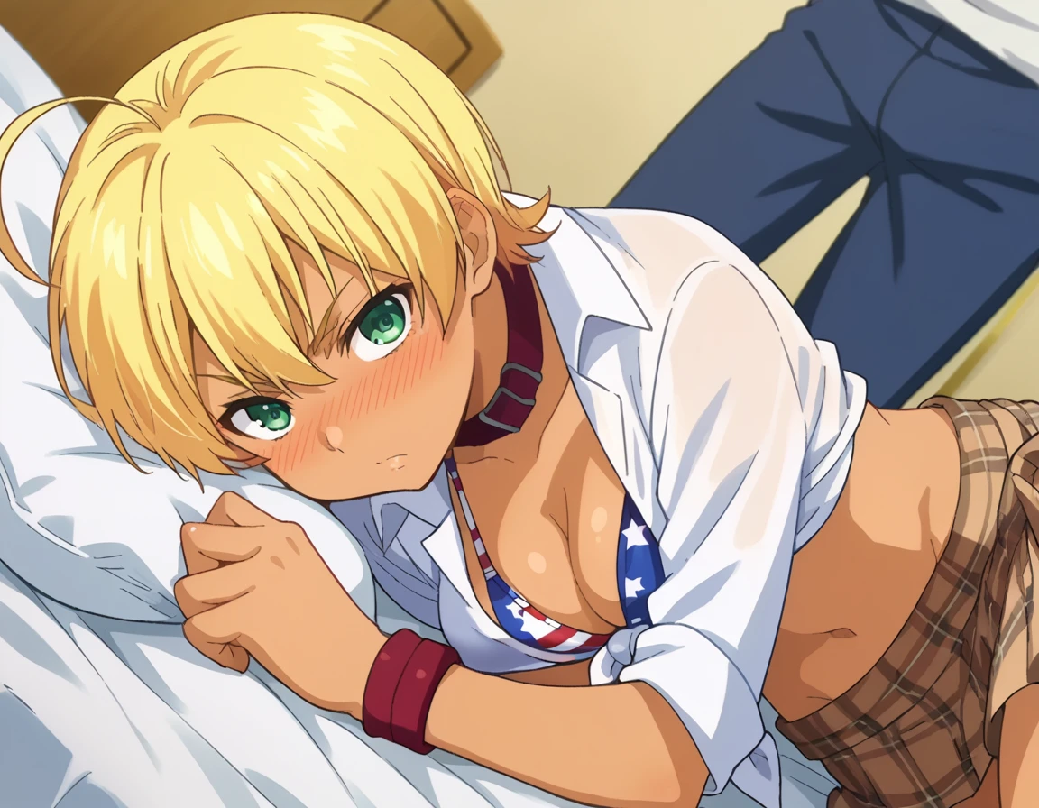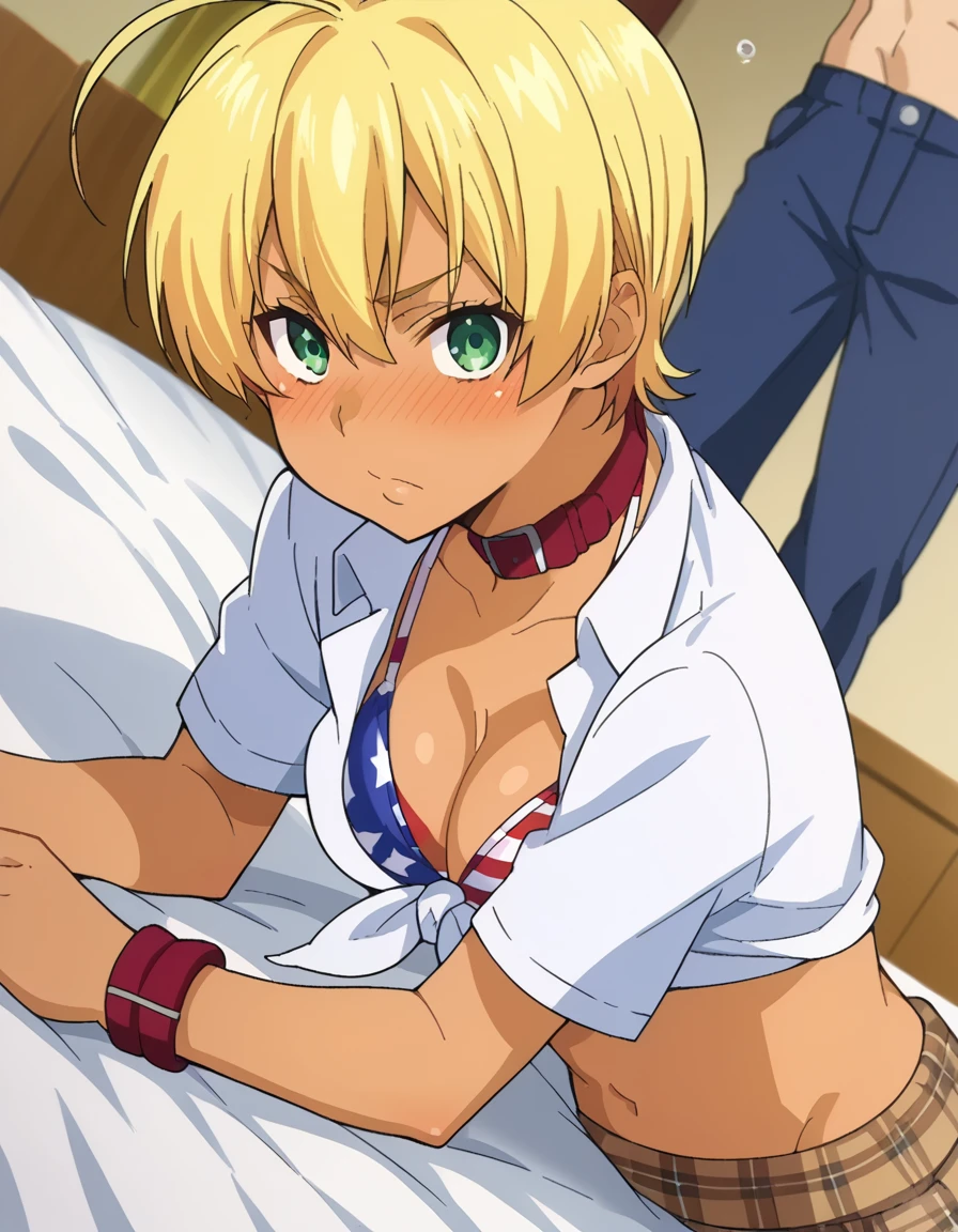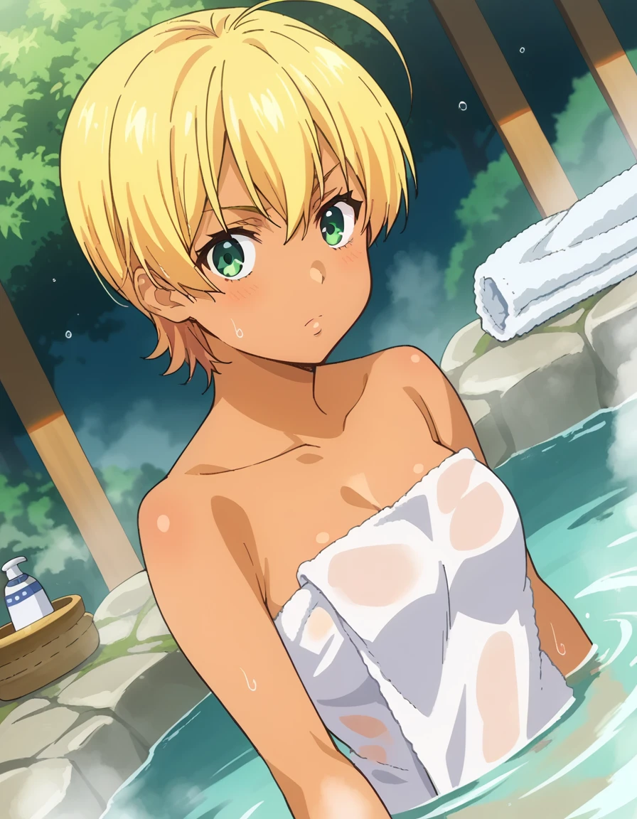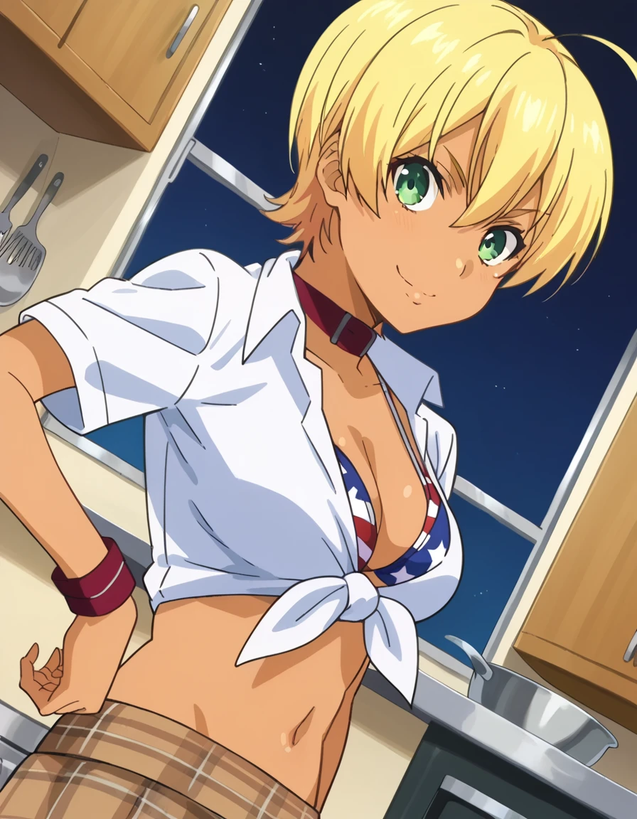 ikumi mito, short hair, blonde hair, green eyes, ahoge, dark skin, dark-skinned female,