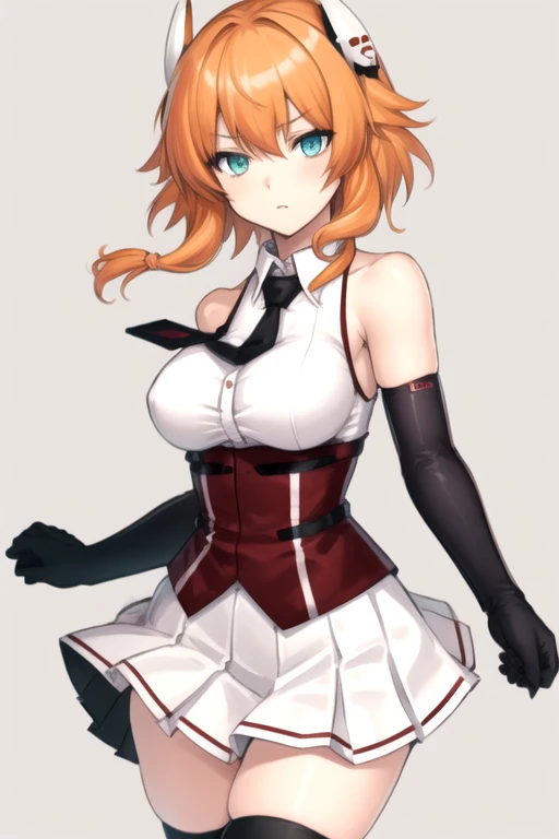 RuiMishima, 1girl, solo, short hair with long locks, miniskirt, large breasts, white shirt, hair ornament, black thighhighs, black gloves, bare shoulders, aqua eyes, sidelocks, pleated skirt, black necktie, sleeveless, elbow gloves, collared shirt, orange hair, white skirt, taut clothes