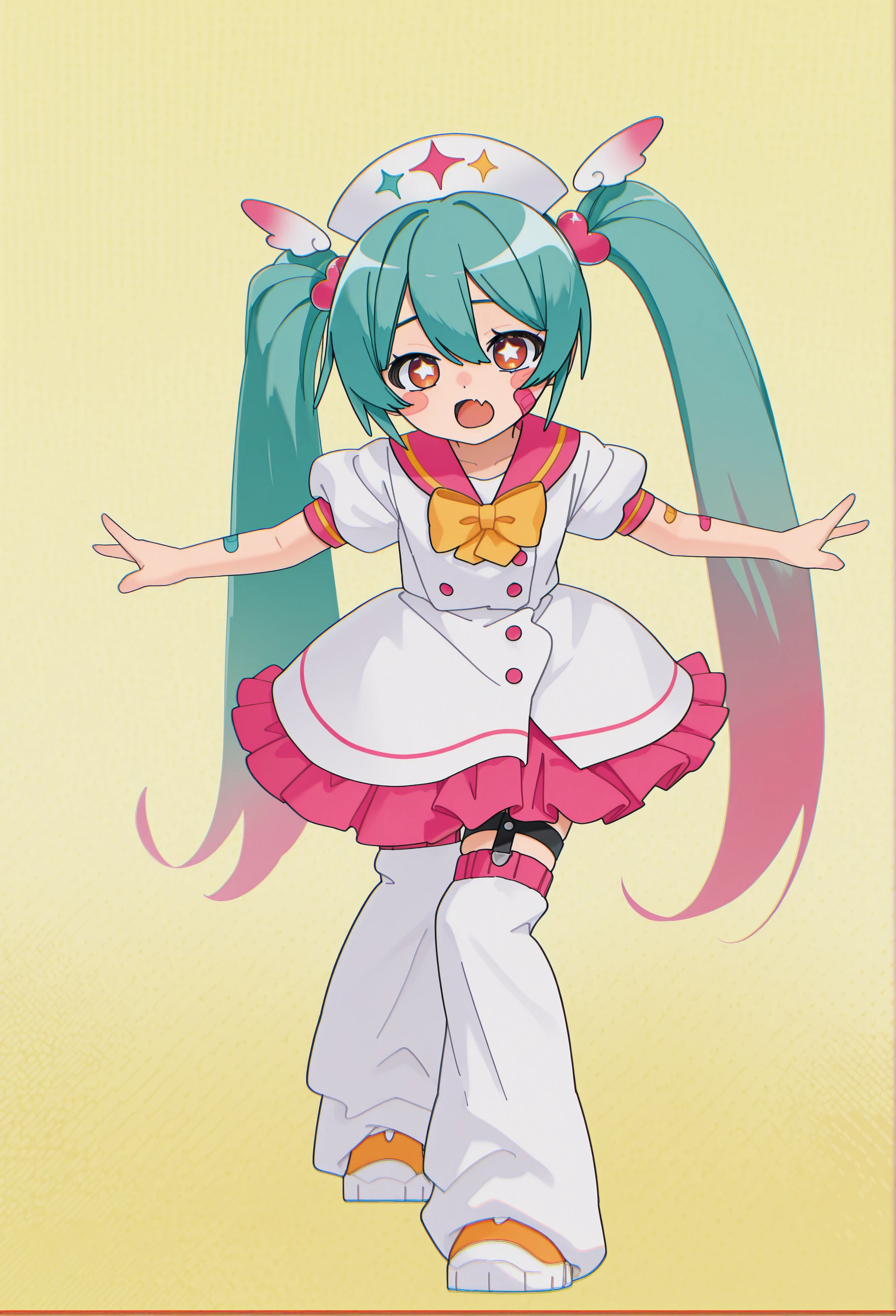 nurse cap, very long hair, wing hair ornament, heart hair ornament, hair between eyes, twintails, gradient hair, aqua hair, pink hair, red eyes, orange eyes, star-shaped pupils, skin fang, bandaid on face, blush stickers, yellow bowtie, puffy short sleeves, bandaid on arm, pink buttons, white dress, pink skirt, pink sailor collar, frilled dress, white leg warmers, single garter strap, footwear