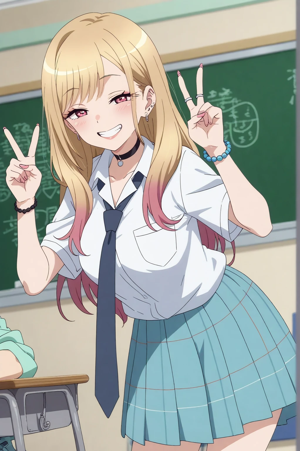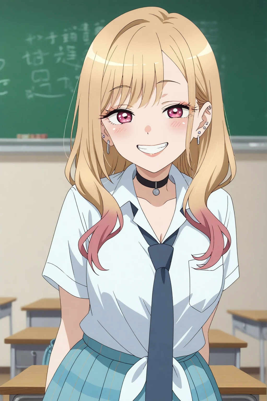 Triggers : Outfit 1 : marin kitagawa,mature,bangs,choker,shirt,piercing,ear piercing,earrings,multicolored hair,breasts,necktie,school uniform,skirt
