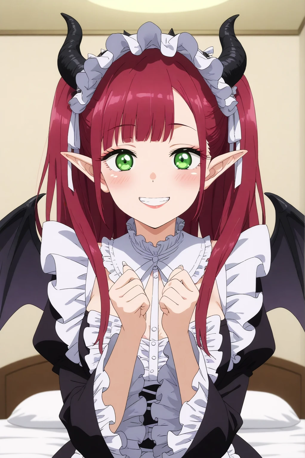 2 : marin kitagawa,green eyes, horns,mature, cosplay, solo, pointy ears, wings, red hair, demon wings, long hair, demon horns, blunt bangs, long sleeves, demon girl, blush, sidelocks, frills, smile,teeth, puffy sleeves, black wings, indoors, twintails, black horns, white ribbon