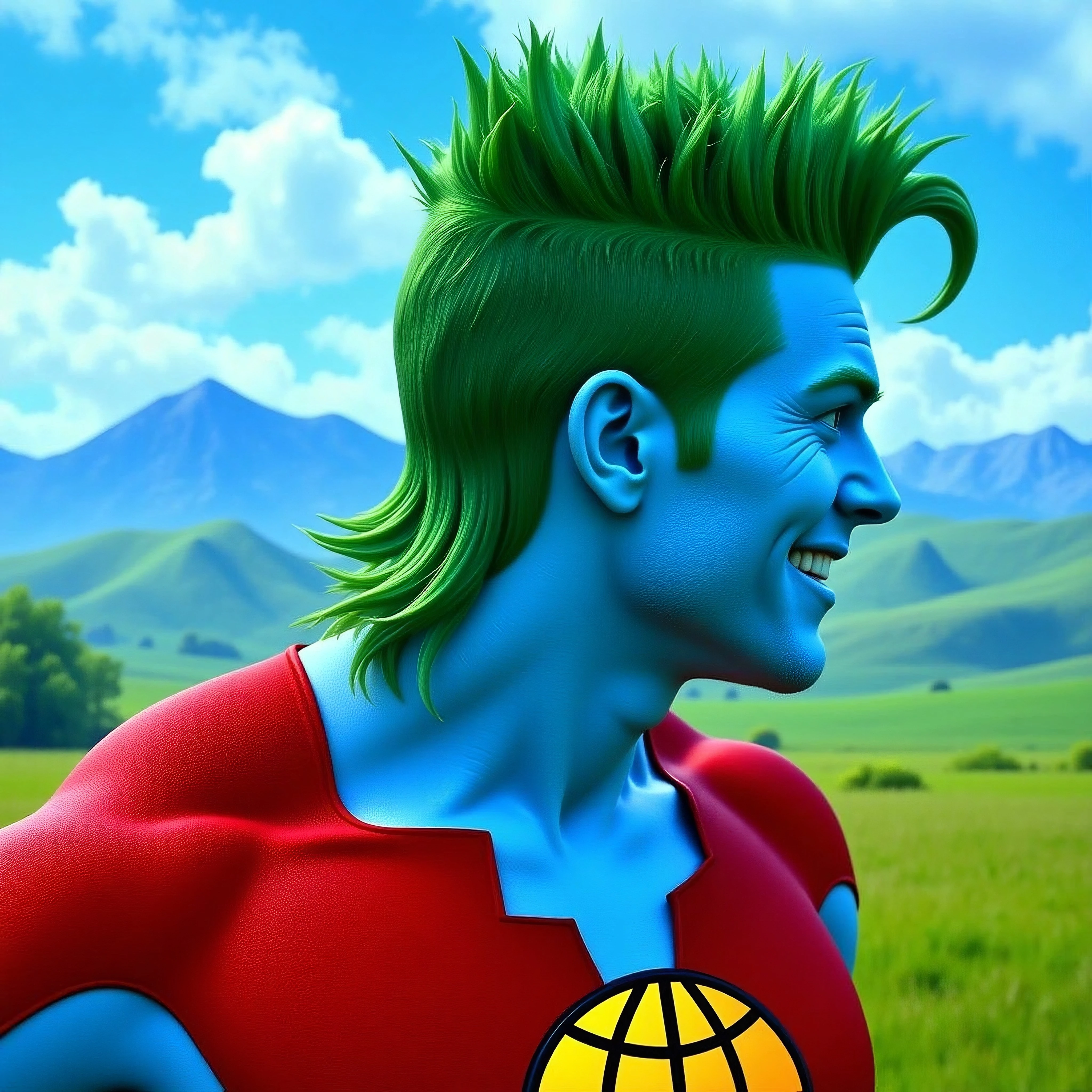 captplanet, cplant, captplant, muscular male, superhero, blue character, vibrant blue skin, blue face, handsome, perfect skin, green spiky hair, vibrant green hair, green eyebrows, vibrant green eyebrows, yellow pupils, glowing yellow eyes, white teeth, friendly smile, yellow emblem on chest, round chest emblem, red cropped top, red top with v-neck, short red shorts, red gloves, red hands, red fingers, black belt, yellow rectangle belt buckle, red boots, heroic, confident pose, joyful expression, natural lighting, medium close-up, elemental powers, glowing energy, environmental superhero, powerful aura