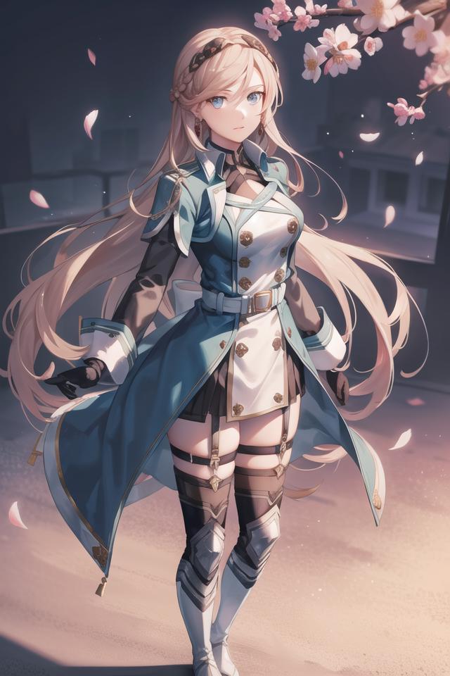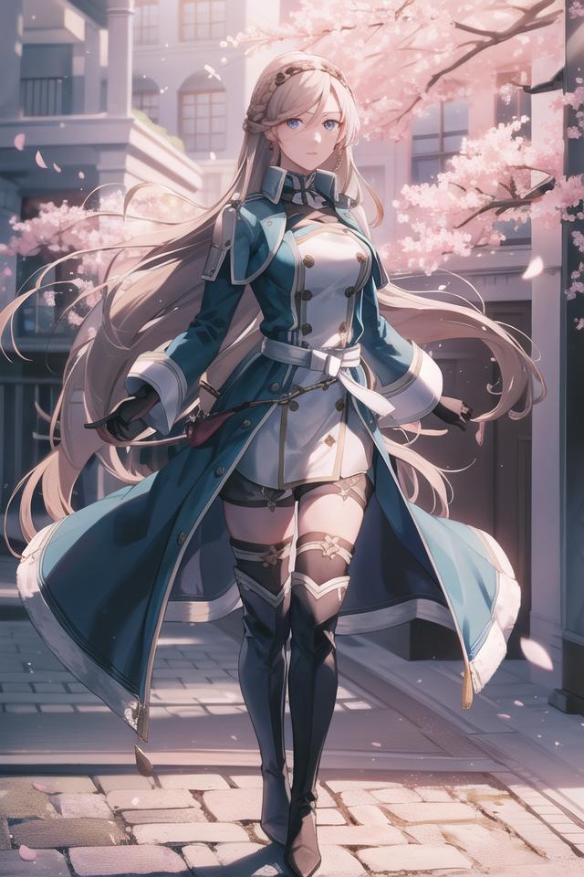 elaineauclair, long hair, 1girl, braid, crown braid, jewelry, earrings, gloves, medium breasts, jacket, choker, thighhighs, hair between eyes, cleavage, shorts, thigh boots,