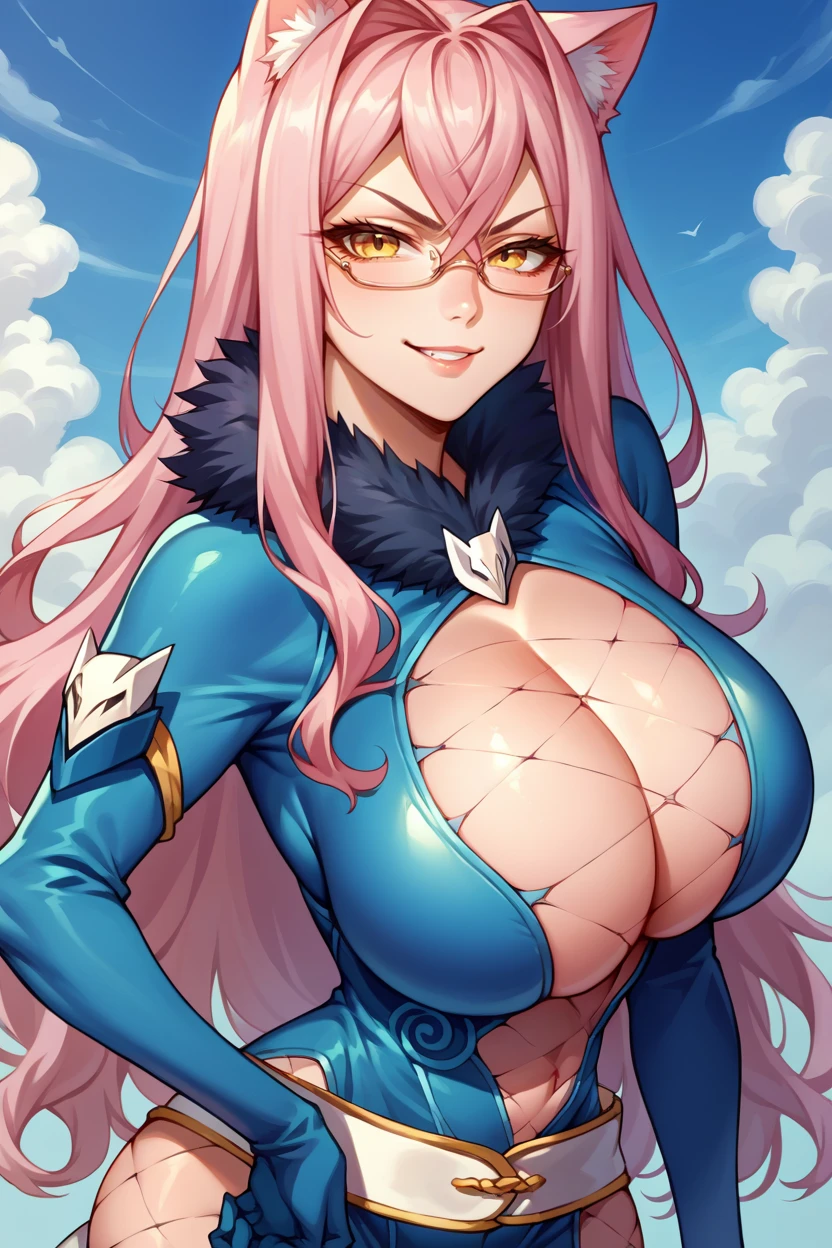 glasses, fur choker, blue bodysuit, center opening, cleavage, belt, fishnets, blue gloves, huge breasts