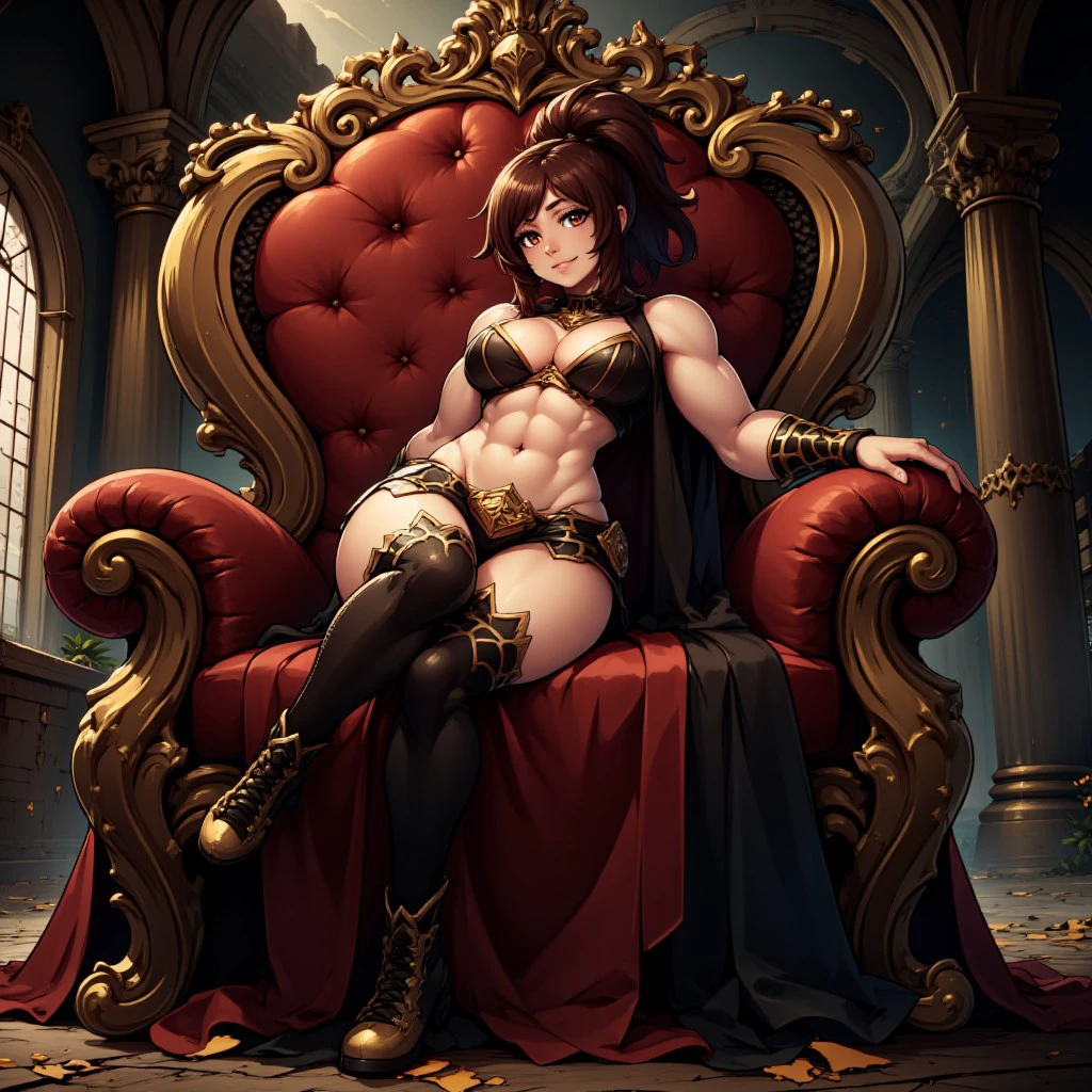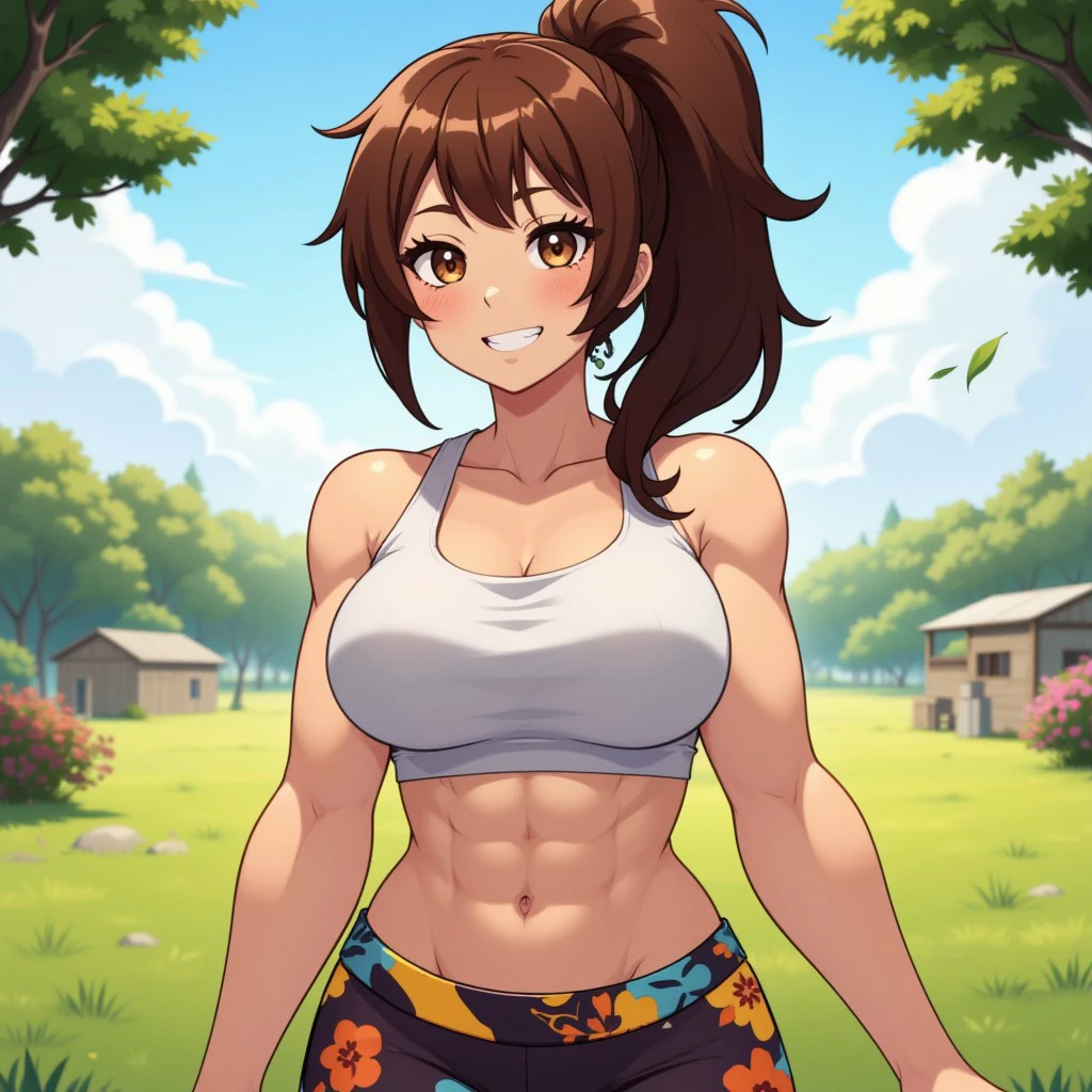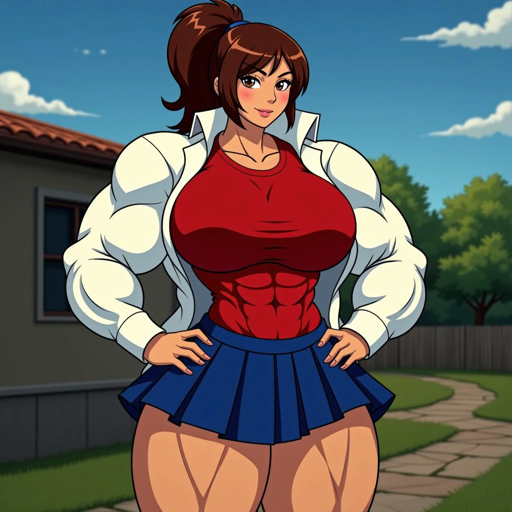 Recommend words: 1girl,solo,muscular,ponytail,brown hair,brown eyes for original clothing red shirt, pleated blue skirt