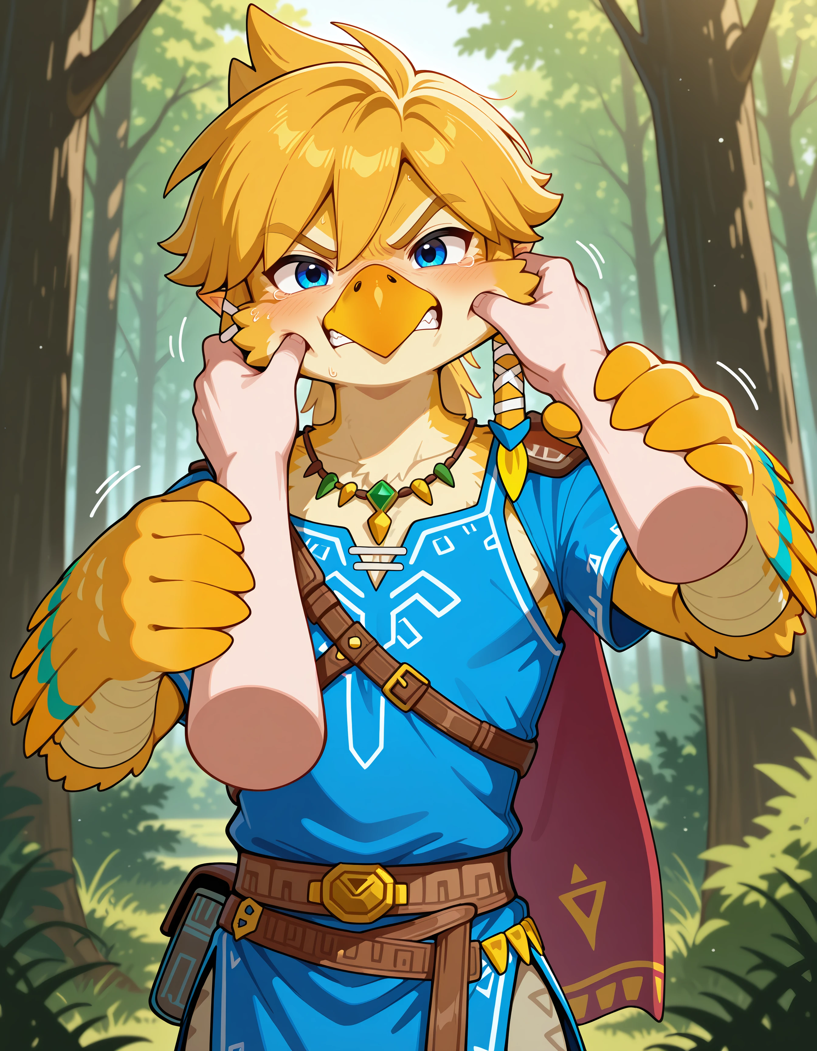 avian, rito, yellow body, yellow feathers, blue eyes, the legend of zelda