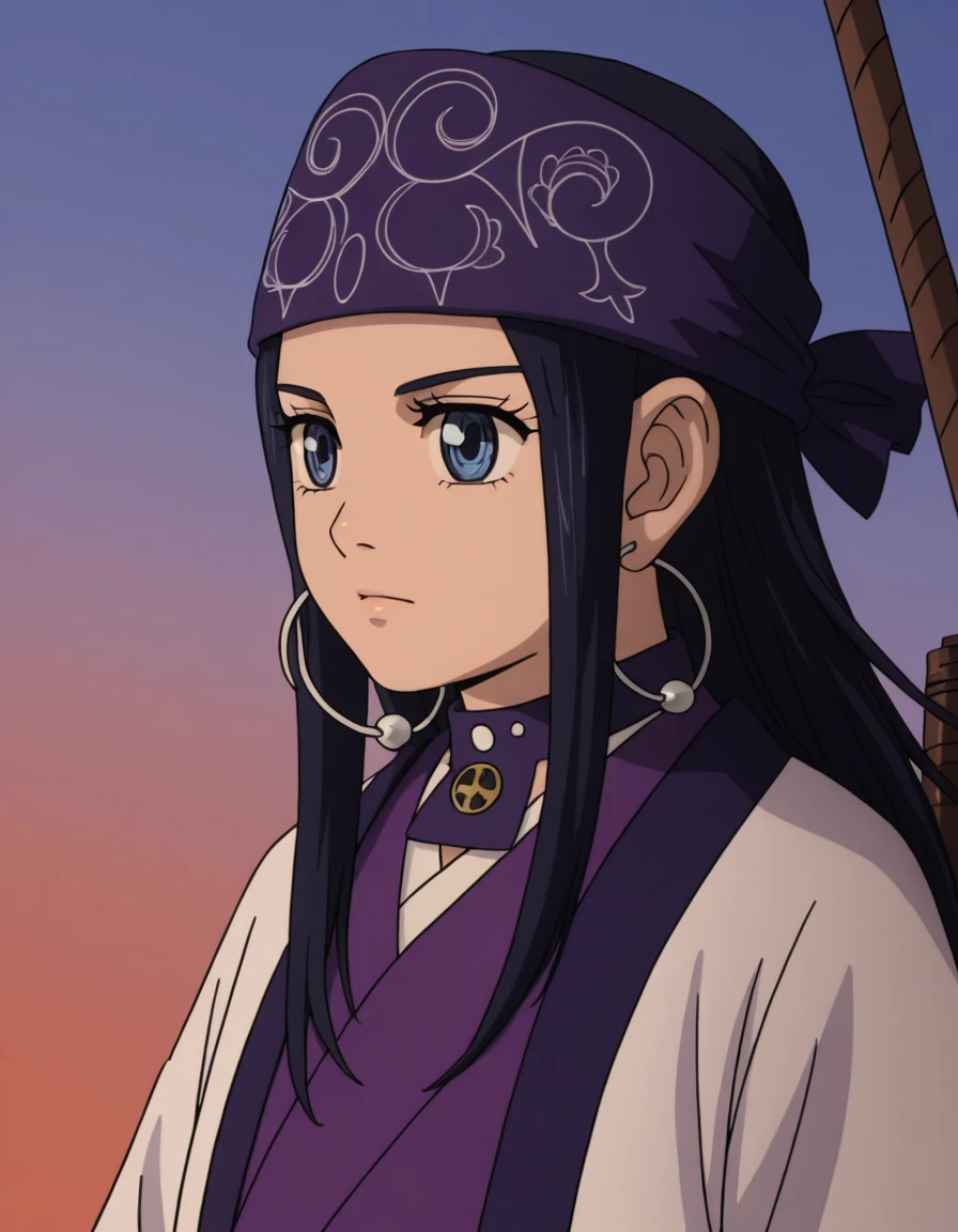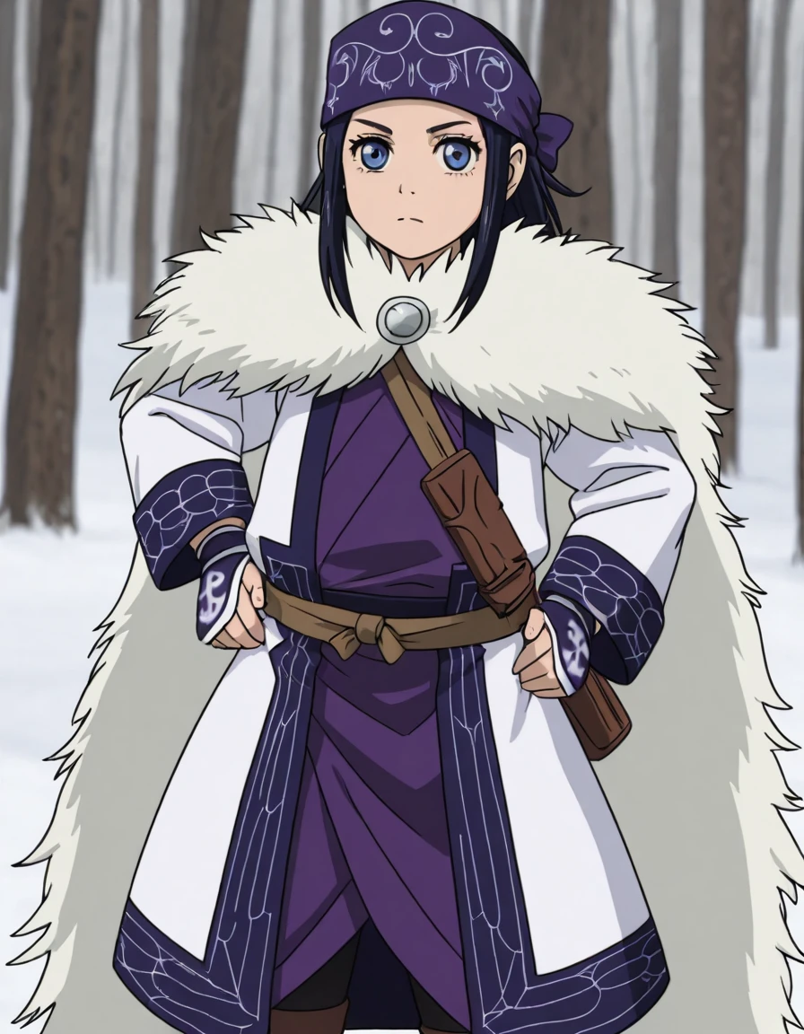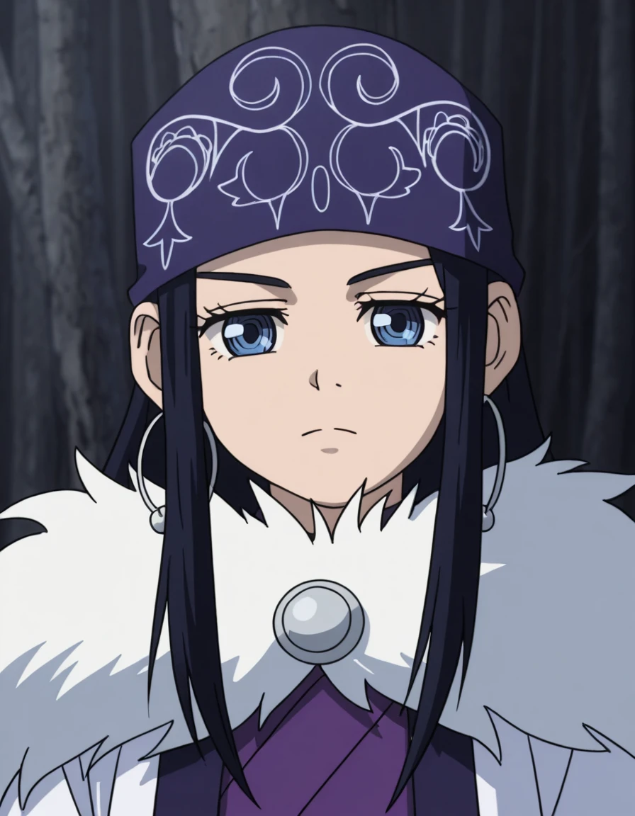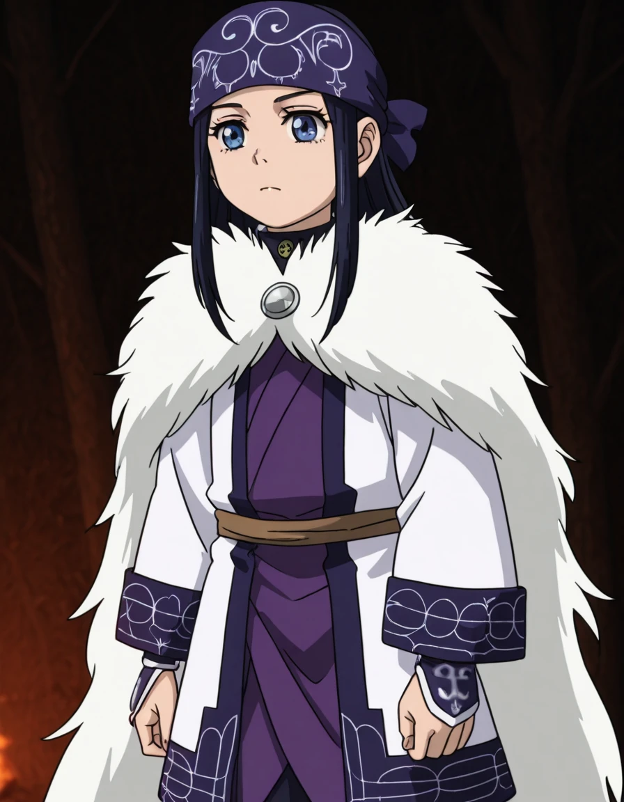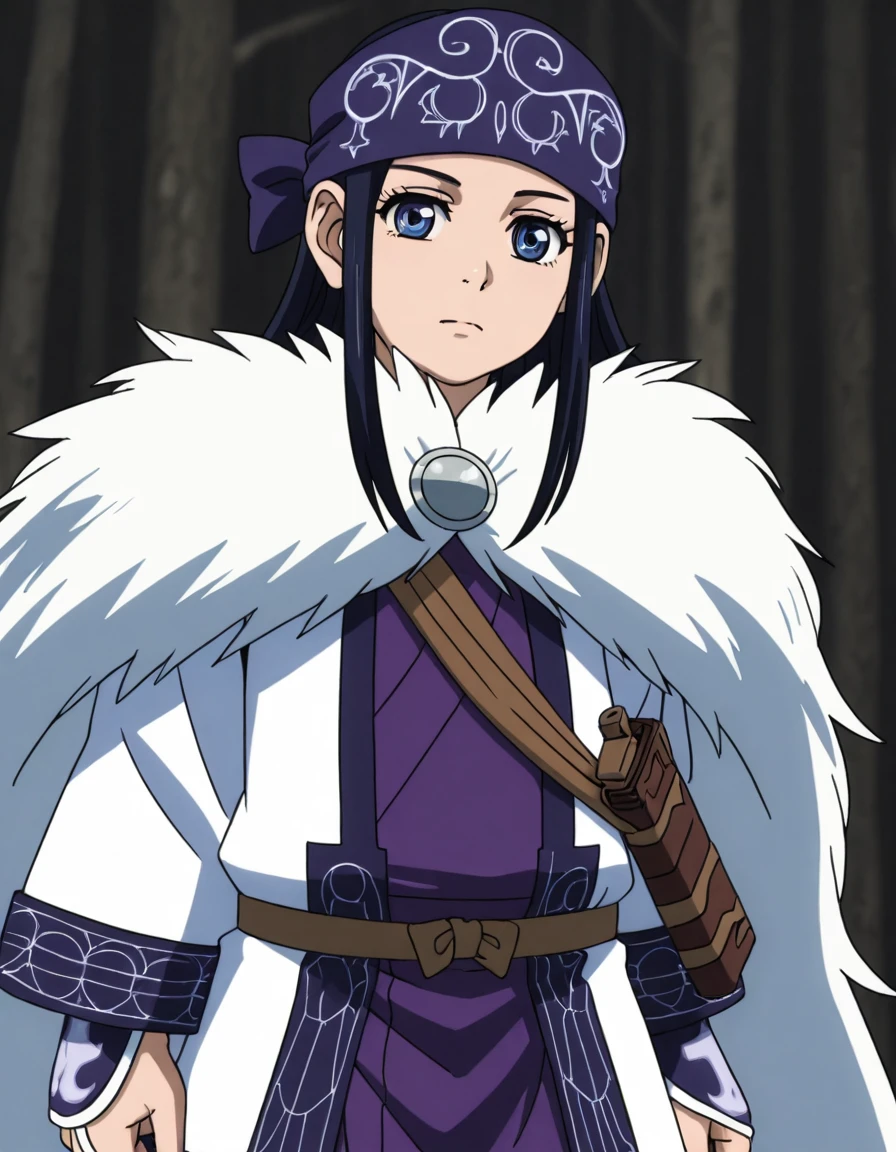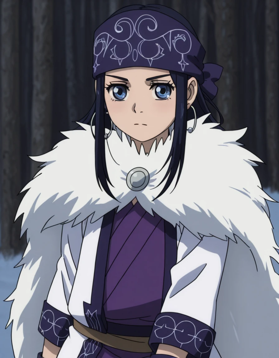 asirpaYout, 1girl, solo, long hair, black hair, blue eyes, bandana, ainu clothes, cape, fur cape,