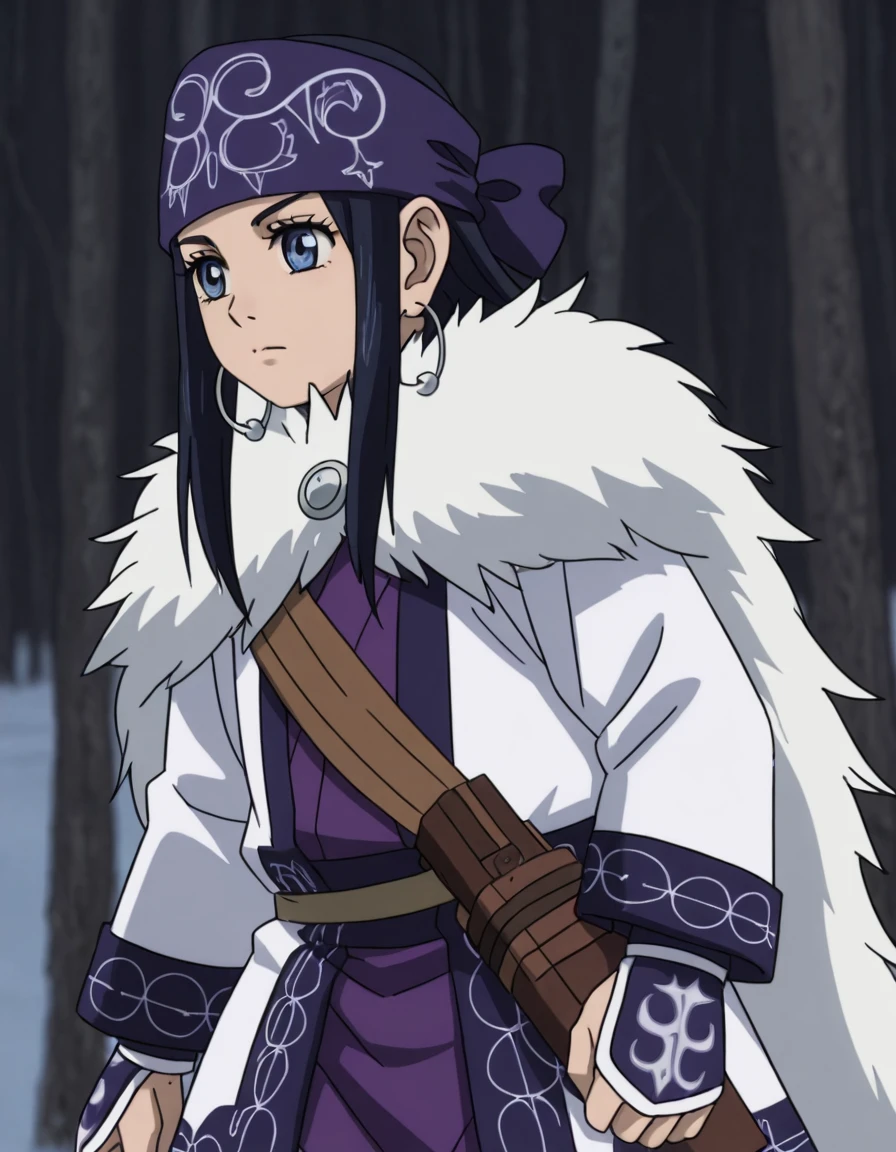 asirpaOUT, 1girl, solo, long hair, black hair, blue eyes, earrings, hoop earrings, jewelry, bandana, ainu clothes, cape, fur cape, boots, fur boots,