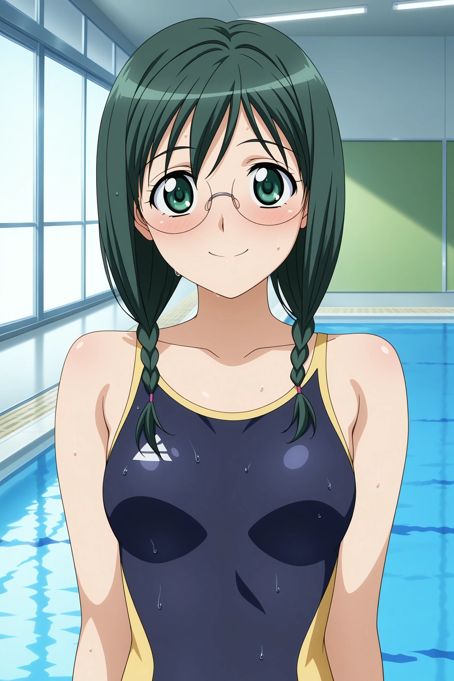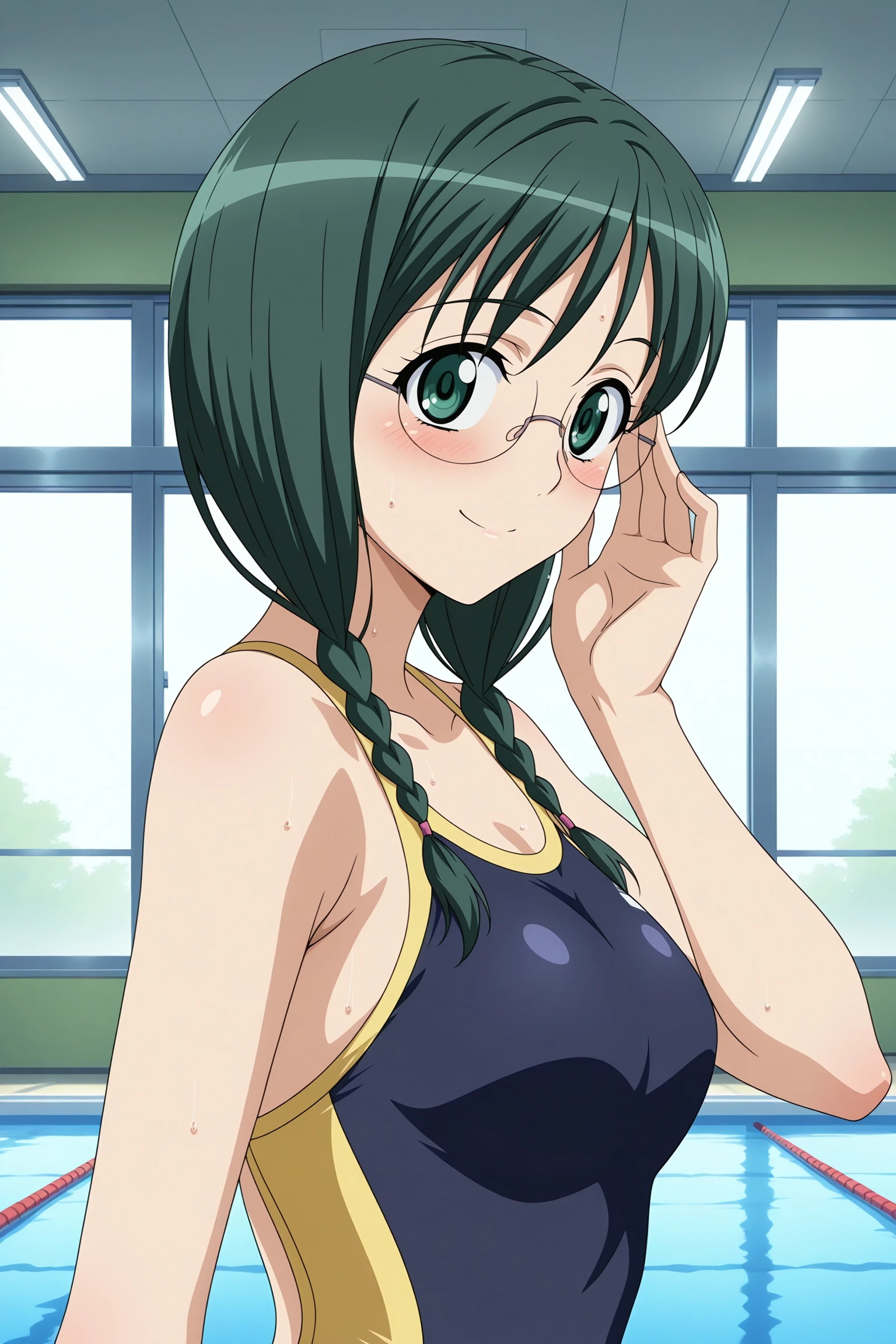 satou ayano, medium hair, green hair, low twin braids, hair tie, wispy bangs. green eyes, round eyewear, two-tone one-piece swimsuit, competition swimsuitDescription