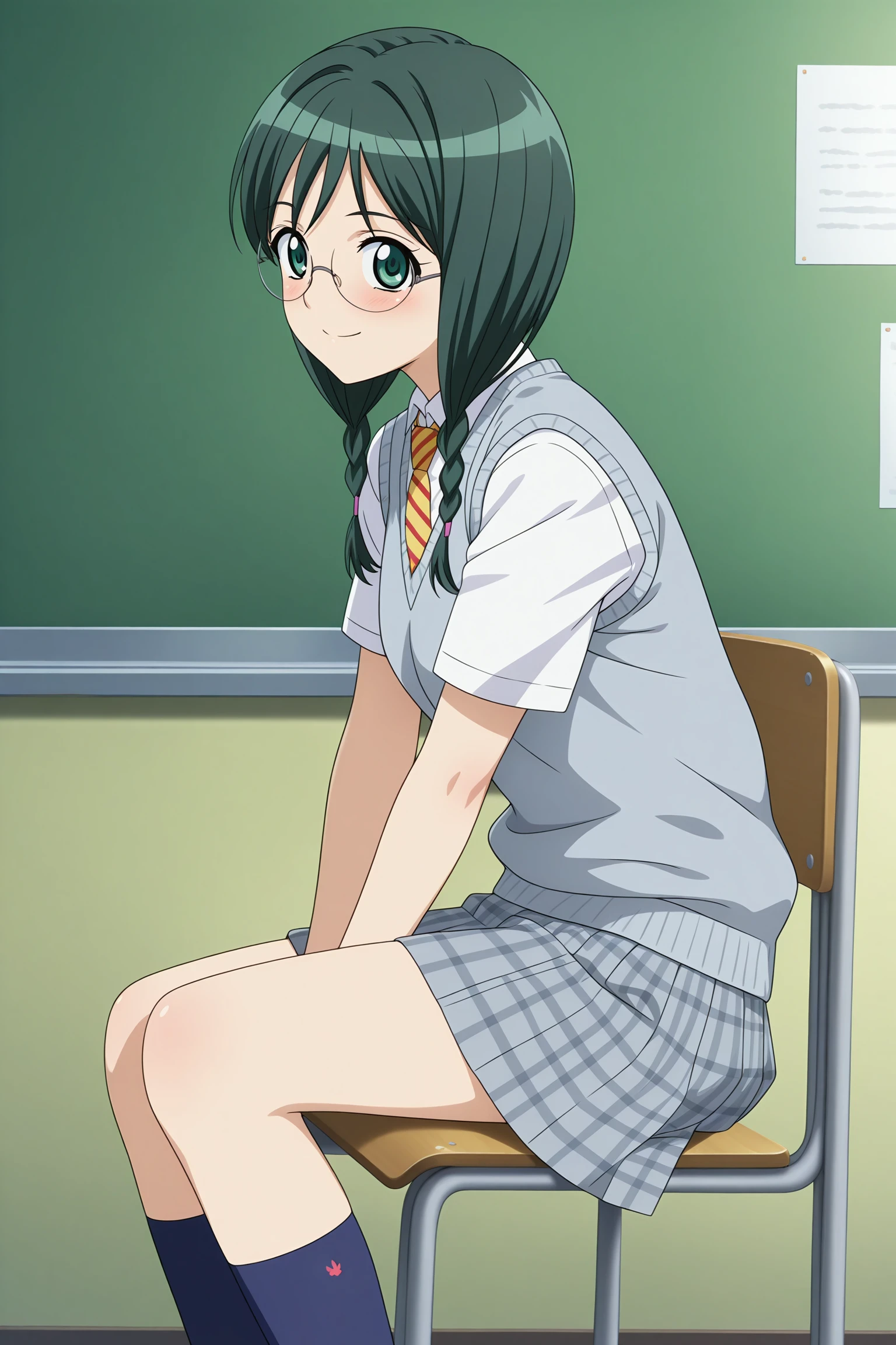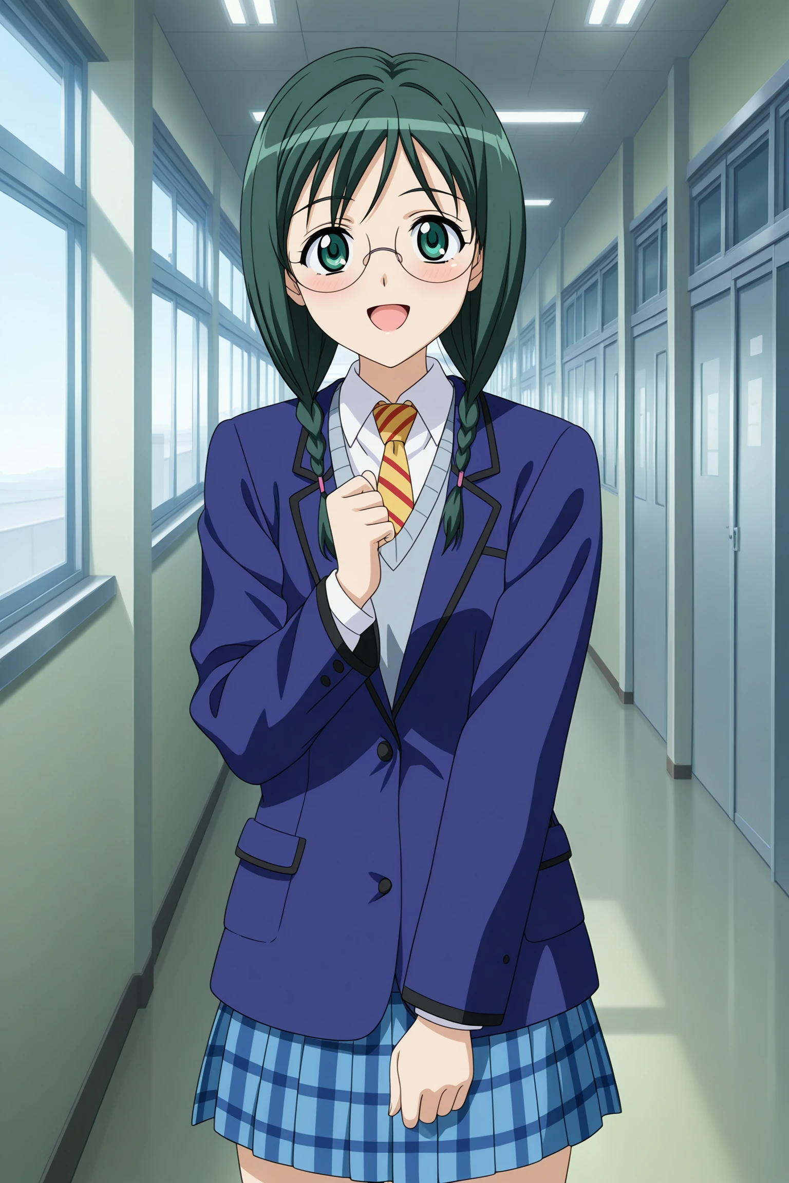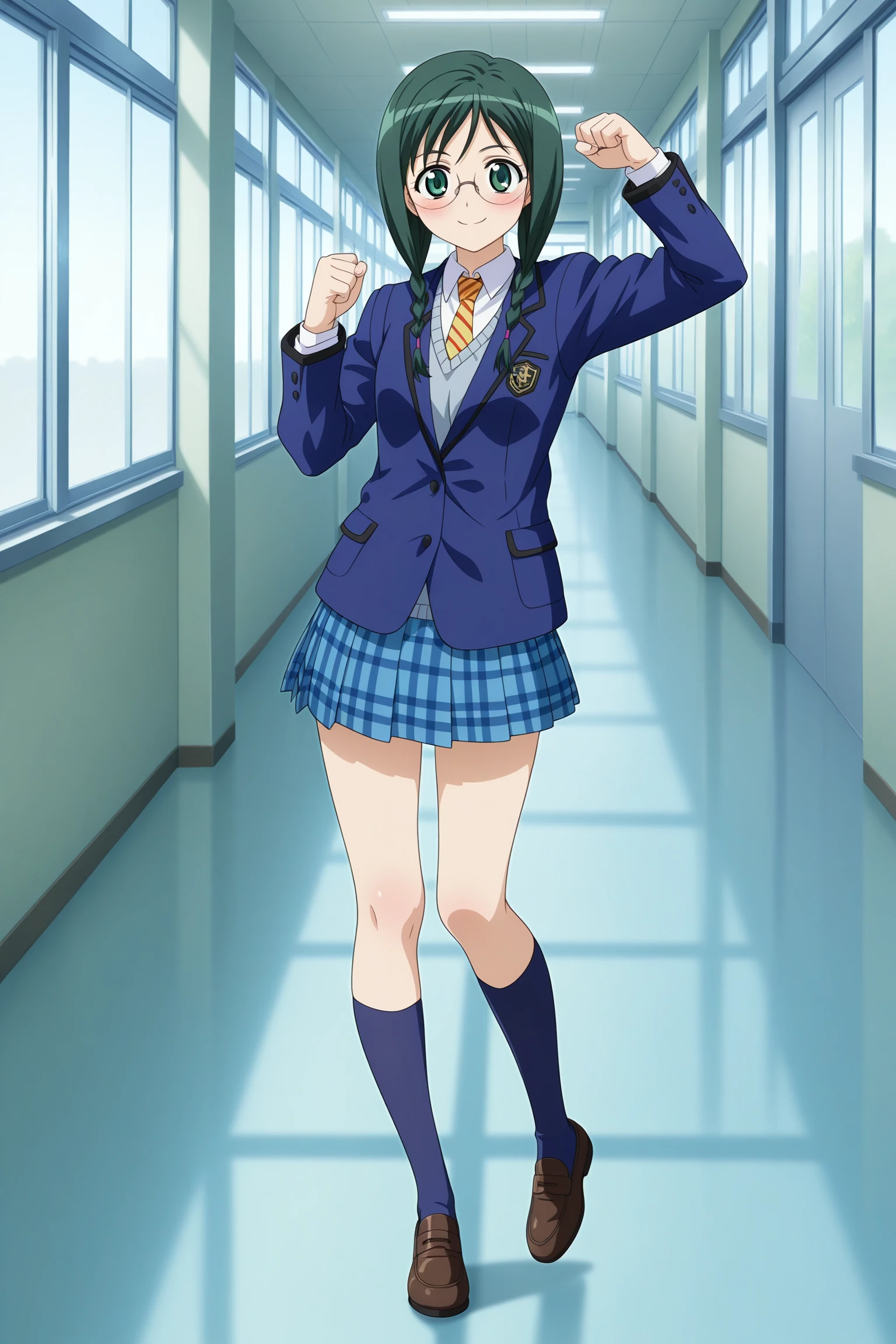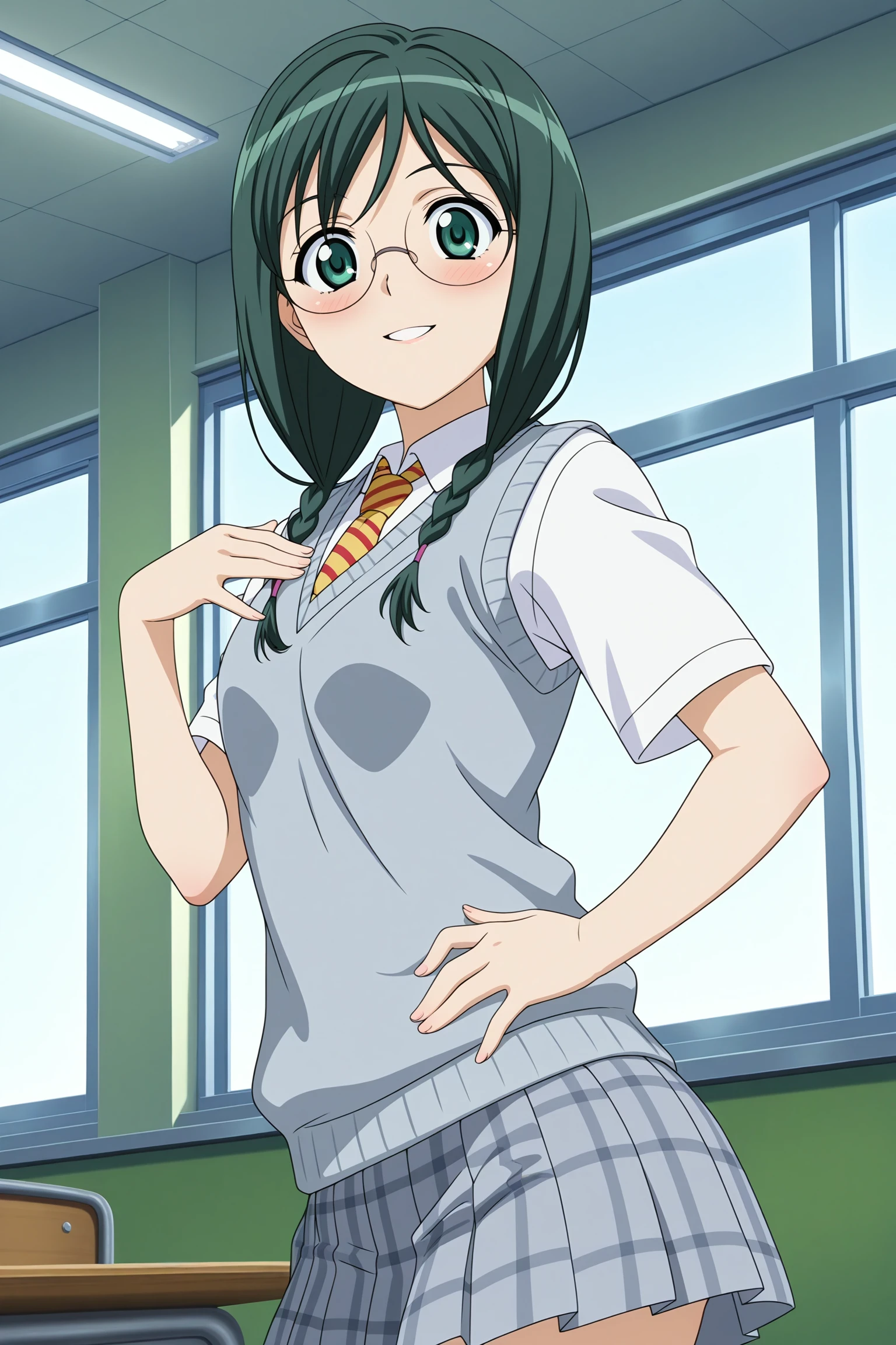 satou ayano, medium hair, green hair, low twin braids, hair tie, wispy bangs. green eyes, round eyewear, long sleeves, blue jacket, white shirt, collared shirt, grey sweater vest, yellow necktie, striped necktie, blue skirt, plaid skirt, pleated skirt, blue socks, kneehighs, brown footwear, loafersSchool Uniform (Summer)
