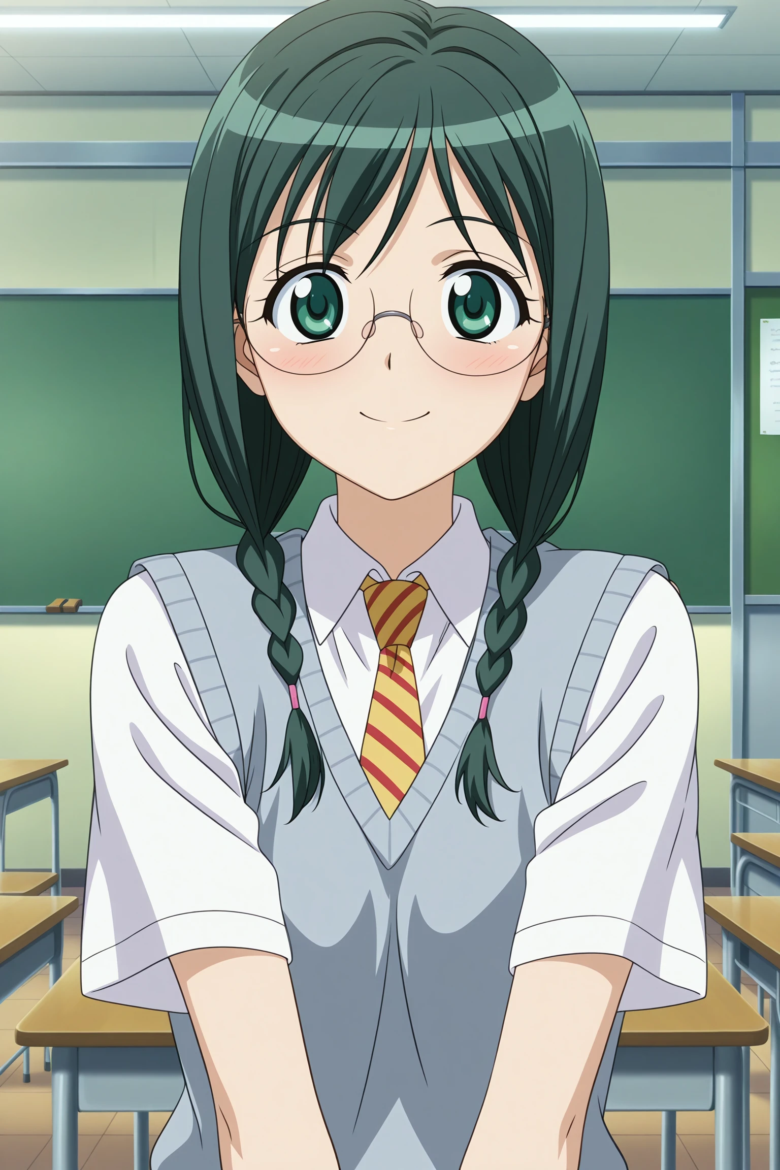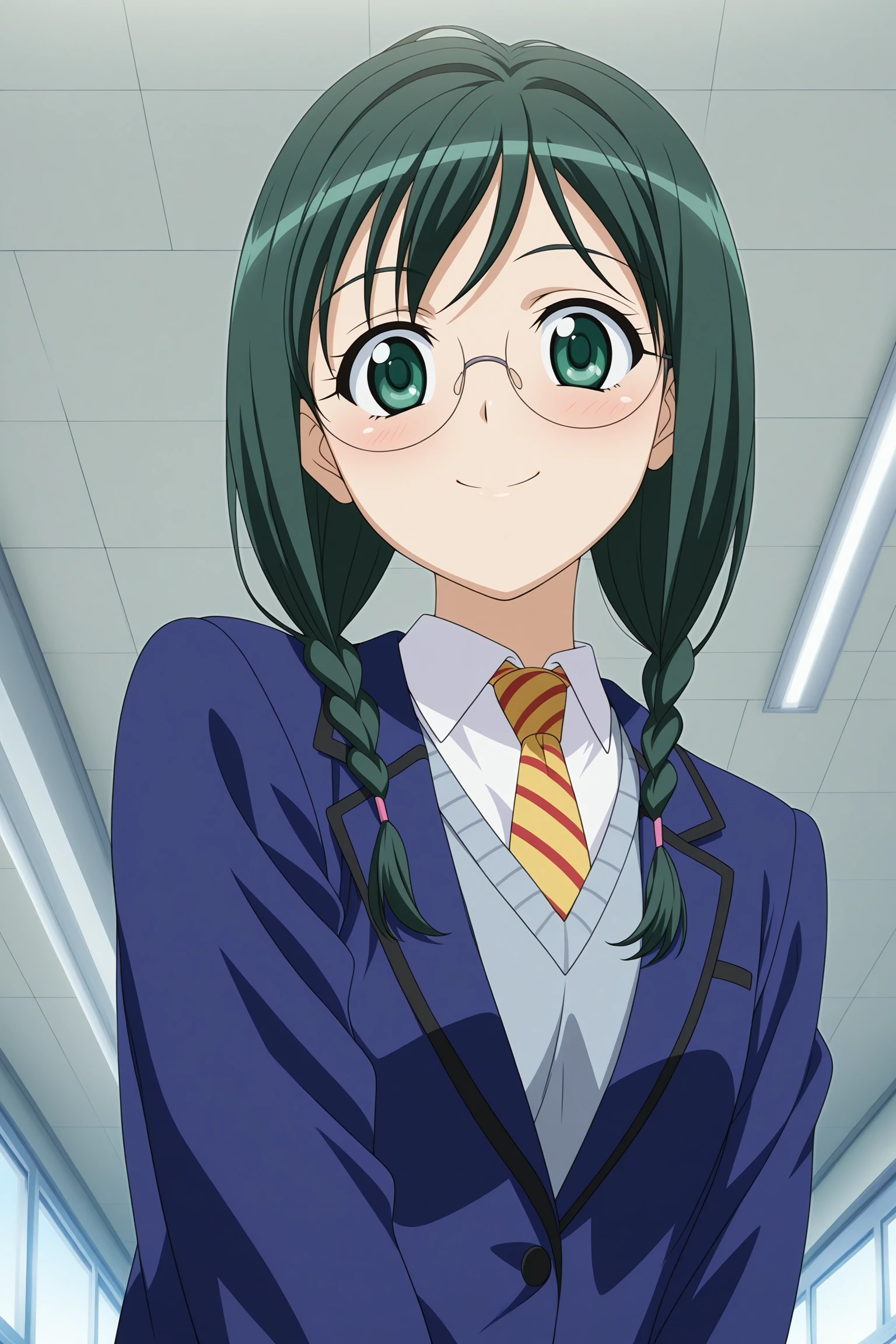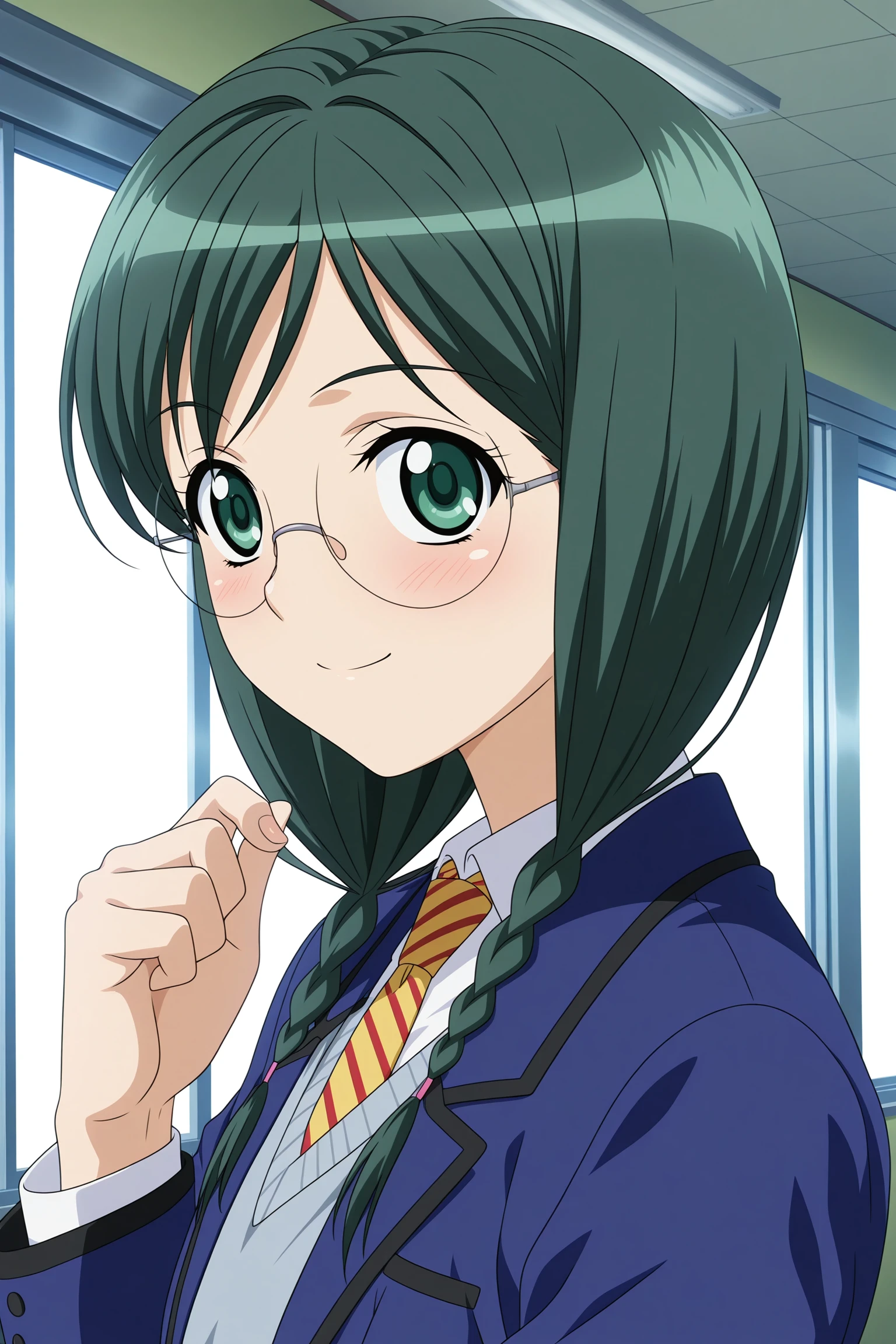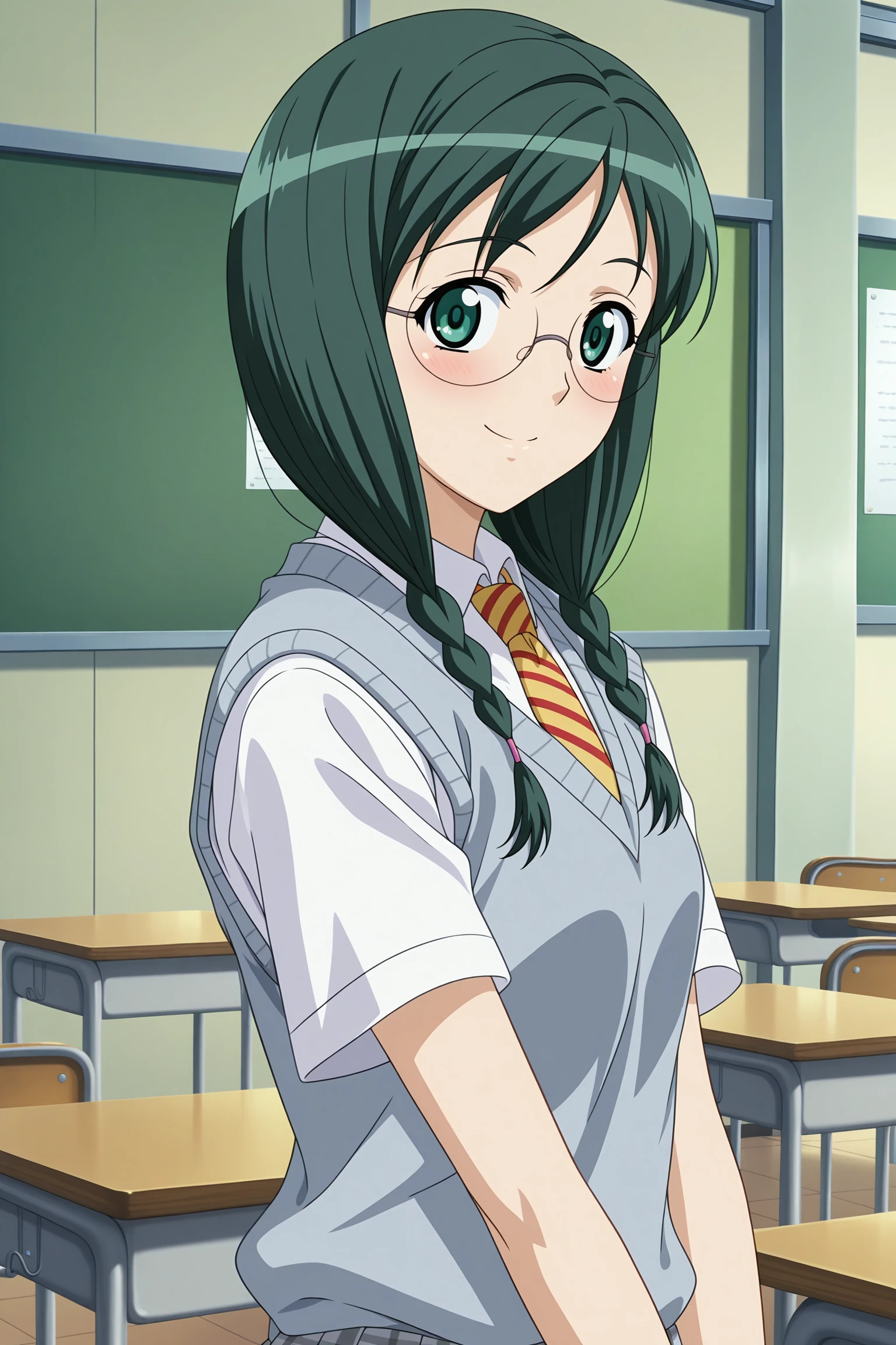 satou ayano, medium hair, green hair, low twin braids, hair tie, wispy bangs. green eyes, round eyewear, long sleeves, blue jacket, white shirt, collared shirt, grey sweater vest, yellow necktie, striped necktie, blue skirt, plaid skirt, pleated skirt, blue socks, kneehighs, brown footwear, loafersSchool Uniform (Summer)