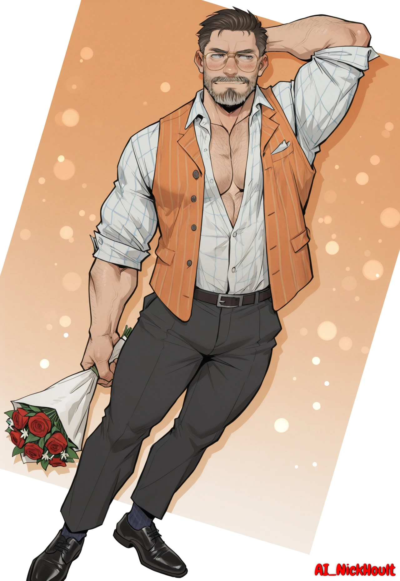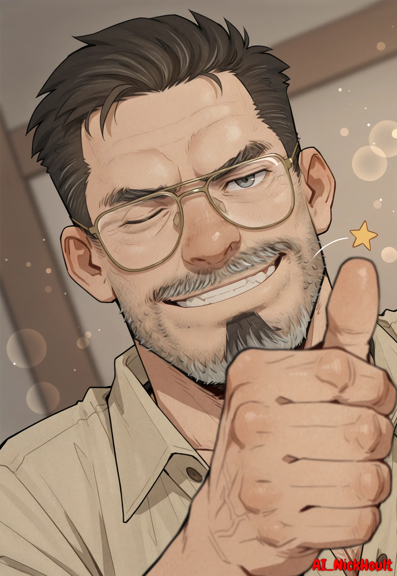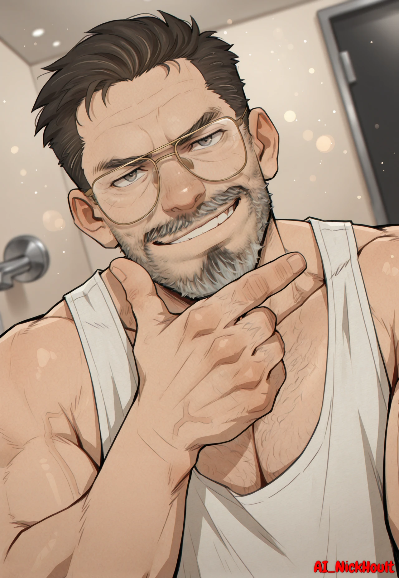 William, mature man, gray eyes, short hair, brown facial hair, graying facial hair, brown hair, Graying hair roots,