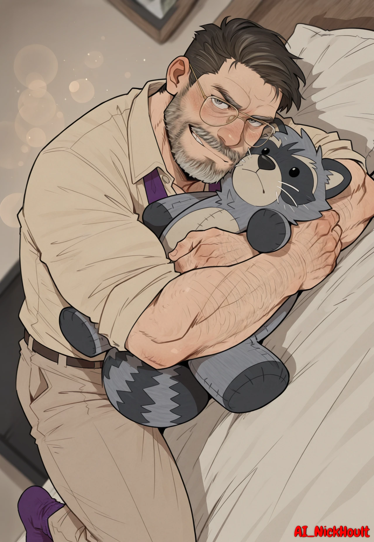 glasses, beige shirt, brown pants, purple tie, purple socks,